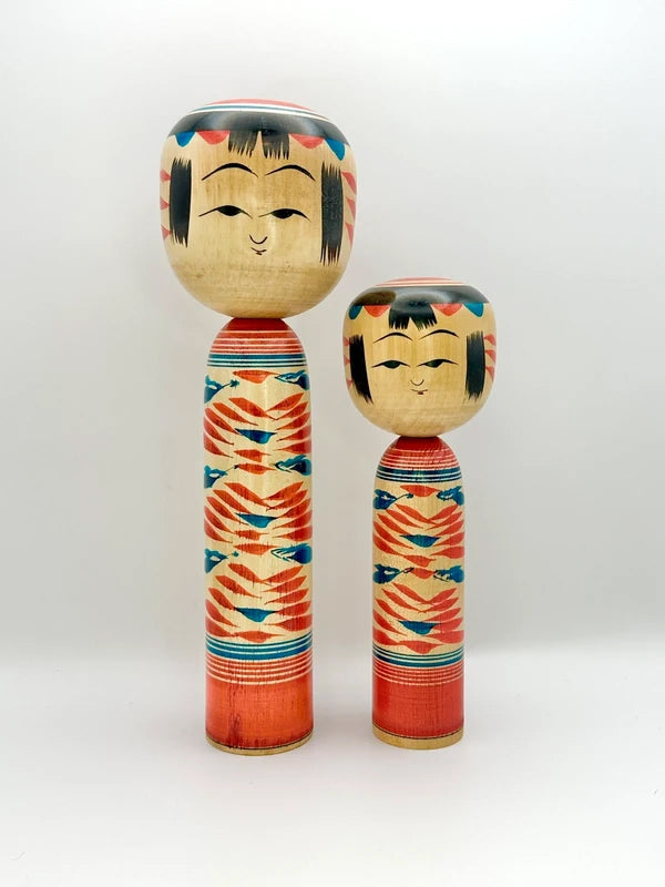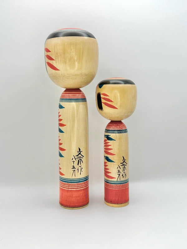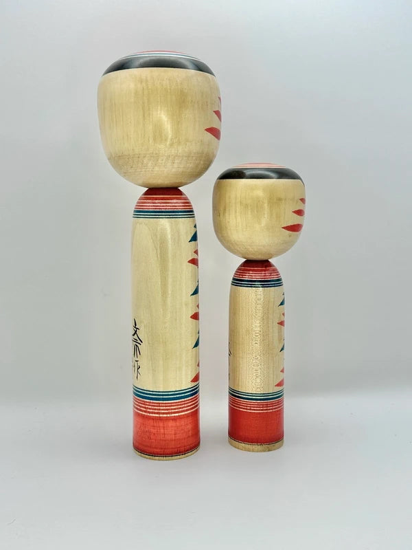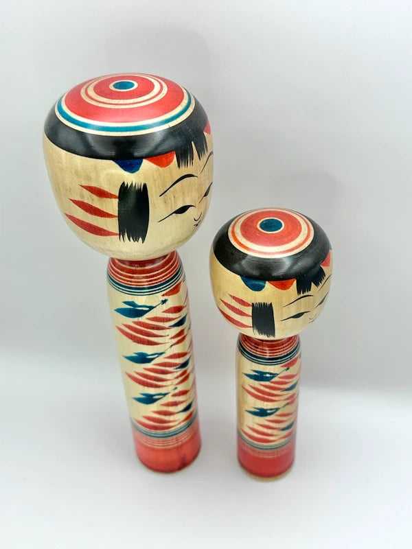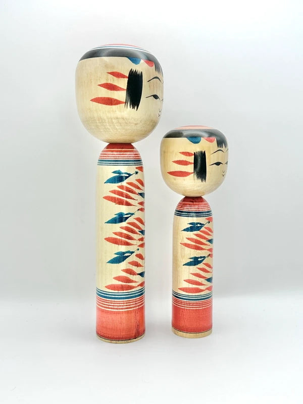 Kokeshi en très bon état, datant des années 1960. Bunichi Kamata, né le 28 août 1900, était le troisième fils de Kamata Usaku, marchand de soie à Shinmachi, ville de Shiroishi, préfecture de Miyagi. Apprenti résident et non rémunéré, il apprit principalement la fabrication de jouets et de poupées kokeshi. En 1920, après son examen de conscription, il travailla pendant environ un an à l'usine de bois Sanriku de Sendai avec Sakada Takashi, le frère cadet de Sakada Eiri, où il tourna le bois. En 1921 et 1922, il travailla comme artisan auprès de Sato Kannai et Dennai, artisans de Yajiro. Dimensions : 24 et 18 cm de haut.