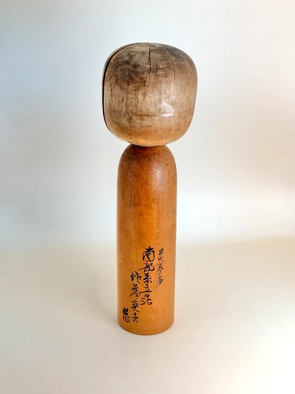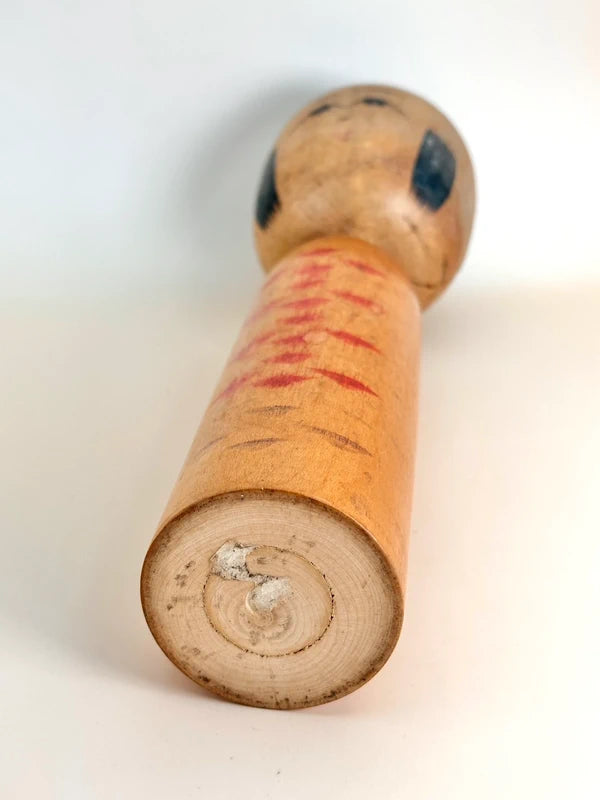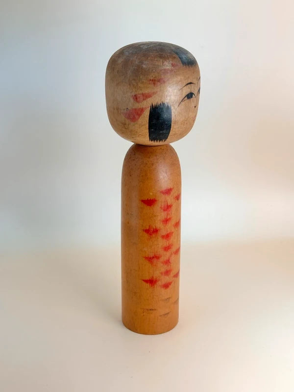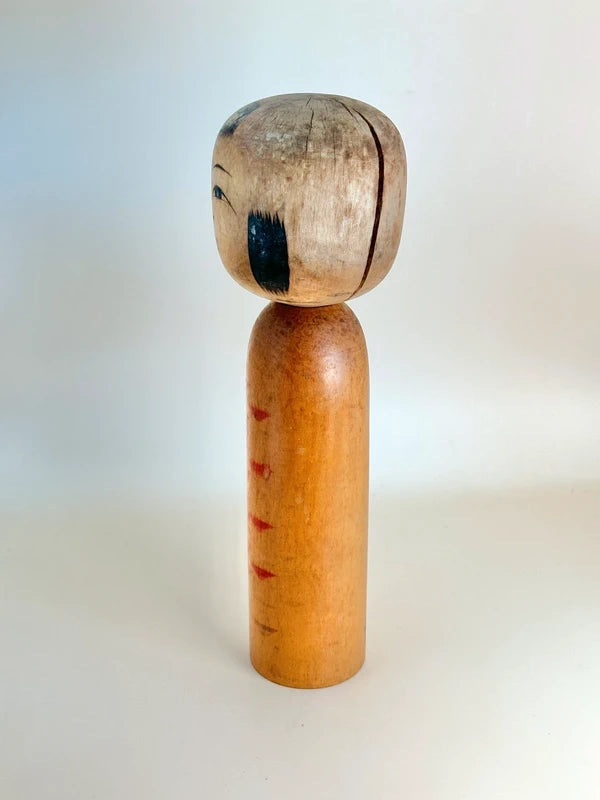 Une très ancienne kokeshi de style Nanbu d'Eikichi Sato est un bel exemple de l'artisanat traditionnel du nord du Tōhoku, reflétant une élégance discrète et une simplicité intemporelle. La poupée présente une tête ronde à l'expression douce et tendre, délicatement peinte à la main, avec une chevelure noire expressive et des sourcils arqués. Son corps est décoré d'une série de motifs floraux ou de plumes stylisés et symétriques, peints en pigment rouge, descendant verticalement selon un rythme équilibré, caractéristiques de la lignée Nanbu.