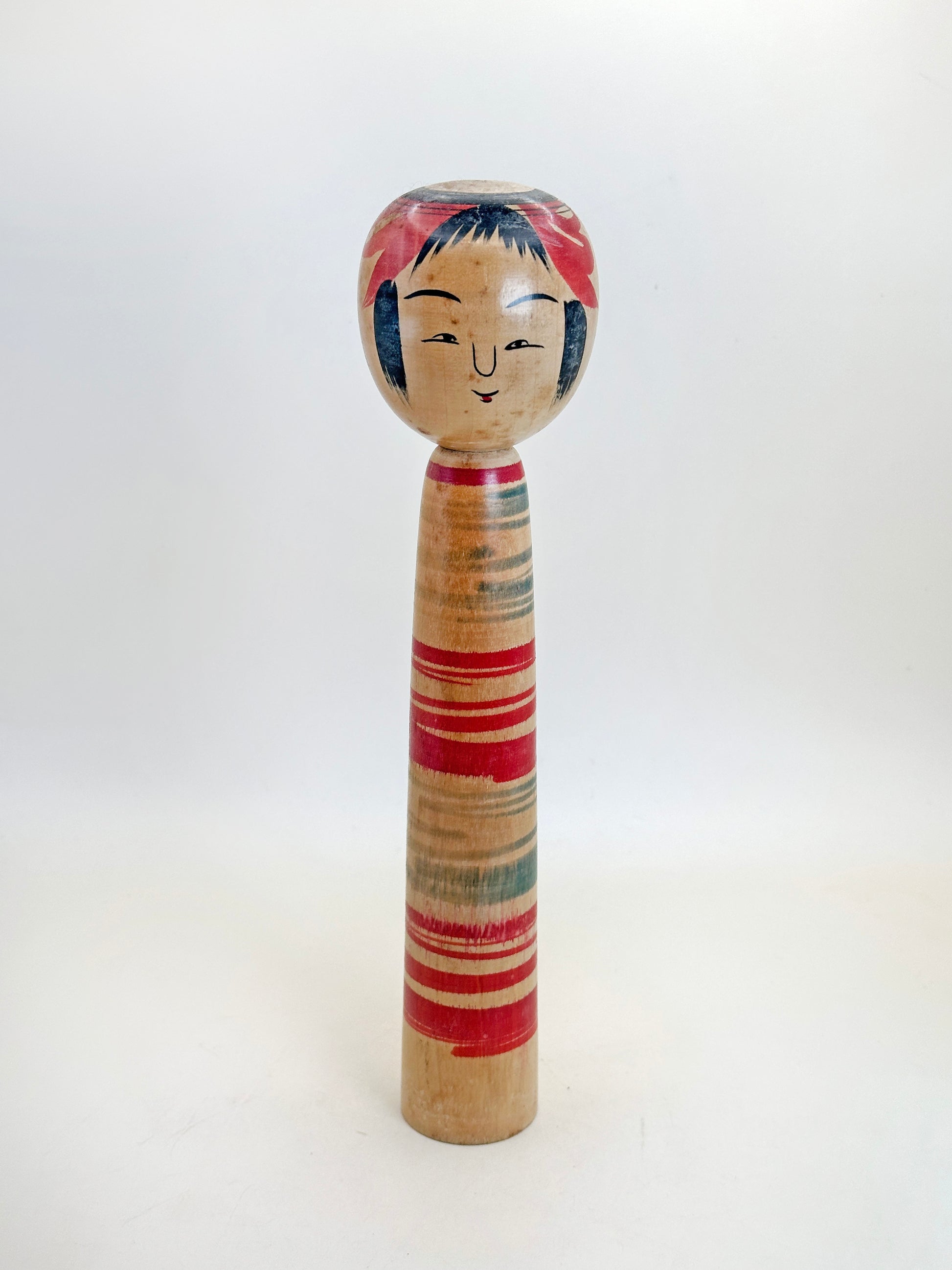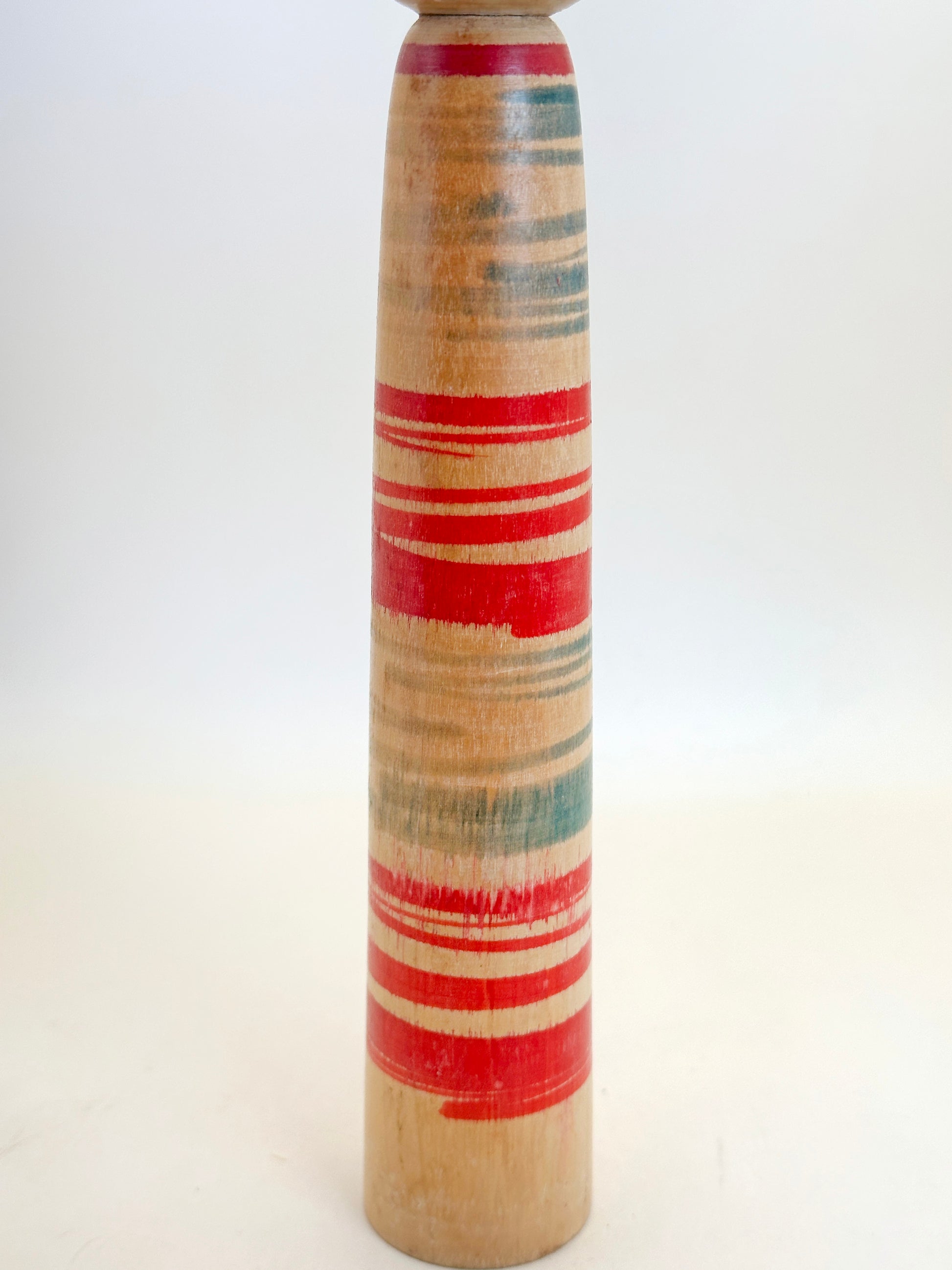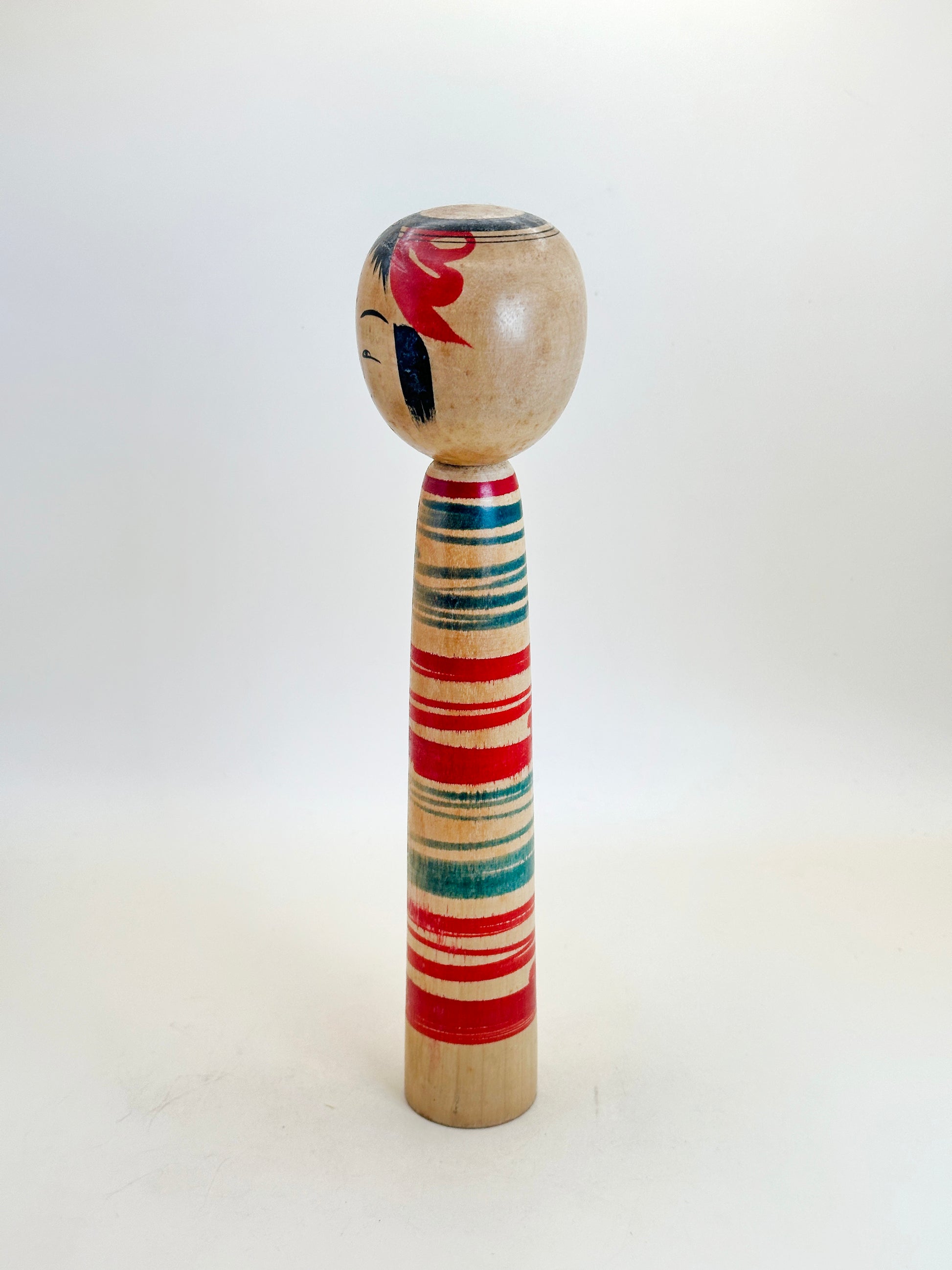 This kokeshi features the classic Tsuchiyu form with a slender, tapering body and a rounded head. The doll’s face is delicately hand-painted with soft, flowing lines, capturing the gentle and serene expression typical of the style. The body is adorned with boldly turned horizontal bands in rich red and green, showcasing Watanabe's confident brushwork and command of color.