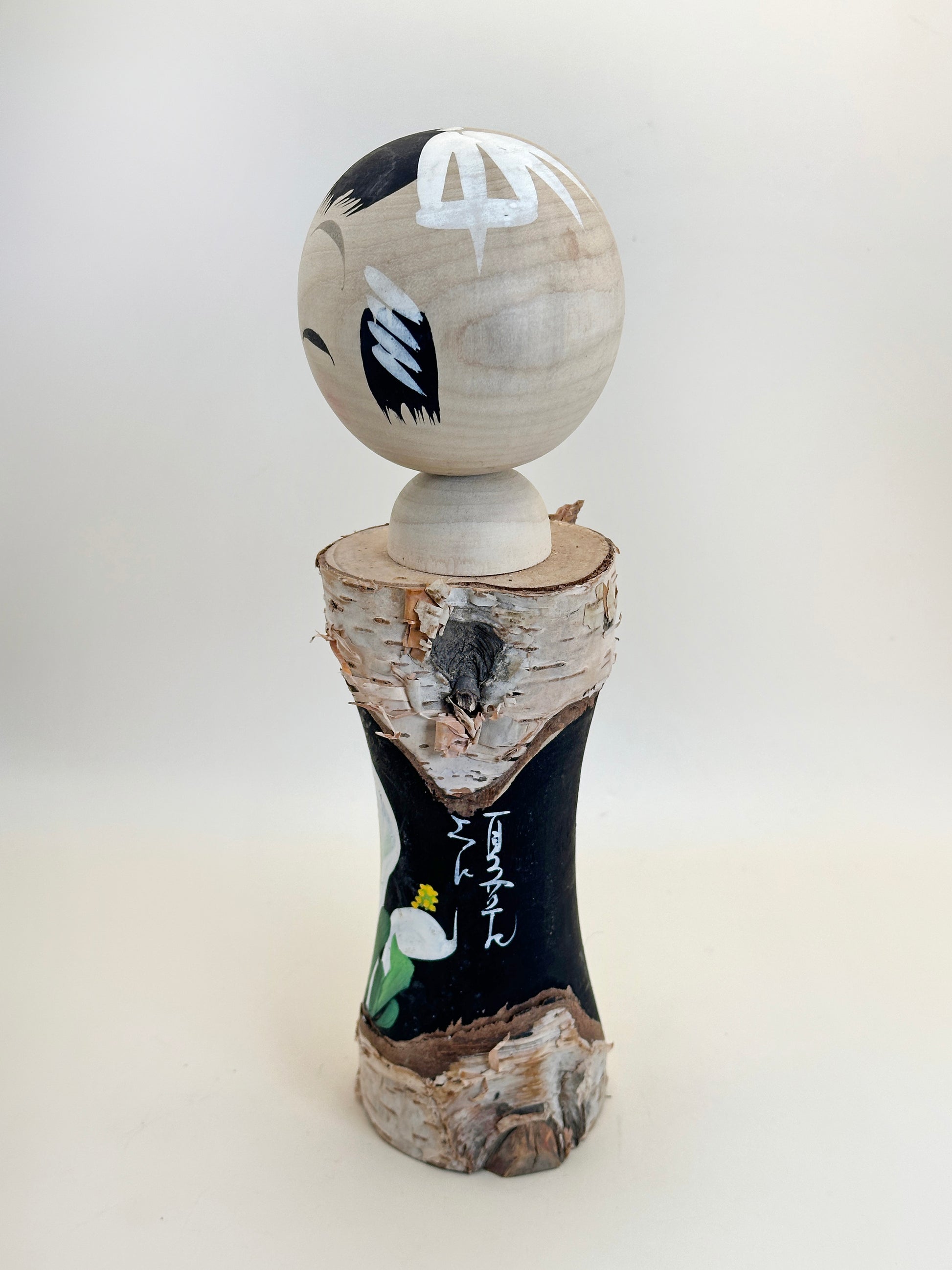 La kokeshi est fabriquée artisanalement en shirakaba (白樺), bois de bouleau blanc, un matériau prisé pour sa teinte claire qui s'accorde parfaitement avec l'esthétique naturelle de la poupée. Conservant son écorce, la kokeshi dégage une impression rustique et organique, évoquant la beauté brute des paysages d'Oze.
