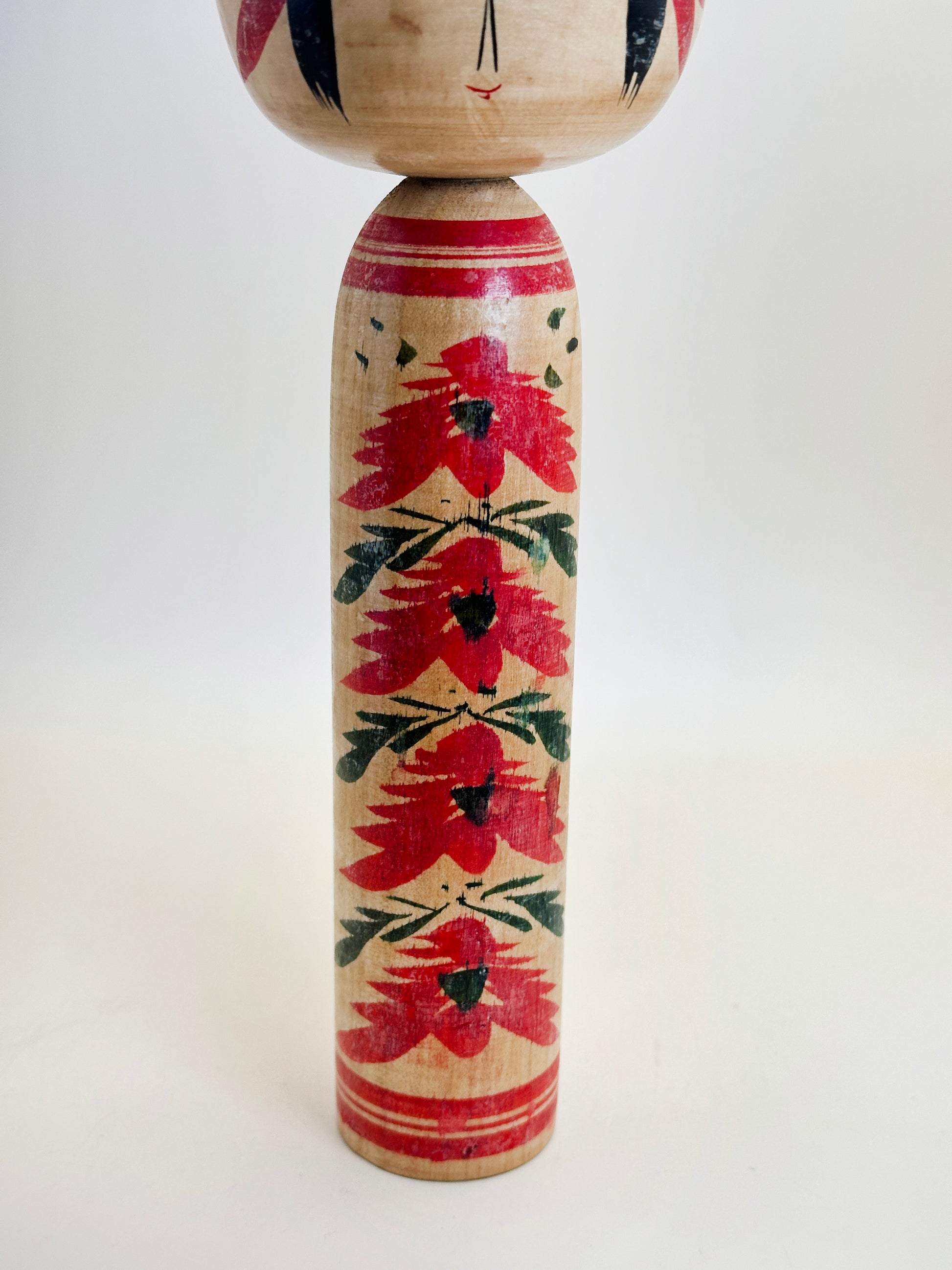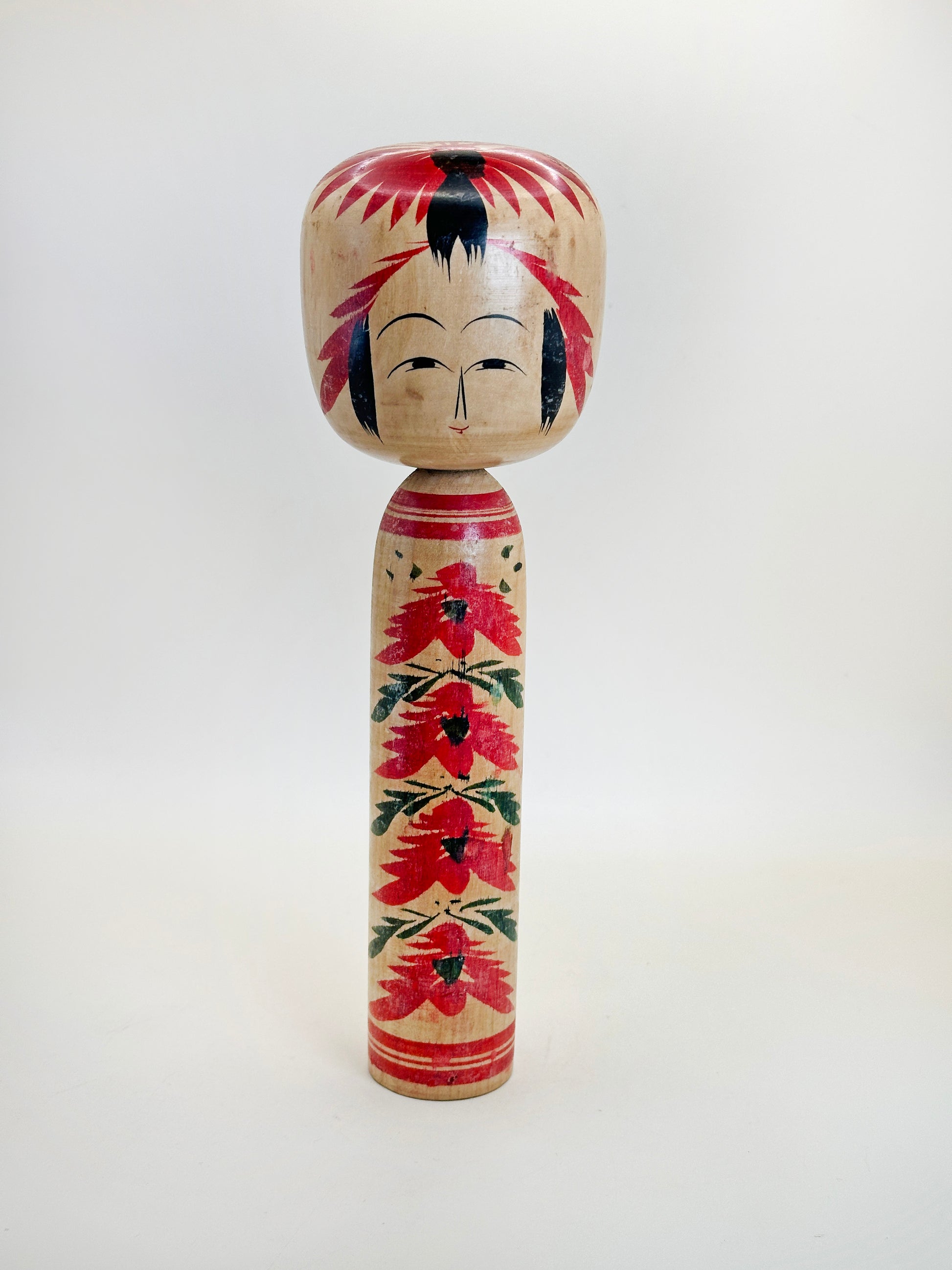 Cette kokeshi présente les éléments classiques de la tradition Togatta : un corps élancé orné de motifs floraux rouges audacieux, rehaussés de feuilles vertes, et une tête large aux traits délicats et symétriques, surmontée d’une couronne rouge et noire saisissante. La poupée témoigne de la maîtrise du coup de pinceau de Tomio et de son profond respect pour les formes traditionnelles, fruits de décennies de travail en solitaire.