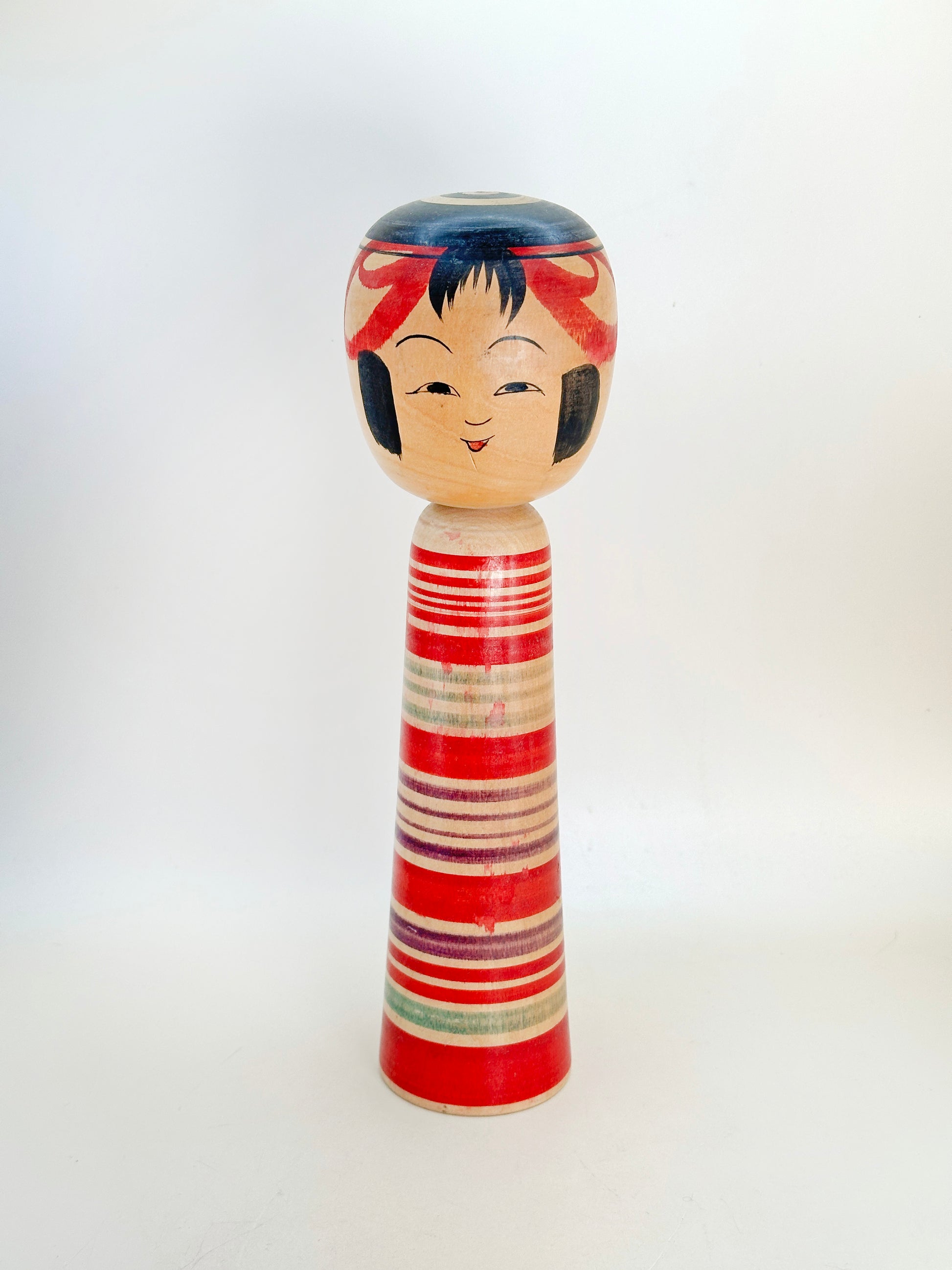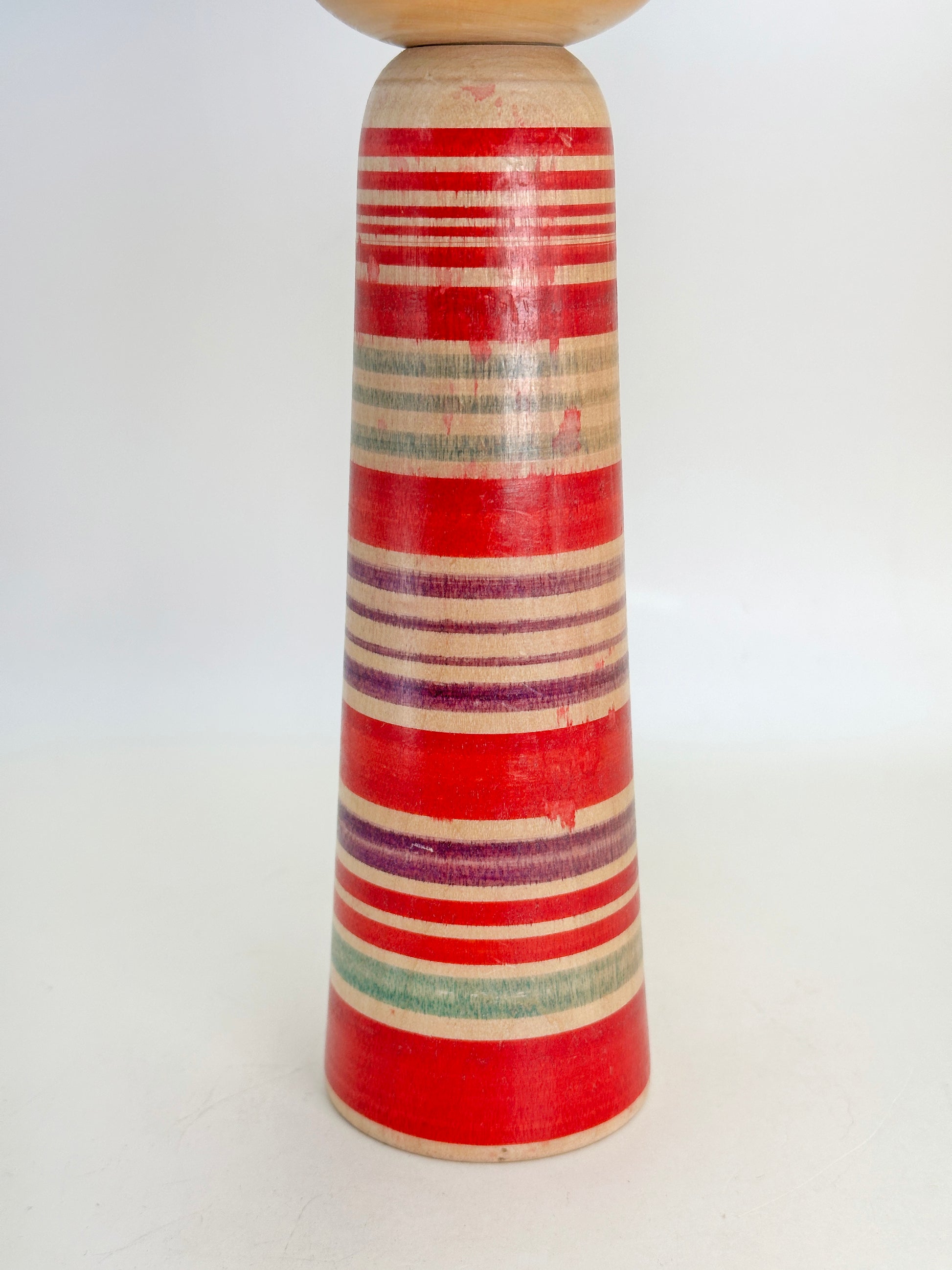 Shinichi Tokunaga trained under Kenichi Nishiyama, inheriting the signature traits of the Tsuchiyu lineage—elegant conical body shapes, cheerful facial expressions, and bold, colorful patterns. This particular doll showcases all those qualities beautifully: the face is delicately hand-painted with a sweet, slightly mischievous smile framed by classic red ribbon motifs and thick side hair. The body features vivid horizontal bands of red, green, and purple, rhythmically spaced over the tapered form—a hallmark of Tsuchiyu kokeshi aesthetics.
