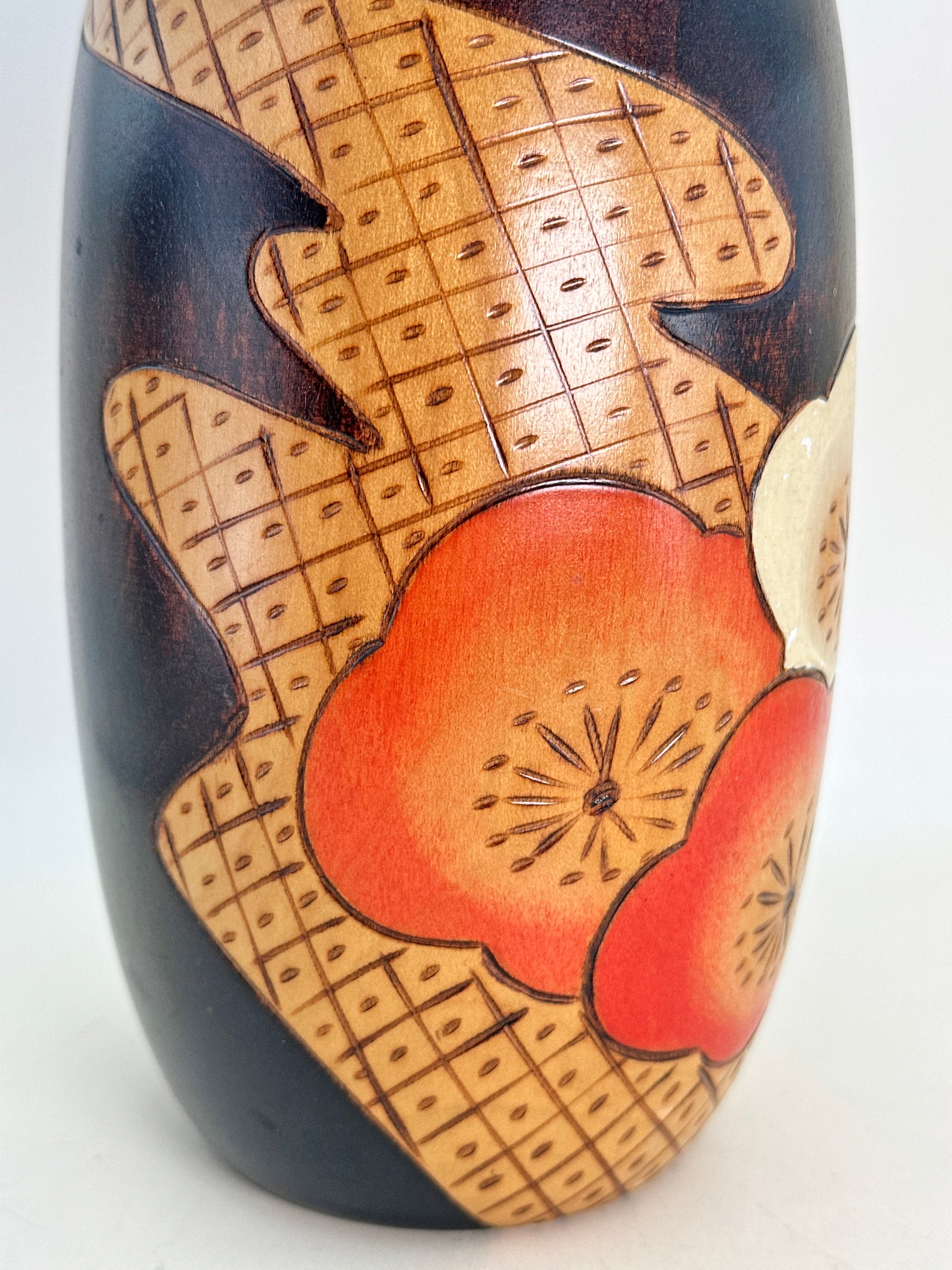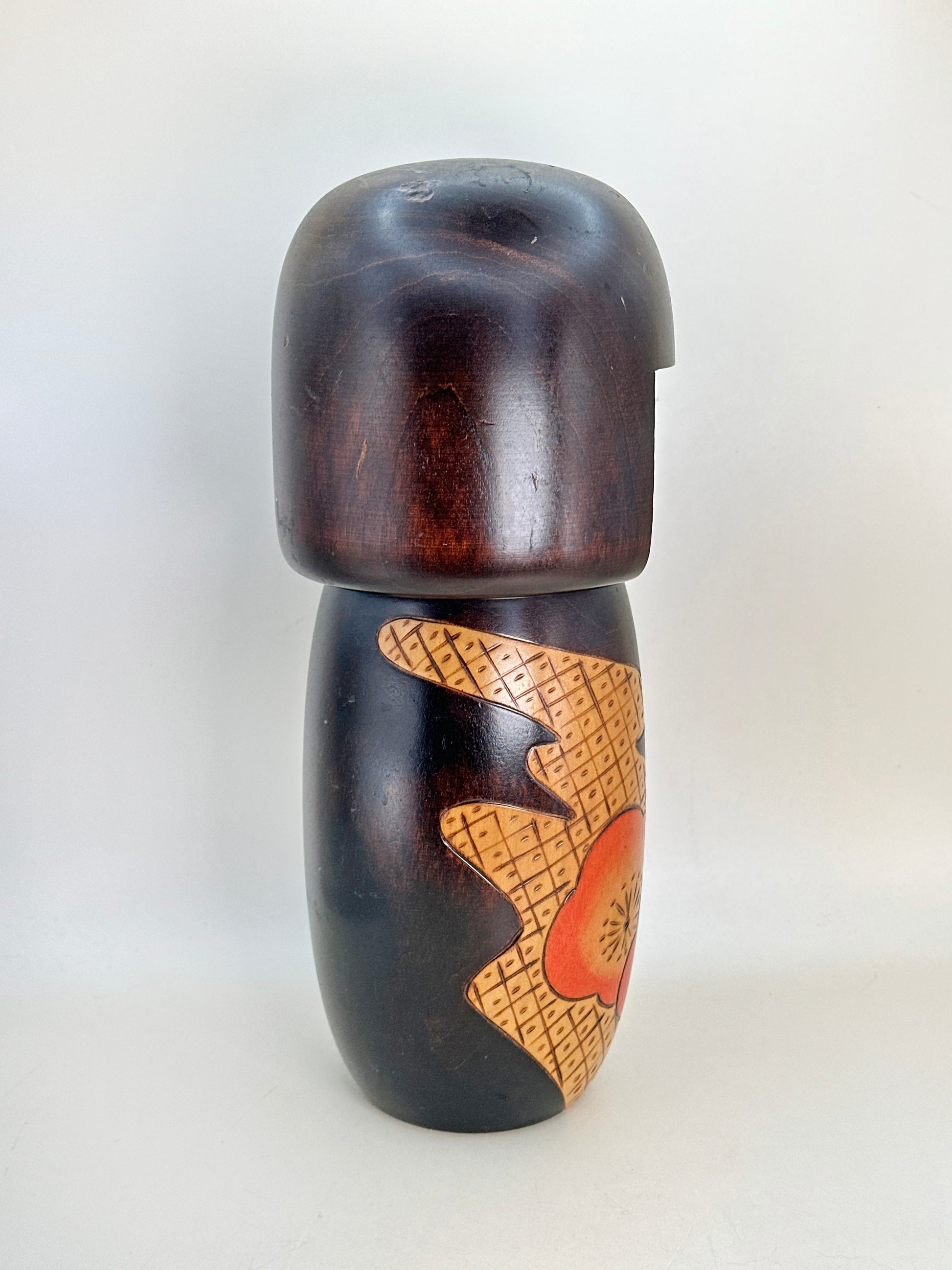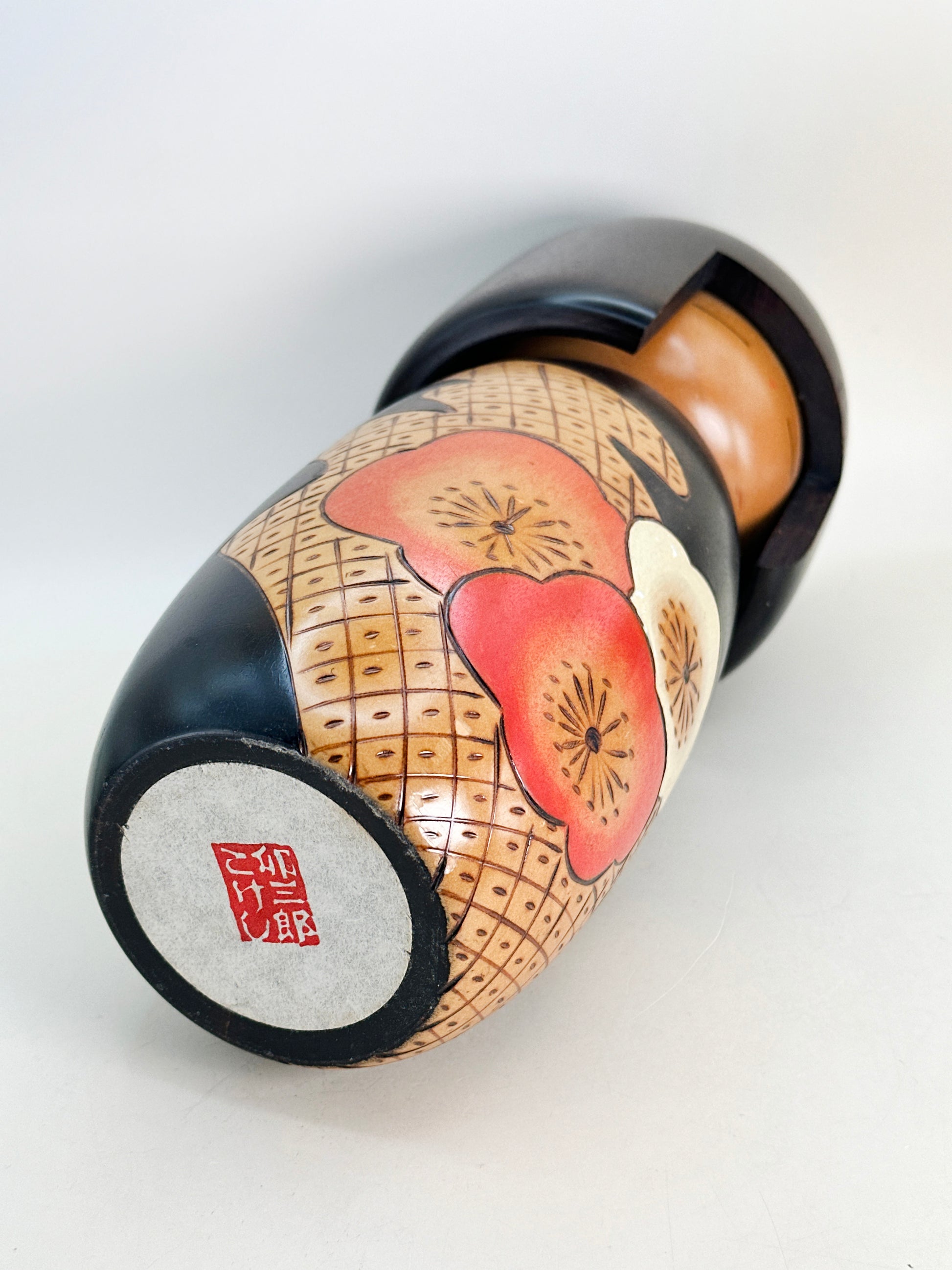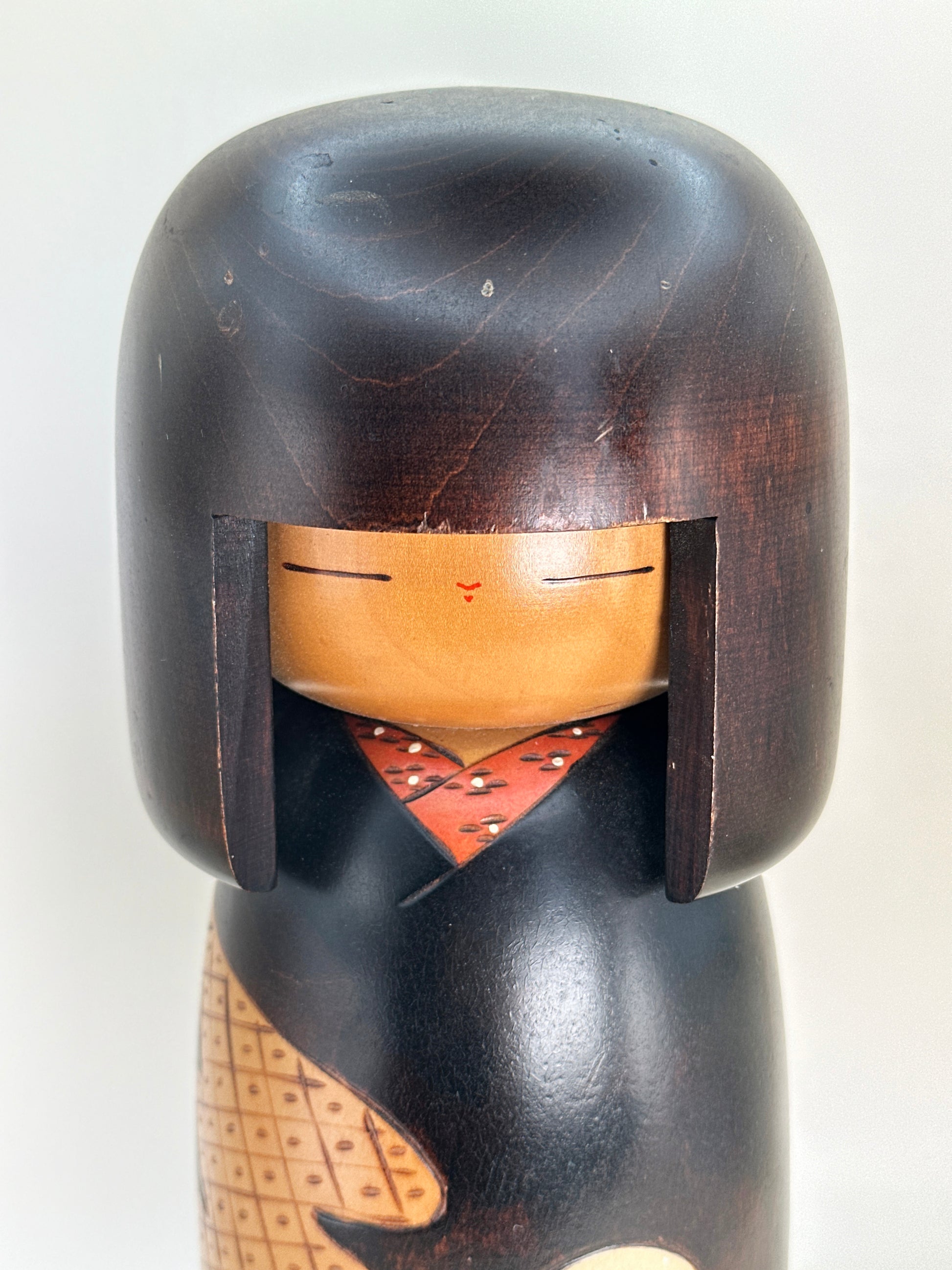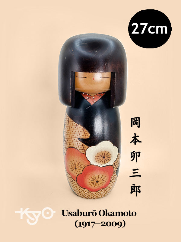 Notably, this design remains in continuous production by Okamoto’s descendants, a rare distinction that speaks to its enduring popularity and artistic significance. It stands as both a masterwork of mid-20th-century sōsaku kokeshi and a living legacy, connecting generations through form, symbolism, and craftsmanship.