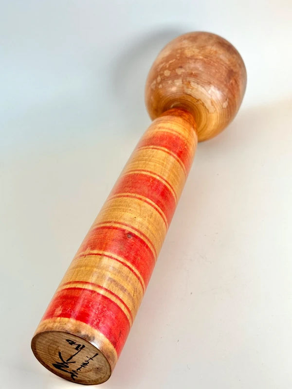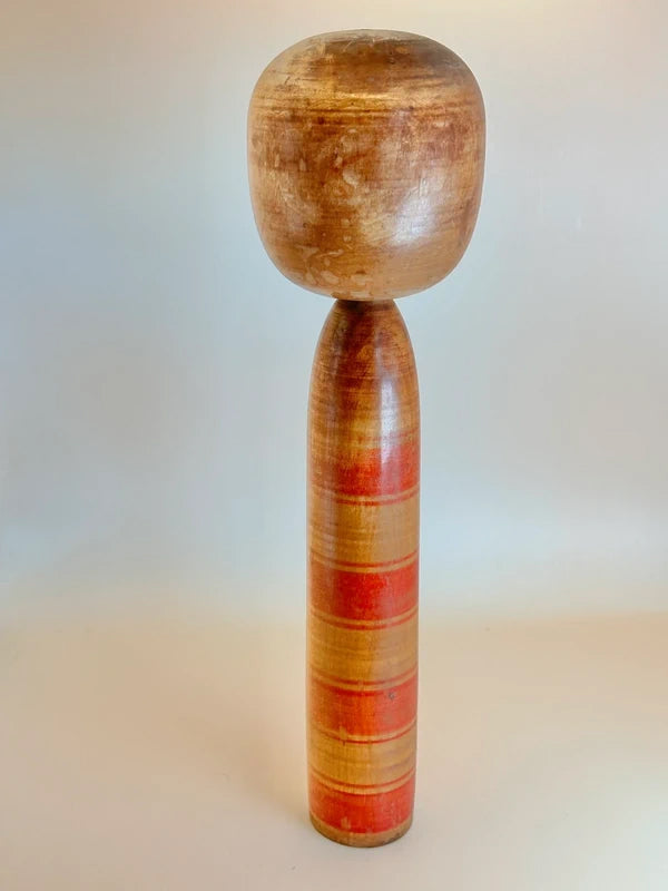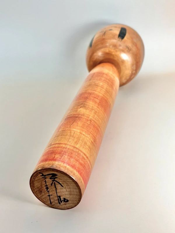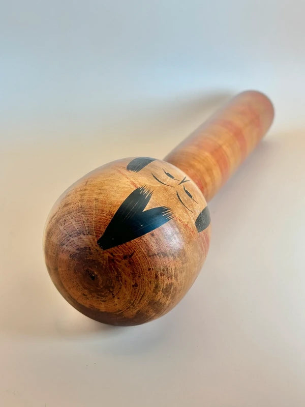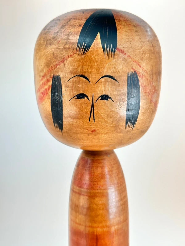 Une kokeshi de style Togatta, fabriquée dans les années 1940 par le maître artisan Bunsuke Sato, illustre l'élégance rustique du savoir-faire du début de l'ère Showa. Avec son corps cylindrique, ses subtiles marques de tournage et ses traits minimalistes, cette poupée dégage un fort sentiment de tradition et un caractère tranquille. Son expression est pensive, encadrée par des traits de cheveux audacieux et simplifiés, et le grain du bois est patiné par le temps, ajoutant à son charme vintage. Contrairement aux kokeshi plus récentes qui privilégient souvent les décorations vives, cette pièce incarne la modestie et la chaleur de l'art populaire fonctionnel. Elle est une représentation saisissante de la lignée Togatta à une époque où les kokeshi passaient du statut de souvenirs locaux à celui d'objets culturels de collection. Bunsuke Sato est né le 23 novembre 1901 à Aone Onsen, une région imprégnée de la tradition kokeshi. Fils de Bunkichi Sato, puis gendre de la famille Sato Shuemon, il était profondément ancré dans la lignée des kokeshi Togatta, tant par son héritage que par son mariage. Bunsuke a commencé à travailler au tour de potier dès son enfance, suivant une formation formelle auprès de son père et maîtrisant le tournage d'œuvres en bois complexes à la fin de son adolescence. Au début de sa carrière, il a travaillé à Ogi, Hanamaki et même Hokkaido, avant de retourner à Togatta pour fonder sa propre usine de menuiserie hydraulique en 1930. Il a encadré de futurs artisans de kokeshi et, avec Ushizo Sato, a contribué au renouveau des kokeshi de Togatta après la guerre, lors du deuxième boom des années 1940. Bien que connu pour être un homme discret et aux opinions tranchées, Bunsuke Sato était vénéré pour son esprit artisanal intransigeant et son profond respect du savoir-faire traditionnel. Il a continué à produire des kokeshi et des jouets en bois jusqu'à sa mort en 1977, laissant derrière lui un héritage précieux pour les collectionneurs et ses confrères. Dimensions : 8 x 8 x 30 cm