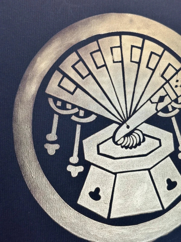 Entièrement réalisée à l'encre dorée métallisée, la composition s'inspire des kamon traditionnels (blasons familiaux japonais), mais adopte ici une forme plus expressive et ornementale. Le kanji en bas indique 十河家 (Sogō-ke), en référence à la famille Sogō, un nom dont les racines historiques remontent à la lignée des samouraïs et au Japon féodal. Ce motif rare de l'héraldique japonaise est souvent associé à la dignité, à la protection et à la beauté, tandis que son design symétrique et sa palette noir et or évoquent le raffinement et la révérence. Cette pièce constituerait un objet de collection unique ou un élément décoratif pour les amateurs d'esthétique japonaise, d'emblèmes familiaux ou de blasons de noblesse.
