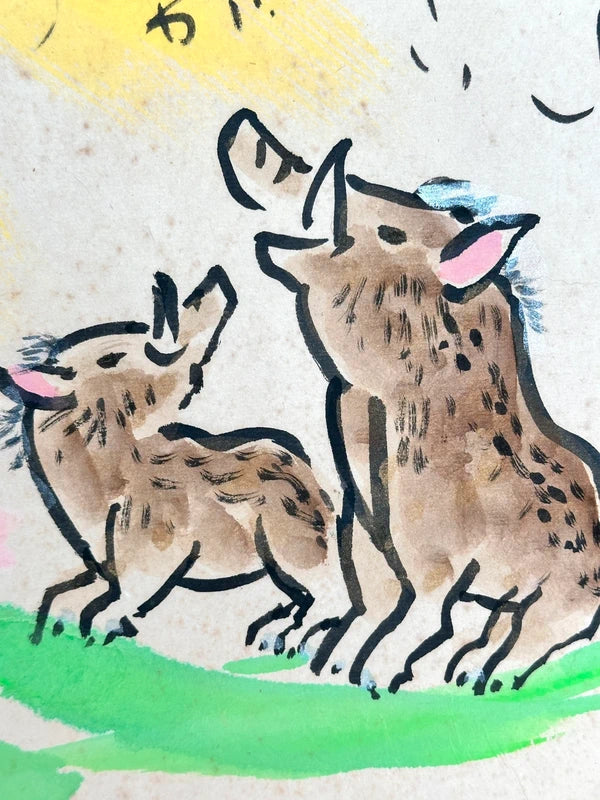 Une carte shikishi japonaise capture l'esprit joyeux de l'Année du Sanglier (2007) avec une peinture à l'encre et à l'aquarelle chaleureuse et ludique représentant deux sangliers, une mère et son porcelet, se prélassant joyeusement sur une colline verdoyante. Des fleurs roses flottent autour d'eux, et les joyeuses teintes jaunes en arrière-plan renforcent le sentiment d'optimisme et de vitalité.