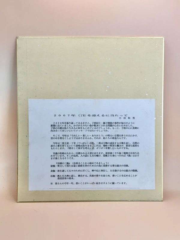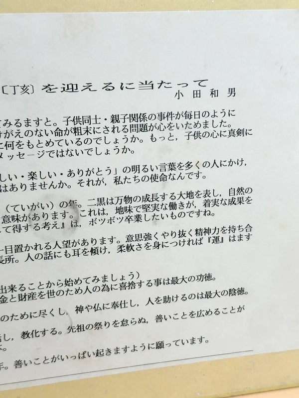 Ces mots simples mais puissants expriment un esprit de gratitude et de joie, s'harmonisant parfaitement avec l'image réconfortante de deux sangliers joyeux. Cette expression capture l'essence même de l'appréciation du bonheur quotidien, un élément important des valeurs culturelles japonaises, notamment à l'approche du Nouvel An. Au dos du tableau figure un message imprimé daté de 2007 (丁亥 / Hinoto-i), année du Sanglier de Feu dans le cycle zodiacal japonais traditionnel. Écrit par 小田 福男 (Oda Fukuo), ce message invite à réfléchir à l'année écoulée et à accueillir la nouvelle avec détermination, attention et compassion, notamment pour l'avenir des enfants et l'esprit humain au sens large.