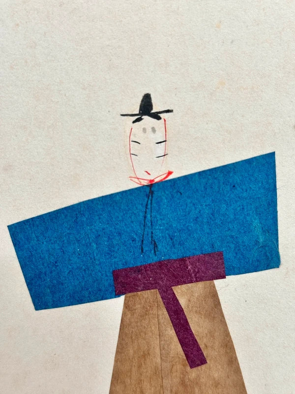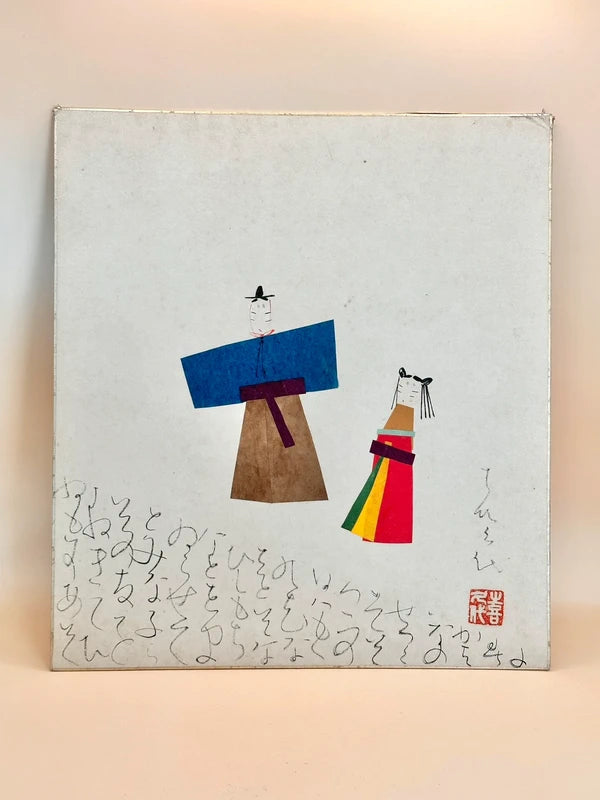 Une carte shikishi vintage présente une représentation minimaliste mais élégante en chigiri-e (collage de papier déchiré à la main) des poupées traditionnelles Hina Ningyō (雛人形), ou Hina, qui sont au cœur du Hinamatsuri du Japon, ou festival de la Journée des filles, célébré le 3 mars.