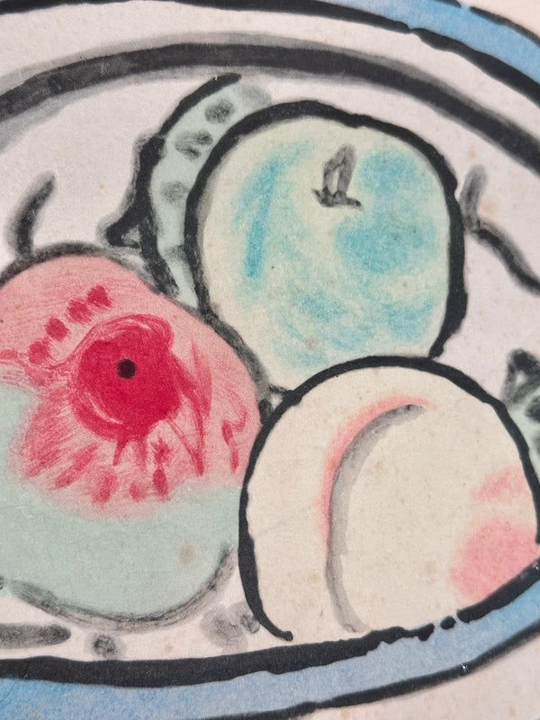 Cette charmante carte imprimée shikishi présente une nature morte de fruits dans un bol, réalisée dans le style signature de Mushanokoji Saneatsu, alliant simplicité, chaleur et optimisme. L'œuvre représente une pêche et d'autres fruits de saison avec des coups de pinceau expressifs mais minimalistes. L'inscription supérieure indique 「和楽」 (Waraku), signifiant « paix et joie », faisant écho à la défense par l'artiste, tout au long de sa vie, des idéaux humanistes et de l'harmonie intérieure.