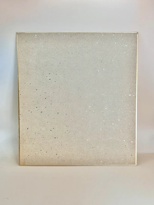 Ce shikishi japonais vintage (色紙) présente une délicate représentation à l'aquarelle d'une pagode à cinq étages (五重塔), symbole classique de l'architecture des temples japonais. L'artiste utilise des coups de pinceau doux et fluides et une palette pastel douce pour représenter la pagode dans une atmosphère onirique, entourée de touches abstraites d'arbres et du parc du temple.