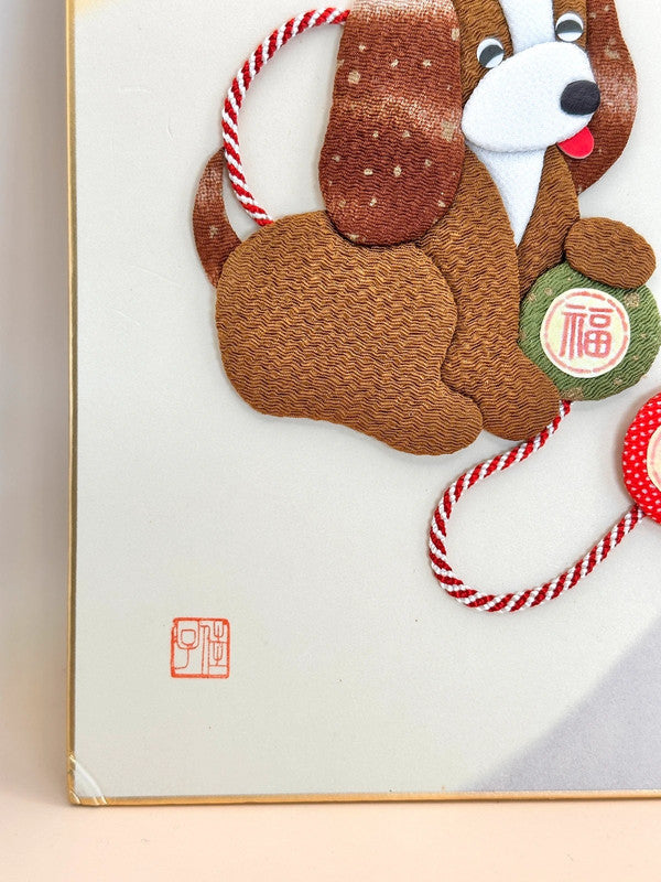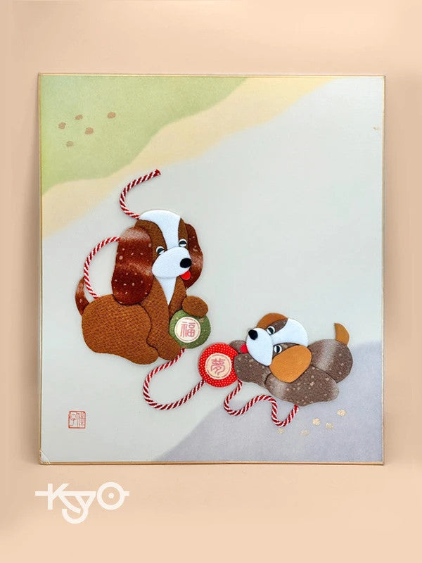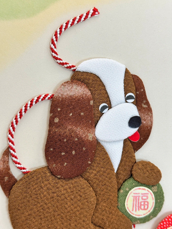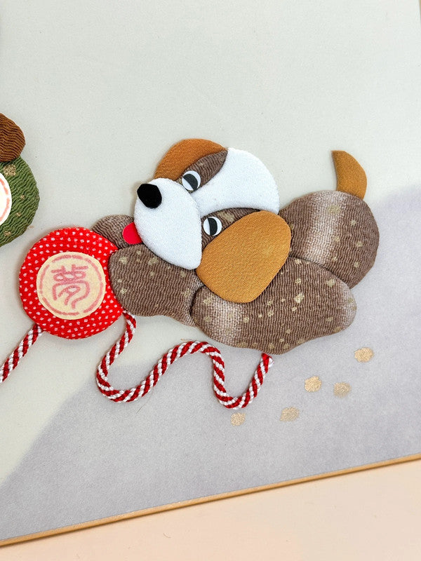 The two playful pups are made using a collage-style technique, with each part of their bodies carefully cut from richly textured and patterned Nishijin silk. Their floppy ears, warm expressions, and whimsical postures evoke a sense of joy and companionship. They are connected by a red and white mizuhiki cord, playing with a ball — one inscribed with 福 (Good fortune), and the other with 夢 (Dream).