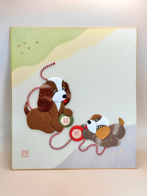 A vintage shikishi art card features an adorable scene of two dogs crafted from fine Nishijin-ori (西陣織) fabric, a traditional textile from Kyoto renowned for its luxurious textures and intricate patterns.