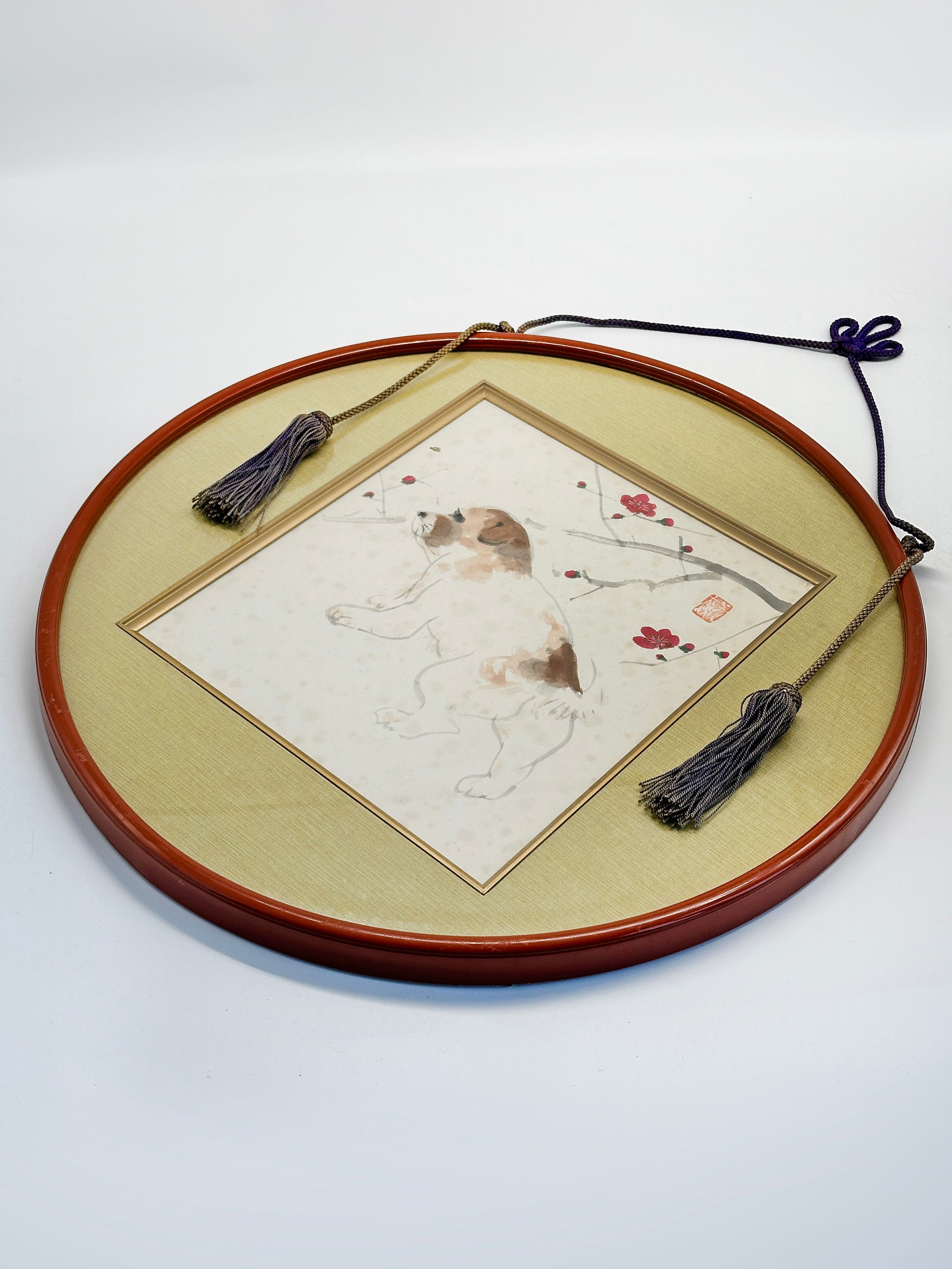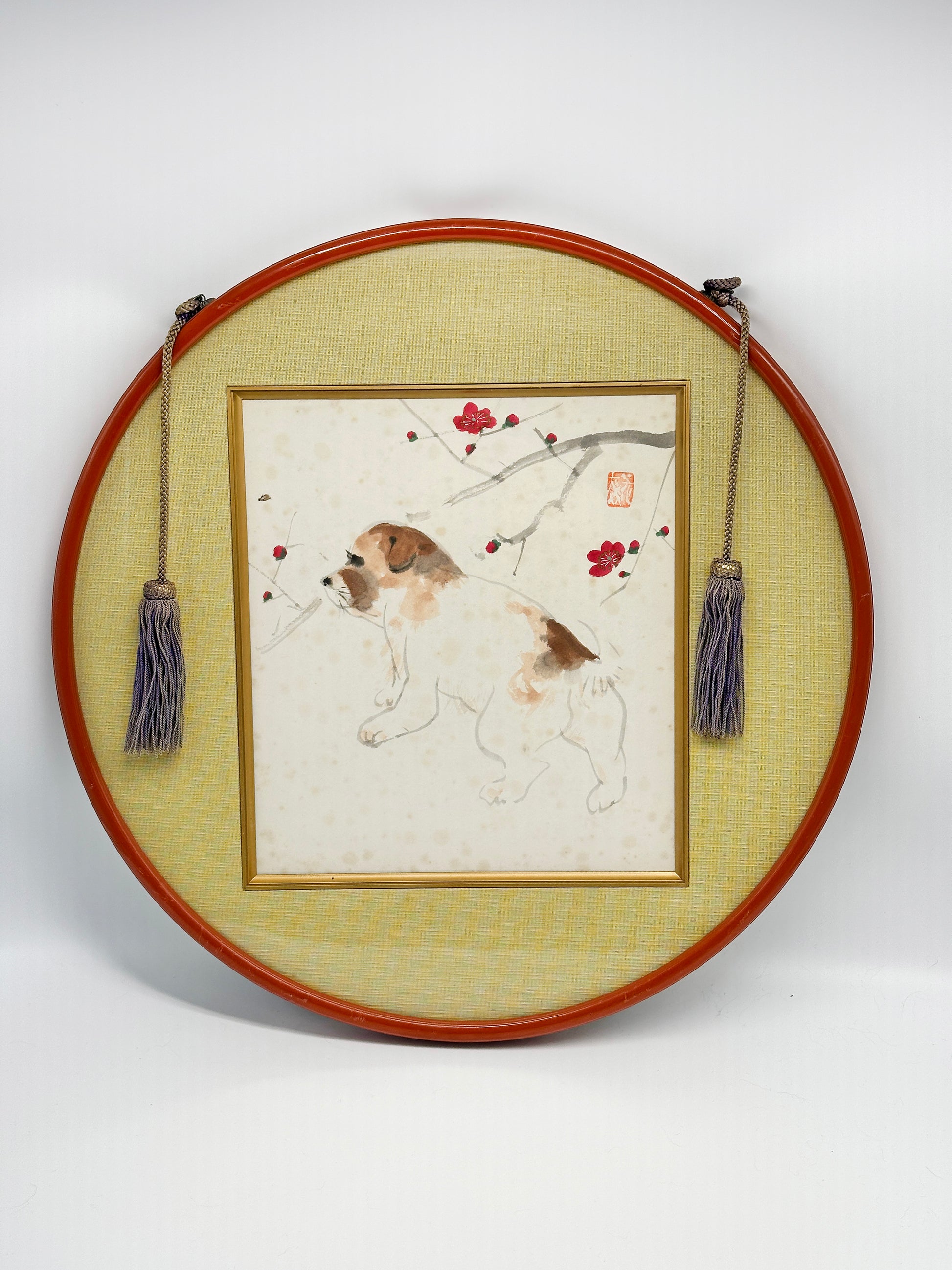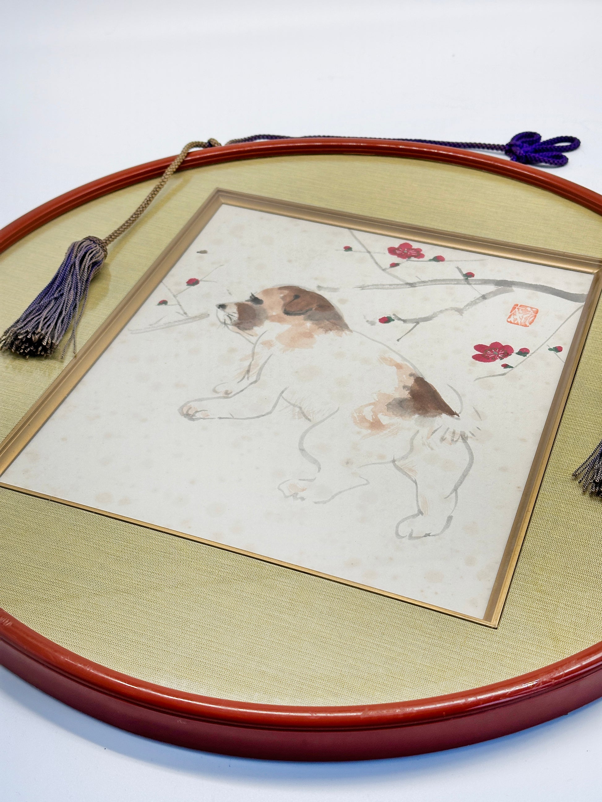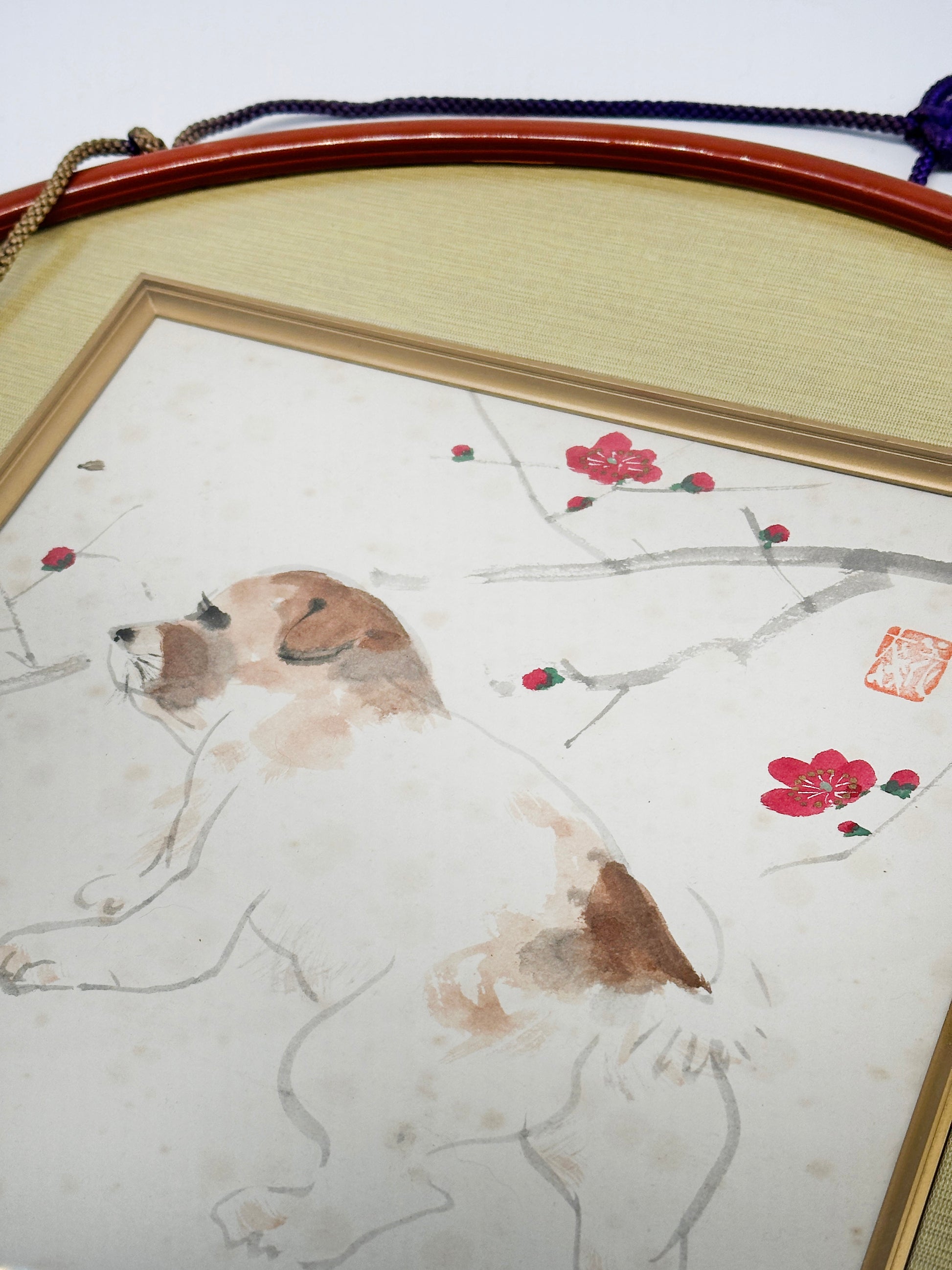 At the heart of the frame rests a charming shikishi painting depicting a dog beneath blooming plum blossoms (梅). Rendered in delicate, flowing brushstrokes, the dog appears gentle and alert, its soft brown and white fur captured in a warm, understated palette typical of Nihonga-style animal paintings. Above it, branches of red plum blossoms stretch gracefully across the scene, symbolizing resilience, purity, and the arrival of spring, as plum trees are the first to bloom despite the lingering cold.