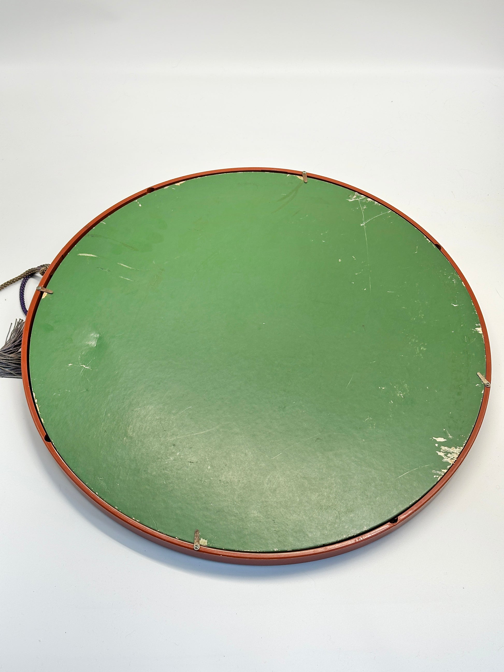 This hand painted artwork features a traditional shikishi (色紙) mounted within a striking round wooden frame fitted with protective glass. The circular frame—finished in a warm vermilion tone—beautifully contrasts with the soft woven yellow matting, creating a refined display that highlights the artwork at its center. Two decorative lavender tassels hang symmetrically from the top, adding a classic Japanese aesthetic reminiscent of festival ornaments and ceremonial décor.