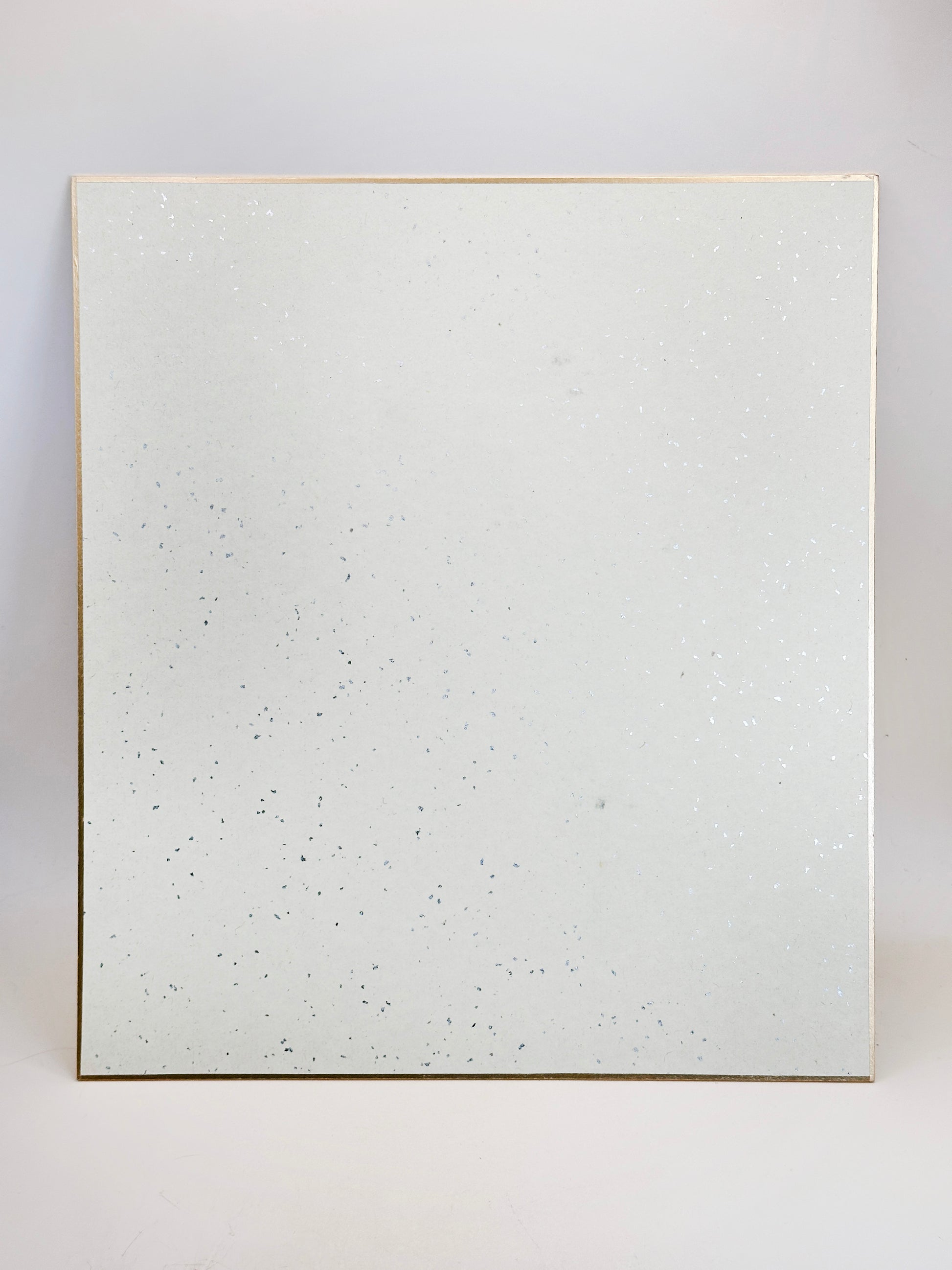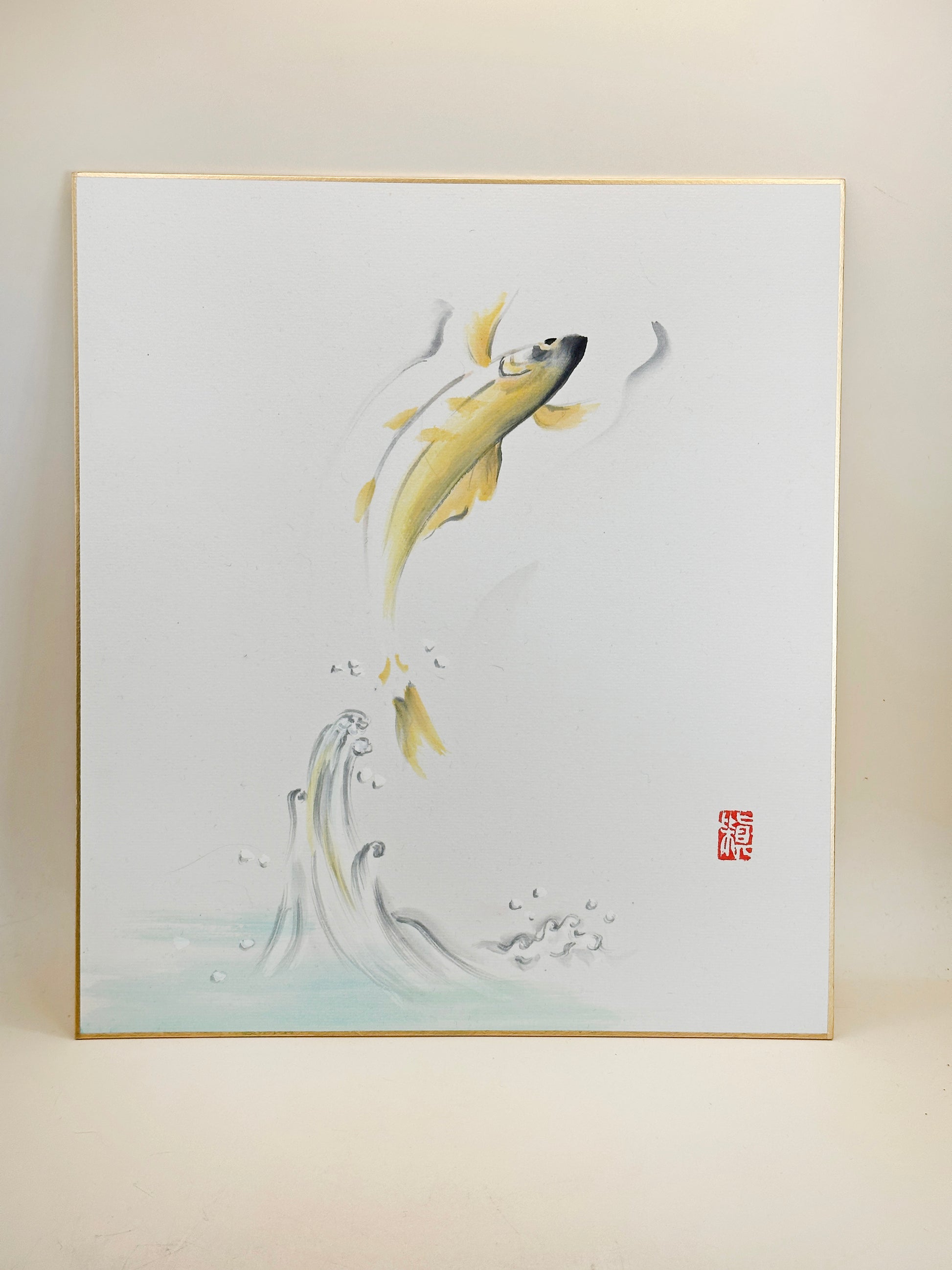 Ce shikishi saisit un instant de dynamisme paisible : un poisson jaillit de l’eau vers l’espace. La composition, volontairement épurée, laisse le fond blanc du shikishi évoquer à la fois l’air et l’eau, un espace où le mouvement et l’intention se font clairement sentir. Le corps du poisson se courbe avec grâce, sa tête pointée vers le haut, suggérant l’effort, l’aspiration et une rupture décisive avec l’immobilité.