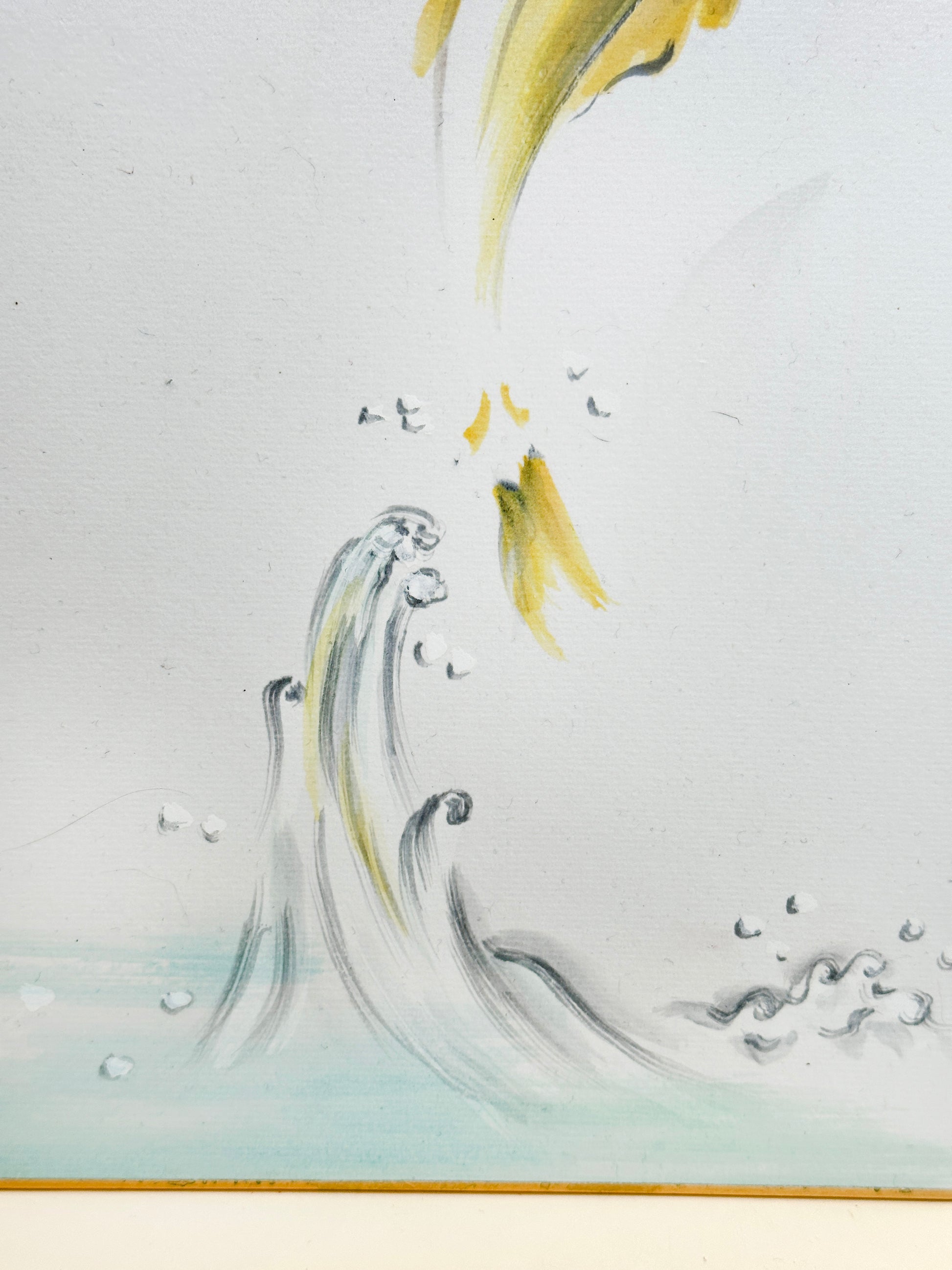 Au Japon, le poisson bondissant revêt une riche symbolique. Il est généralement associé à la persévérance, à l'ambition et au succès acquis par l'effort, faisant écho à l'image bien connue de la carpe remontant le courant. Même sans éléments narratifs explicites, ce shikishi transmet un sentiment de détermination et d'élan ascendant, ce qui le rend non seulement visuellement élégant, mais aussi empreint d'une douce inspiration.