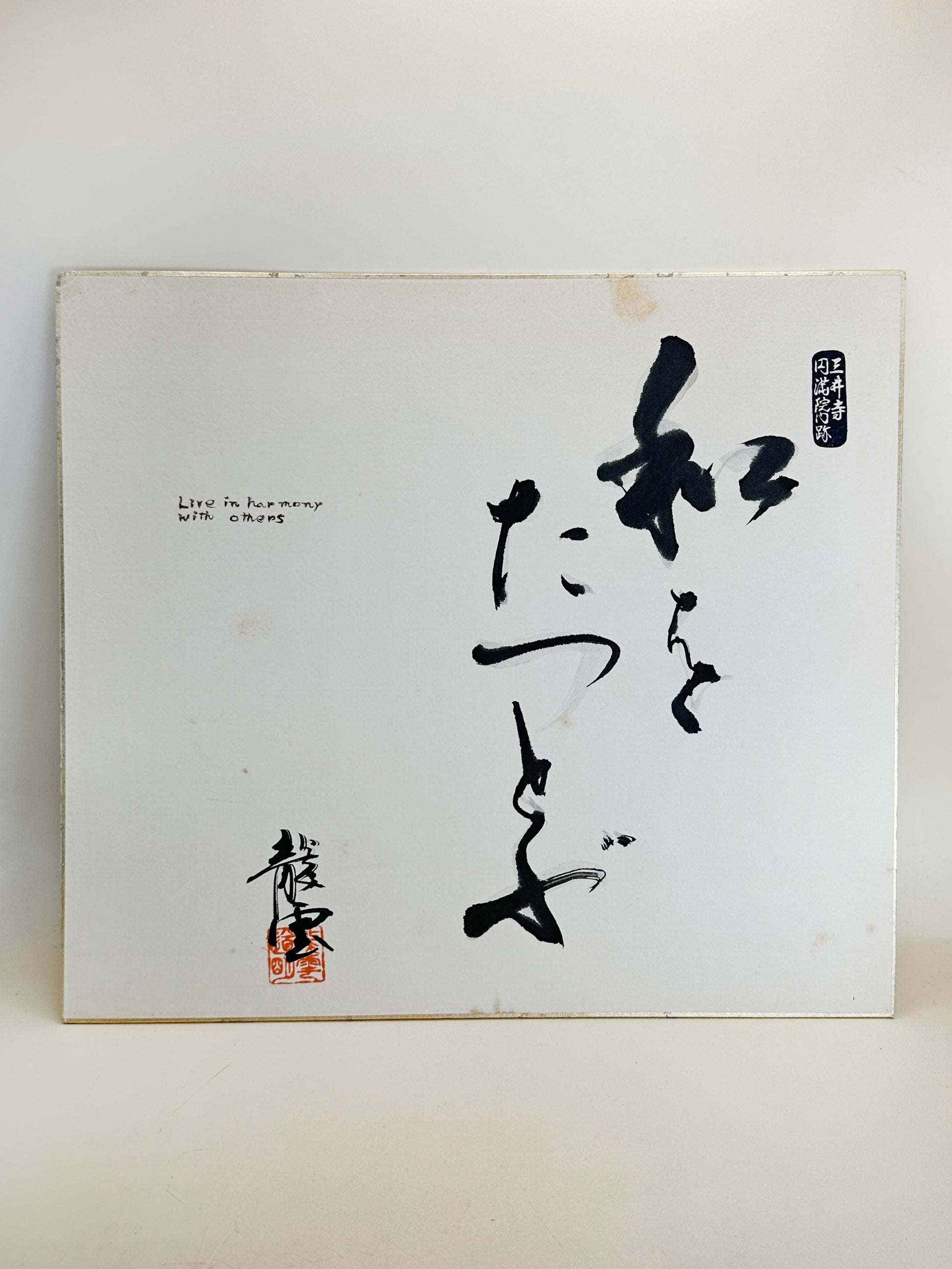 Both shikishi are signed and stamped with temple seals, reinforcing their spiritual authenticity and origin. Presented together, the pair forms a harmonious teaching set: one card focuses on living well with others, while the other reminds us that fulfillment is found in giving. As devotional artworks, they serve not only as elegant decorative pieces but also as daily reflections on Buddhist ethics and mindful living rooted in the living tradition of Mii-dera.