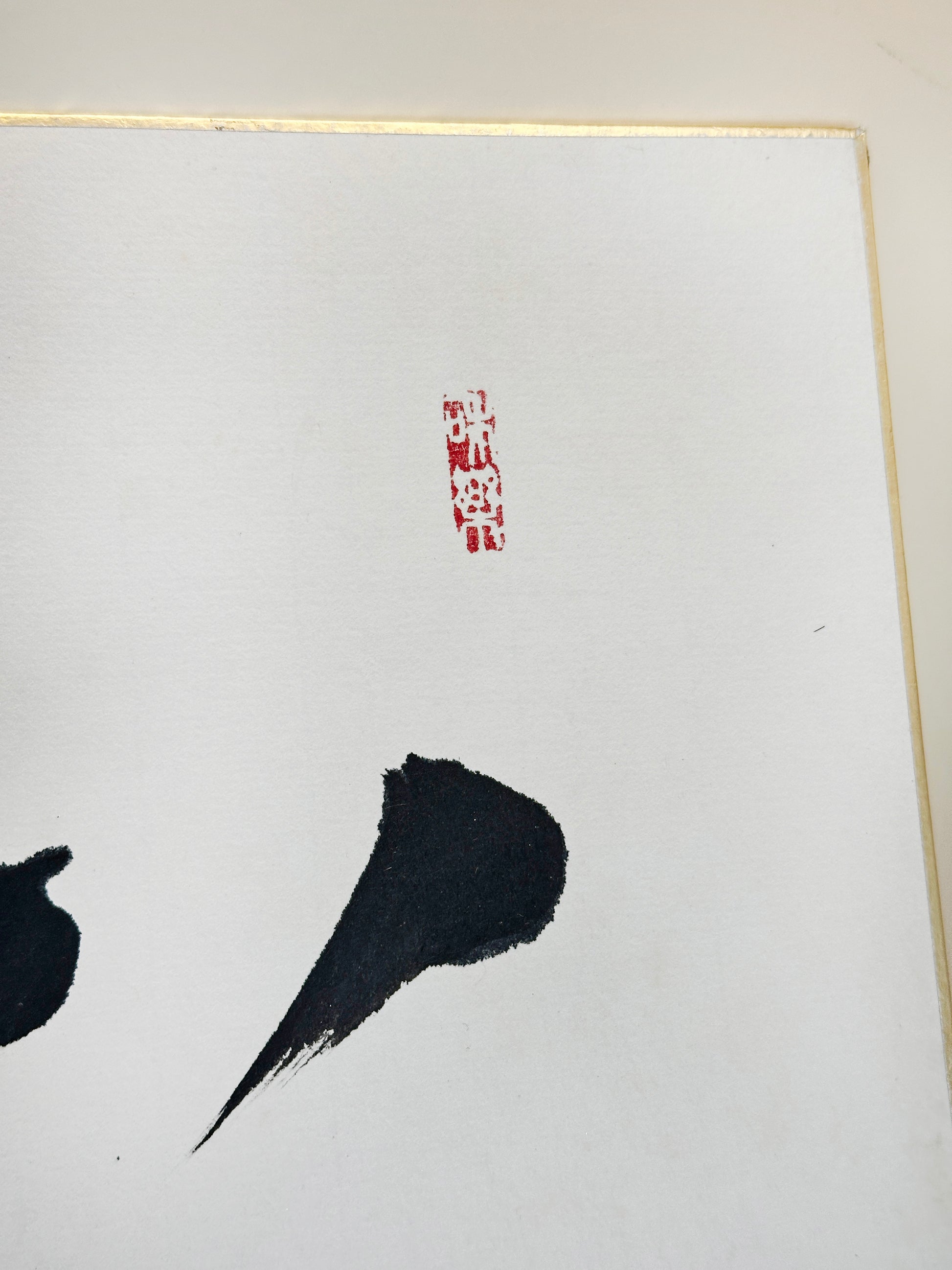 The placement of the characters, with generous spacing and subtle variations in ink density, reinforces this idea of balance and softness. The calligrapher’s seal adds a formal, contemplative finish, grounding the work within the tradition of devotional and philosophical shikishi.