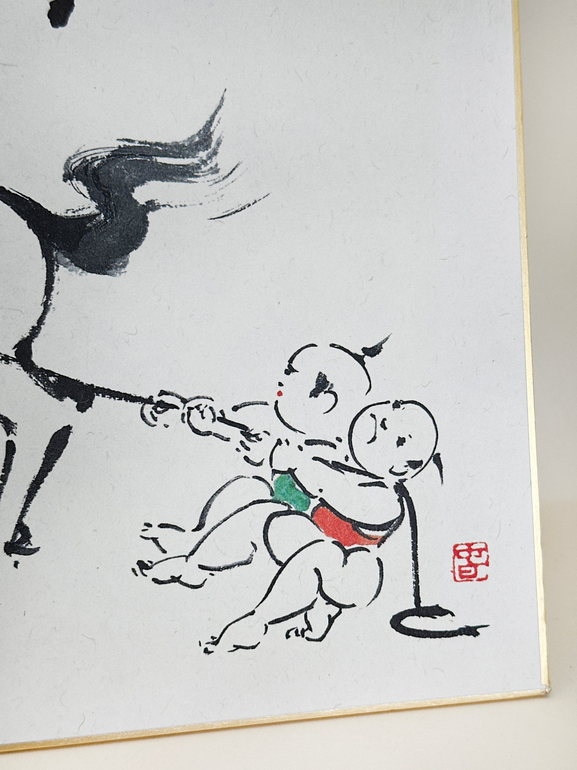 Below the calligraphy, a lively karako (唐子)—a traditional Chinese-style child figure popular in Japanese art—is shown tugging on a rope attached to a horse. The exaggerated contrast between the small child and the powerful animal creates a humorous yet symbolic image. Rather than literal strength, the scene suggests auspicious effort, innocence, and the idea that sincerity and perseverance can move even great forces. Such imagery is often linked to wishes for healthy growth, success, and vitality, especially for children.