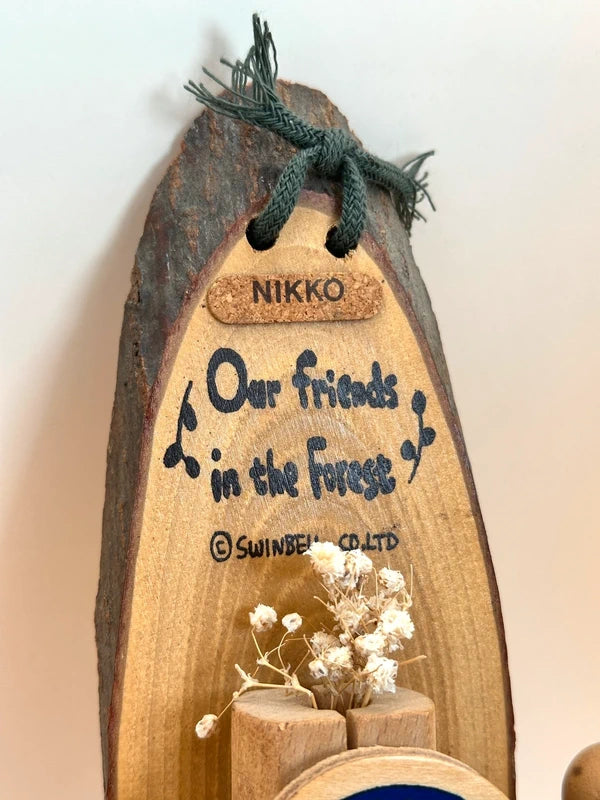 Une cloche vintage des années 1980 représente un hibou aux couleurs vives sur une plaque en bois naturel, célébrant l'esprit fantaisiste de la nature et les souvenirs d'enfance du Japon des années 1980. Créée par Swinbell Co. Ltd. (株式会社スウィンベル), cette pièce de collection fait partie de leur gamme « Nos amis de la forêt », initialement vendue dans les boutiques de souvenirs populaires sur le thème de la nature de régions comme Nikkō.