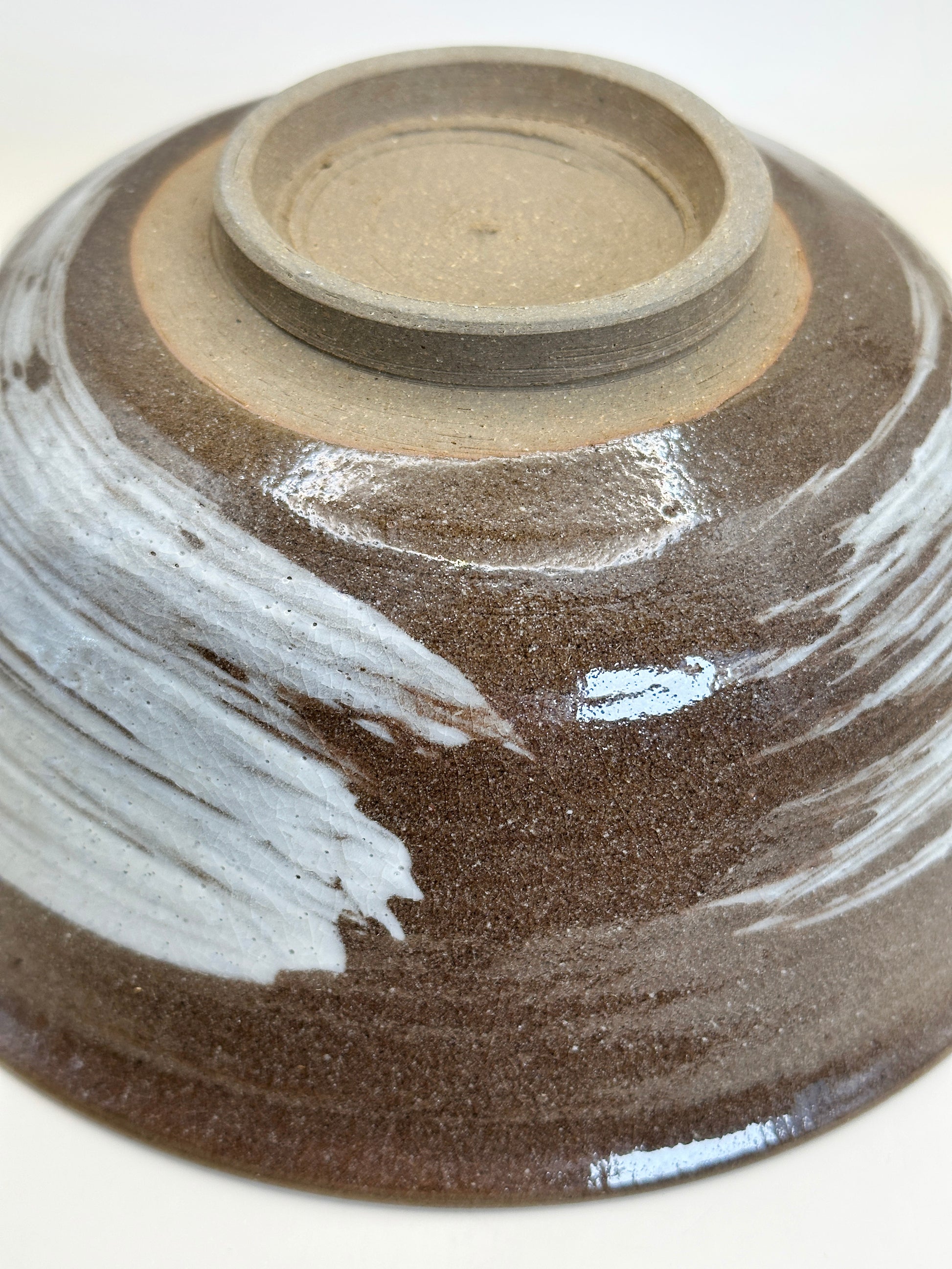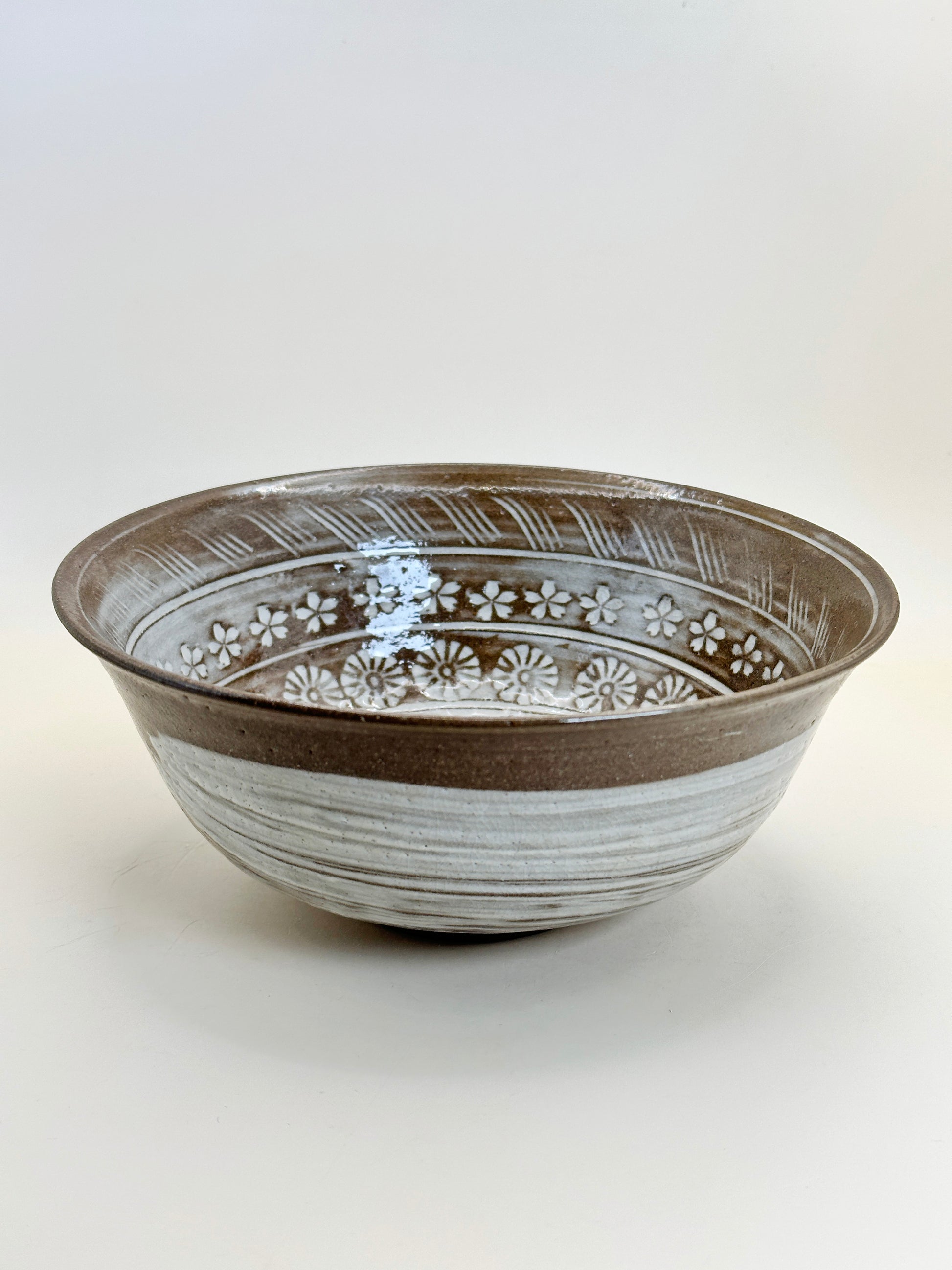 The interior showcases a harmonious sequence of incised and stamped floral motifs, each filled with creamy white slip that contrasts against the soft brown glaze beneath. This creates the signature Mishima effect, delicate, lace-like decoration that is both rustic and sophisticated. The bowl’s wide, gently flared shape enhances the visibility of the intricate inner patterns while giving the piece an inviting presence.