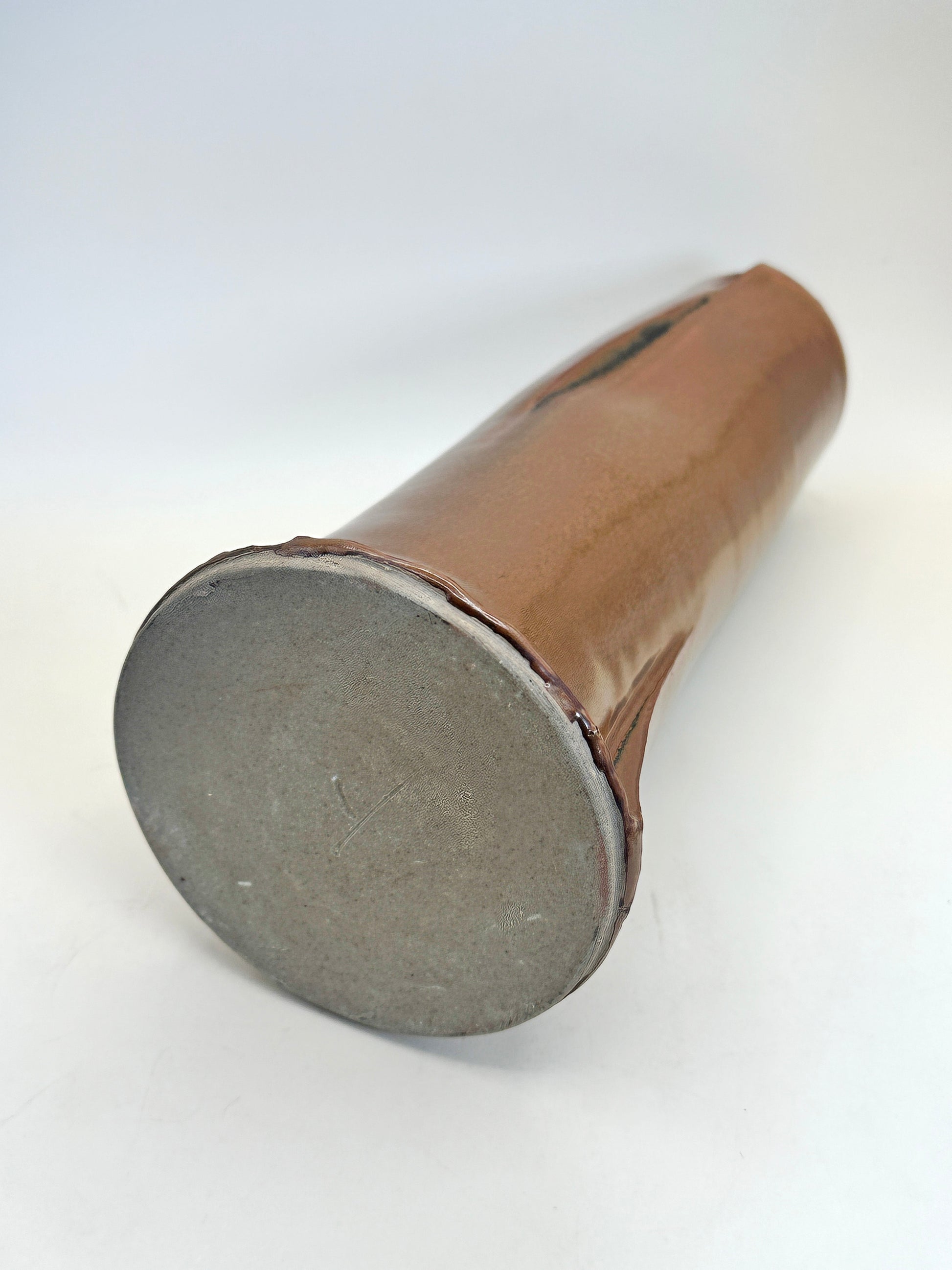 Crafted entirely by hand, the vase features Iwase’s signature 柿瓷 (kakiji) glaze—named for its warm, deep persimmon-brown tone. The surface reveals subtle variations of sheen and depth, with a gentle vertical flow of glaze and a natural, almost sculptural asymmetry that evokes the beauty of unrefined clay. The tall silhouette flares softly at the base, giving the piece stability and a powerful grounded elegance.
