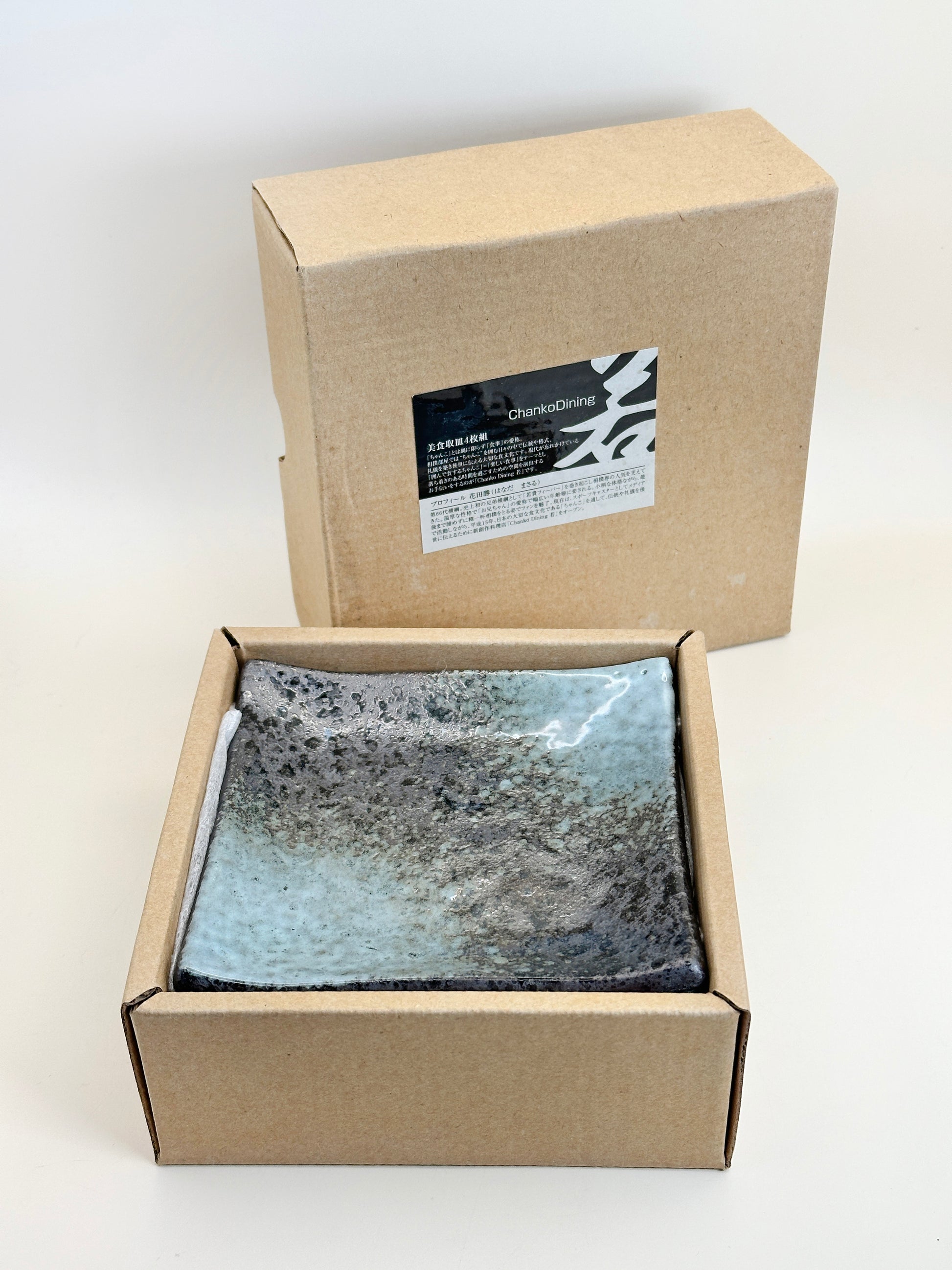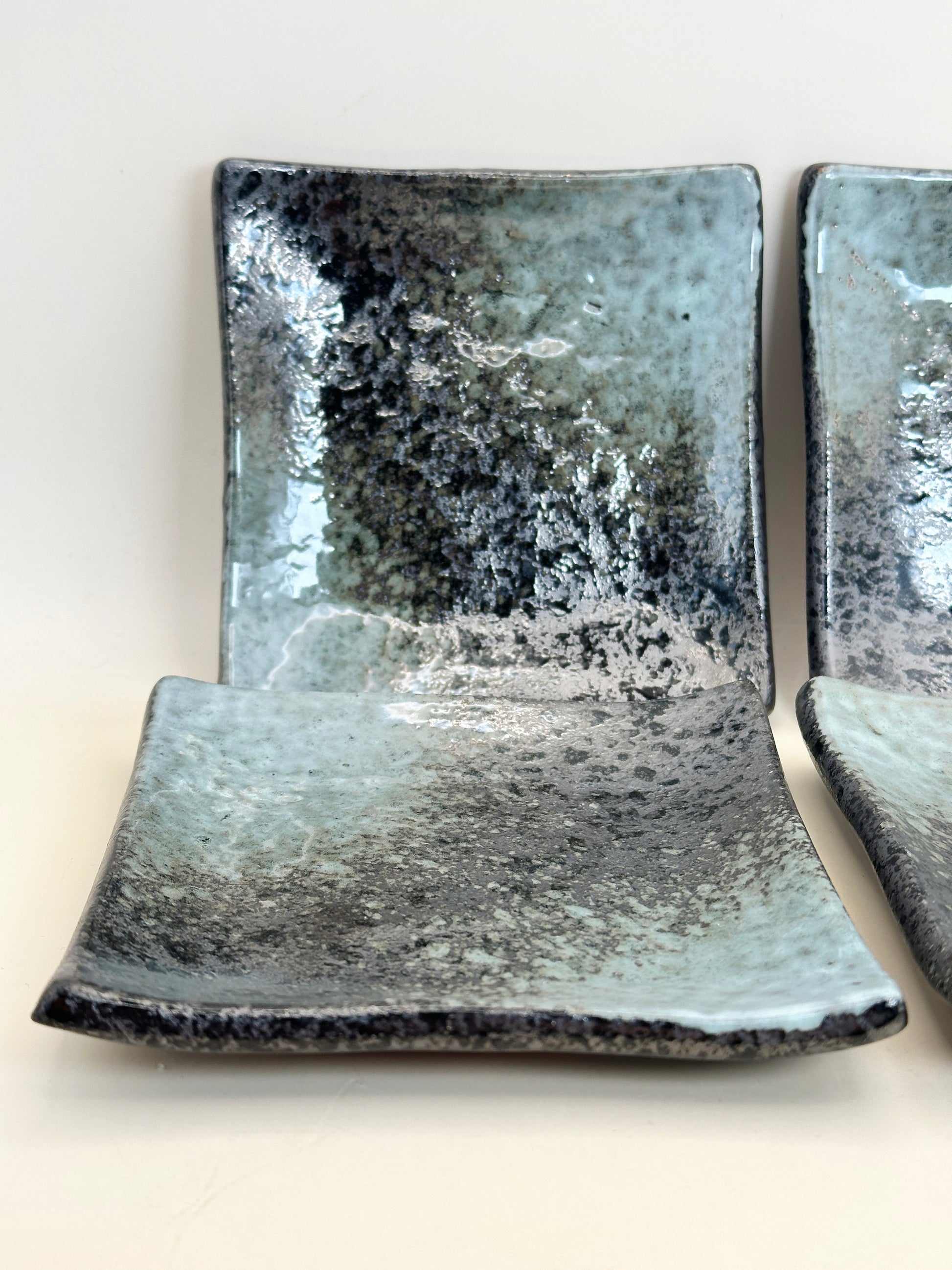 Ce service raffiné de quatre petites assiettes carrées met en valeur la beauté discrète du design céramique japonais contemporain. Chaque assiette présente des angles légèrement arrondis et un émail à la texture riche, mêlant un gris anthracite profond à des tons bleu-gris, évoquant la profondeur sereine de la pierre naturelle. Les subtiles variations de couleur et de surface reflètent une forte sensibilité wabi-sabi, qui célèbre l'individualité et l'imperfection organique.