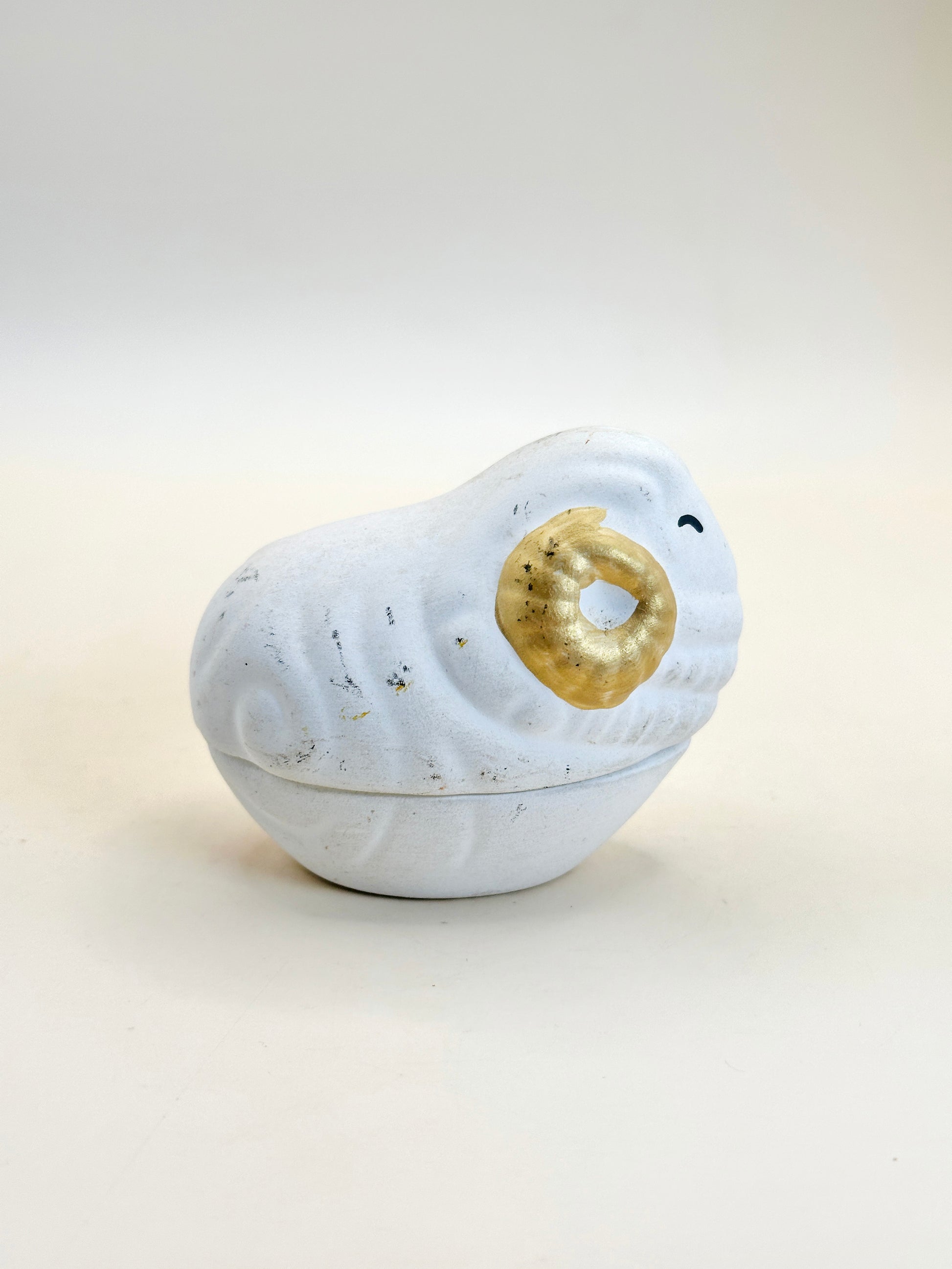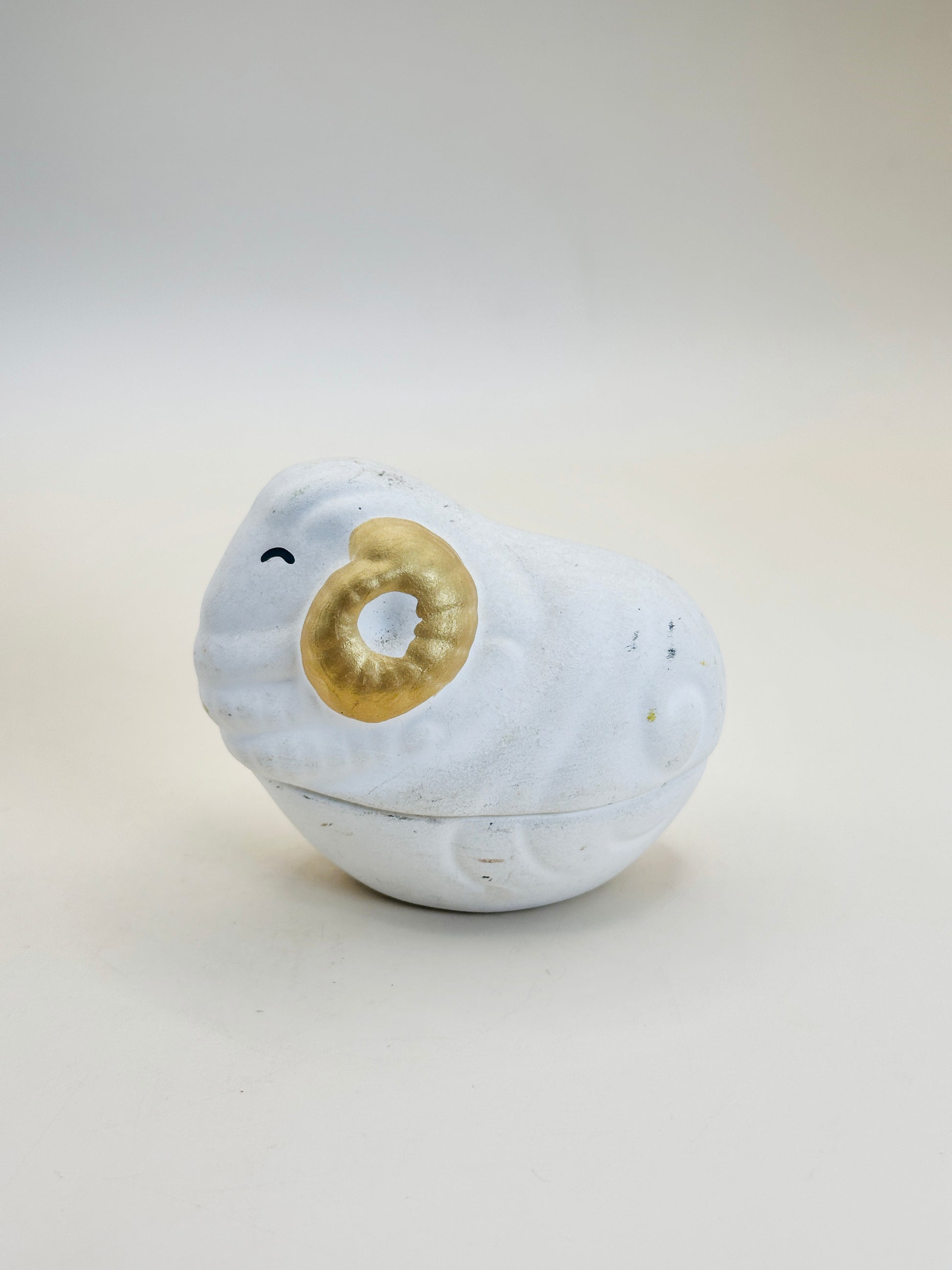 The body is finished in a matte white glaze with a subtle powdery texture, giving the piece a serene and soothing presence. The curled horns are accented in gold, adding a quiet touch of elegance and symbolic richness. This restrained use of gold creates a pleasing contrast against the white surface without overpowering the overall simplicity of the form.