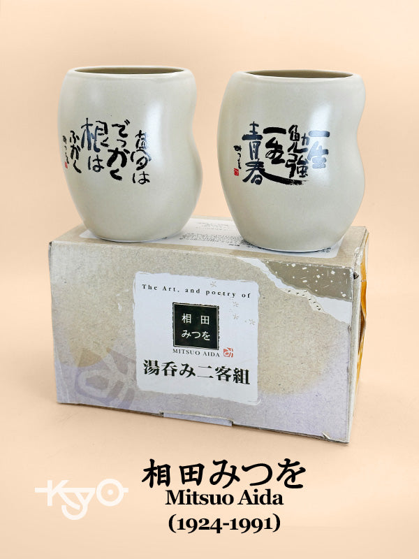 This modern pair of yunomi (湯呑) tea cups features heartfelt calligraphy by Mitsuo Aida, one of Japan’s most beloved poet–calligraphers. Known for his deeply human, plain-spoken words, Aida’s works express themes of kindness, self-acceptance, perseverance, and compassion—messages that resonate quietly and profoundly in everyday life.