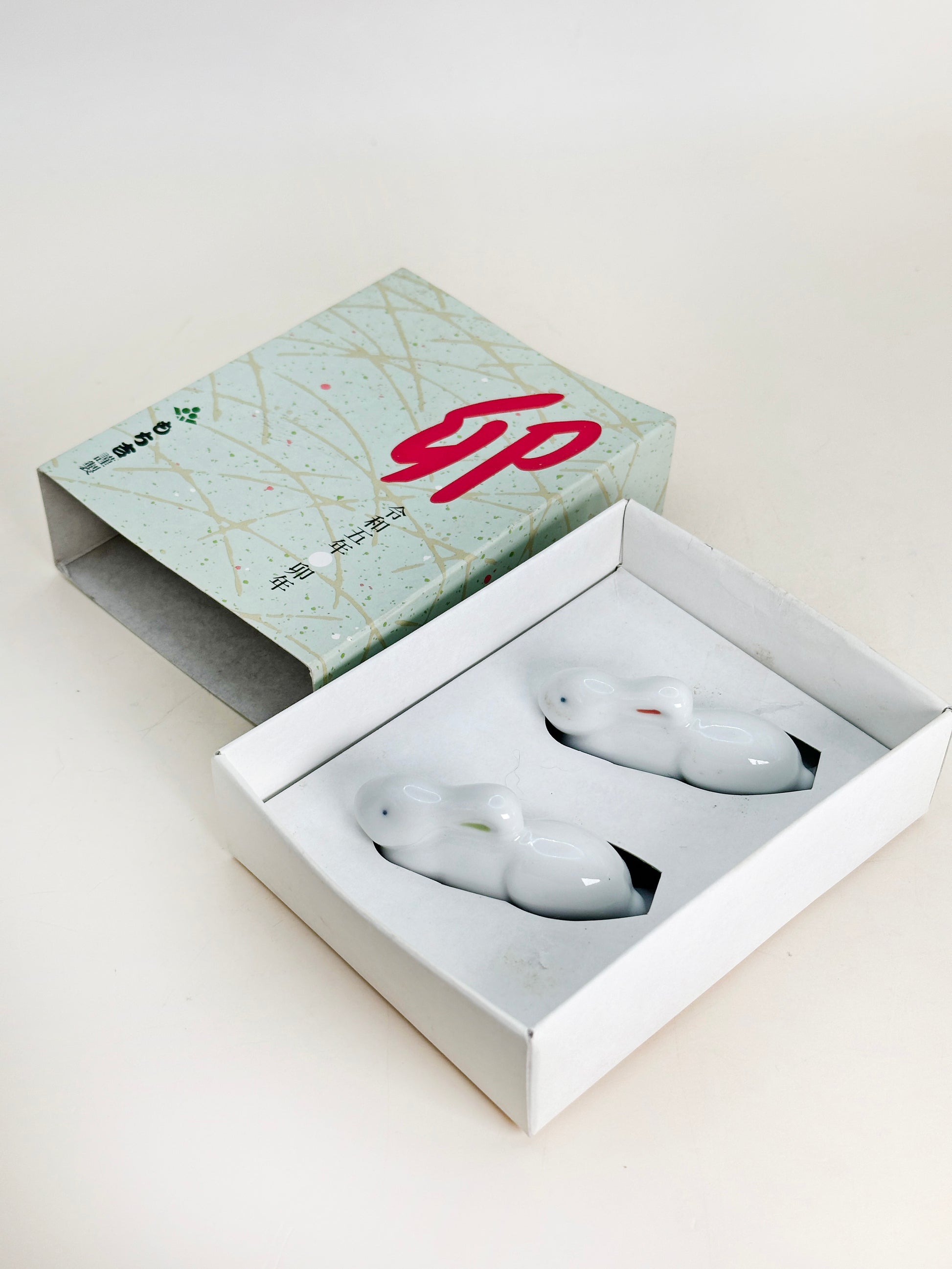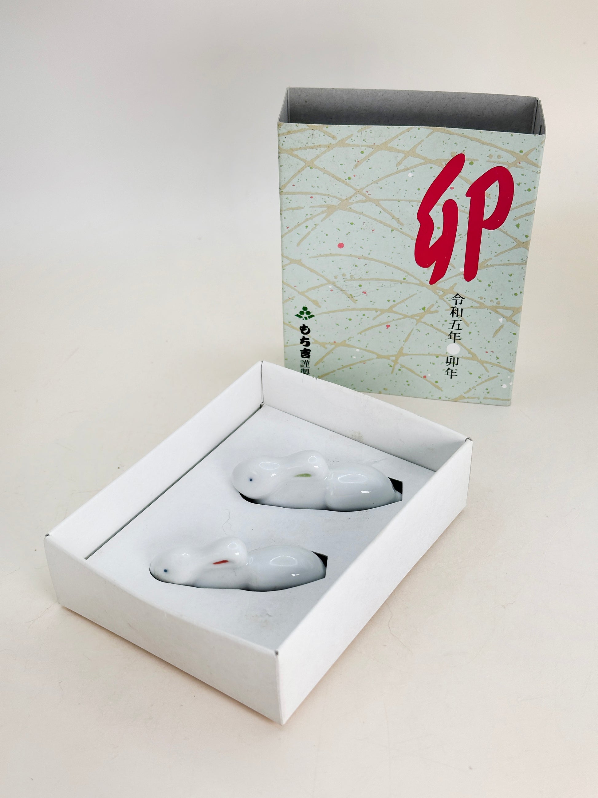This charming set of rabbit chopstick rests (箸置) is made by Mochikichi もち吉, a well-known Japanese confectionery brand celebrated for its traditional craftsmanship and refined seasonal designs. Created for the Year of the Rabbit (卯年), this pair beautifully reflects Japanese New Year symbolism.