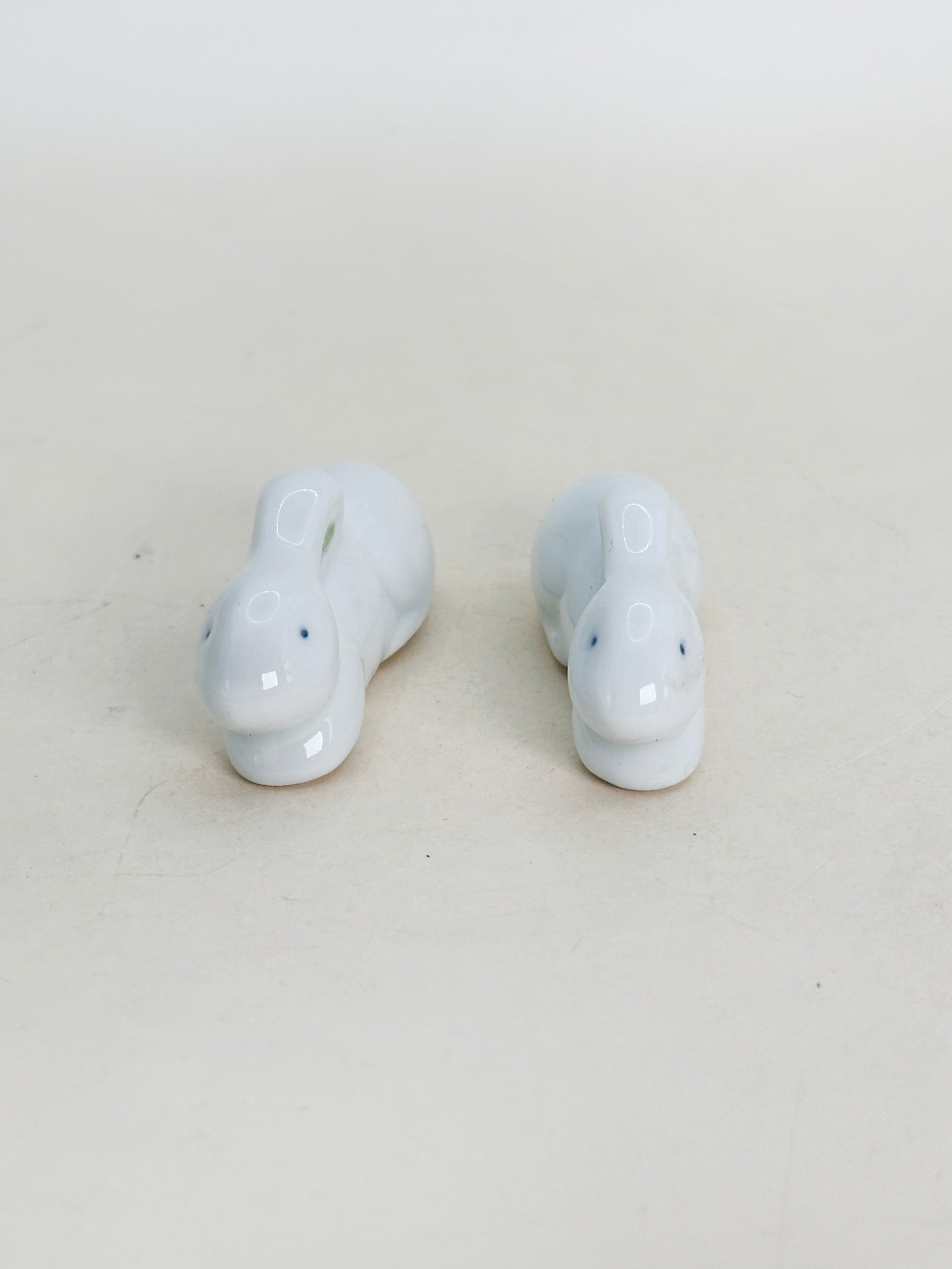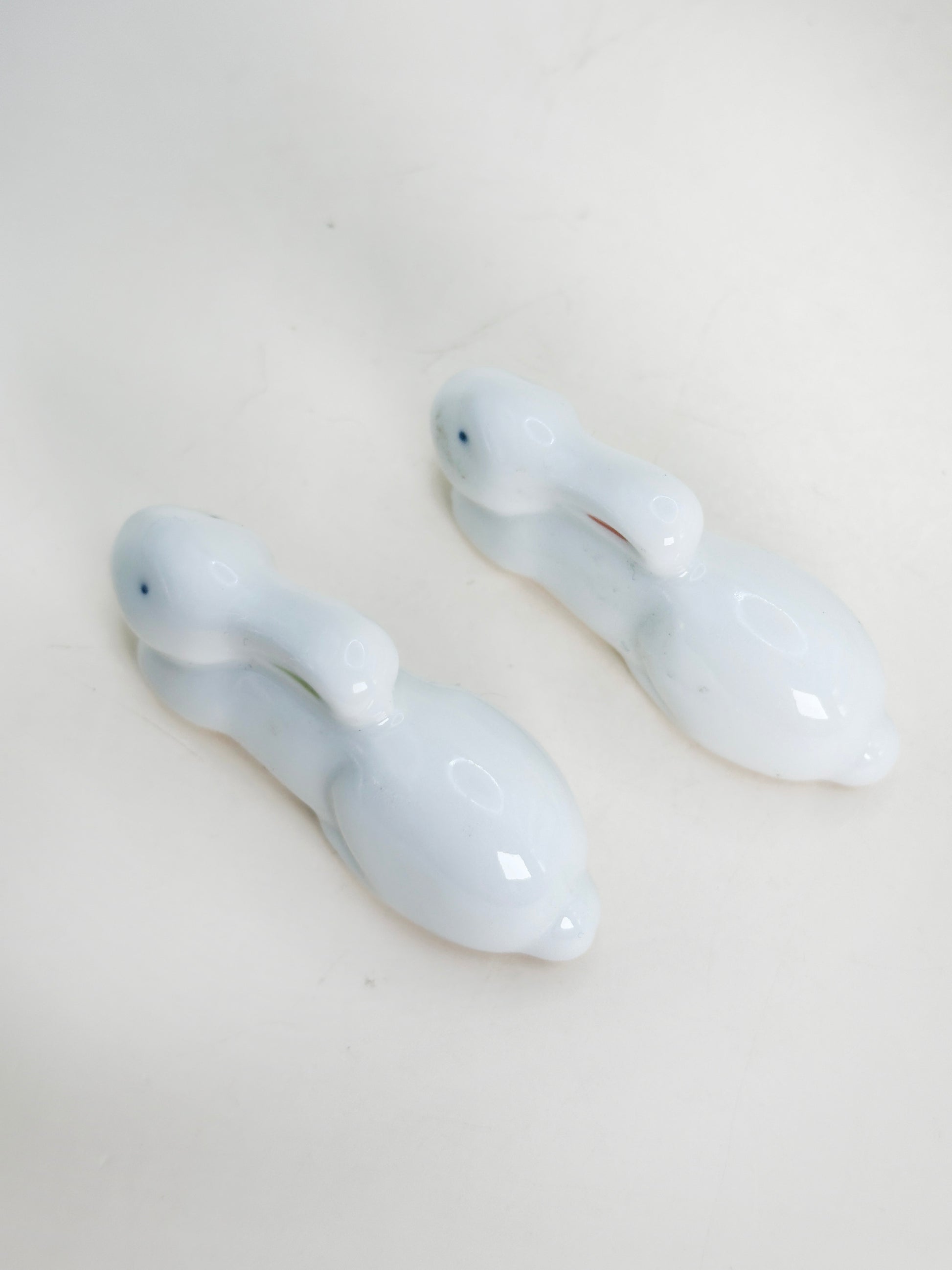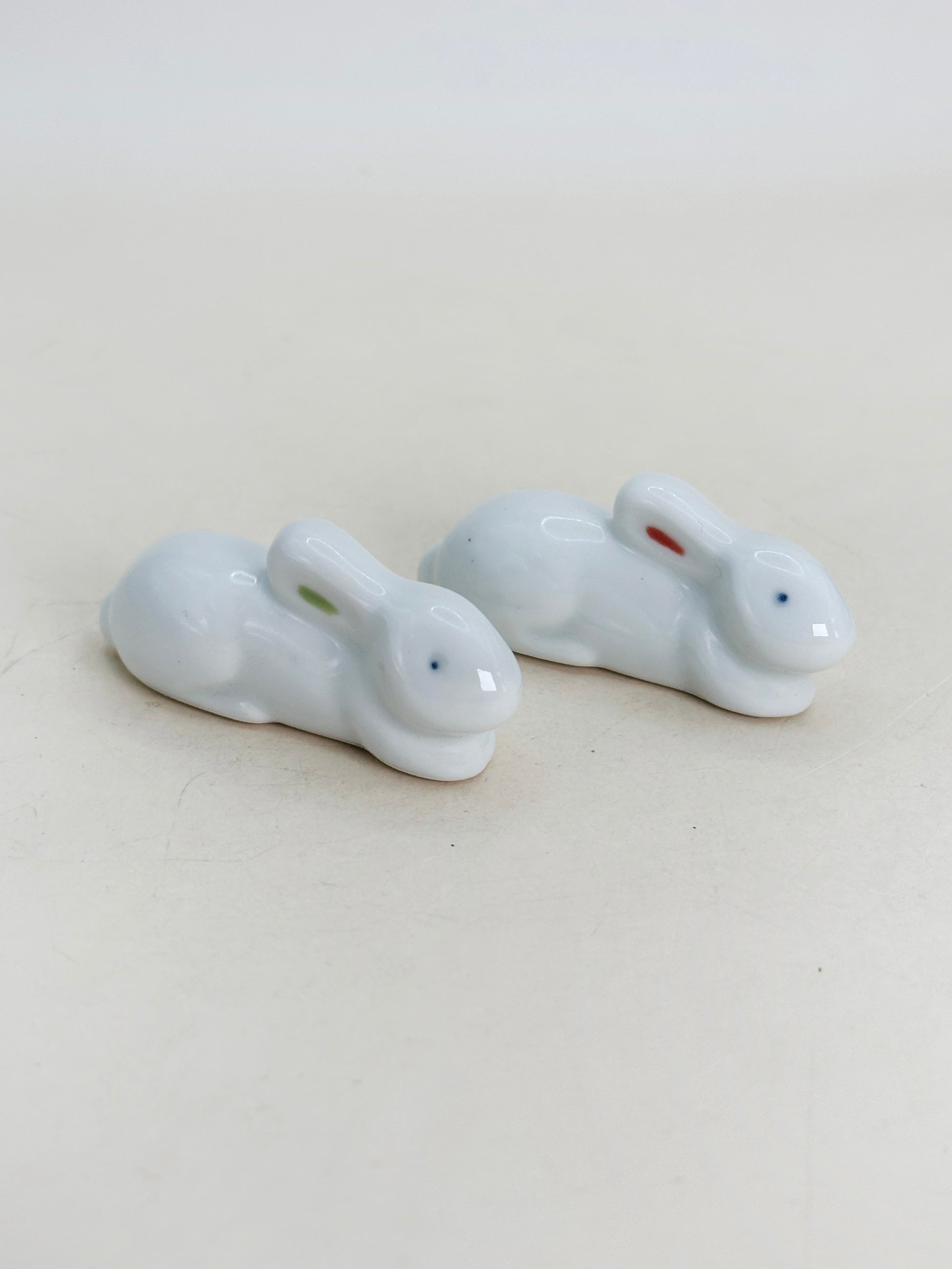 Each rabbit is crafted in smooth white porcelain with a glossy finish, featuring delicate hand-painted details — soft blue eyes and subtle red and green accents on the ears. The rabbits are depicted in a gentle resting pose, symbolizing peace, good fortune, and prosperity. In Japanese culture, the rabbit is associated with harmony, agility, and auspicious beginnings.