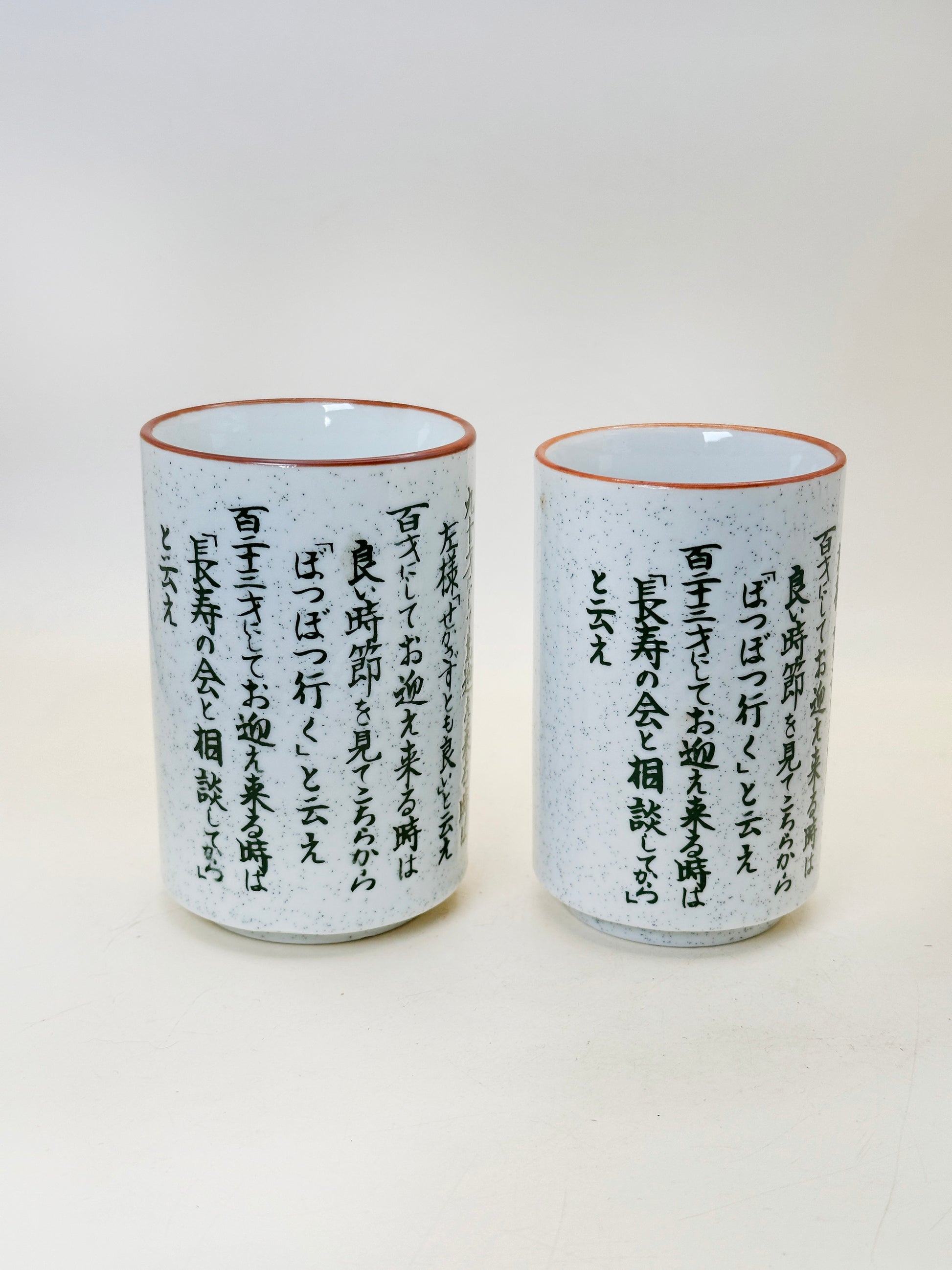 This pair of Mino-yaki (美濃焼) yunomi tea cups is made by Sōhō-gama (宗峰窯) and titled 「長寿の心得」 (Chōju no Kokoroe) — “Precepts for Longevity.”