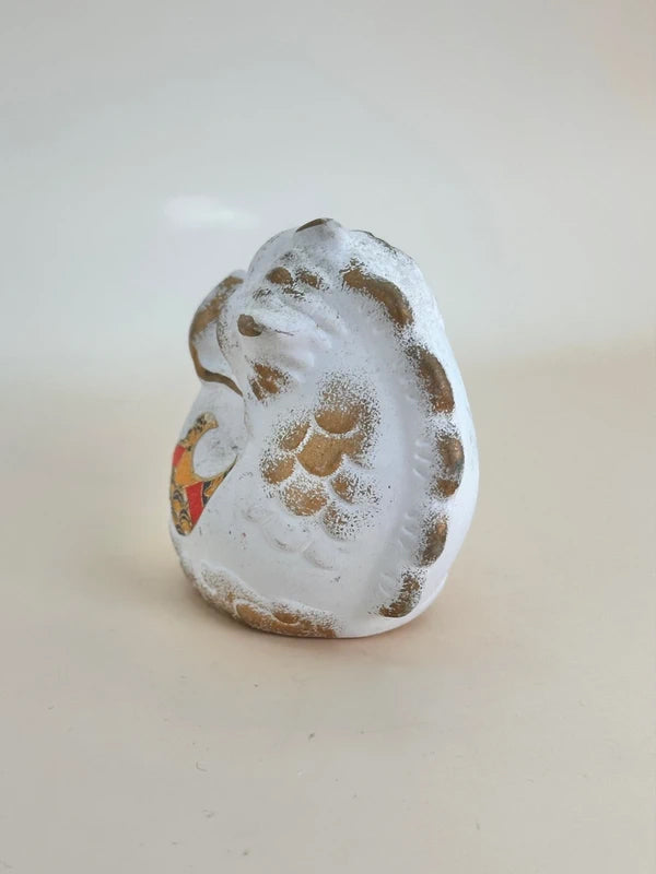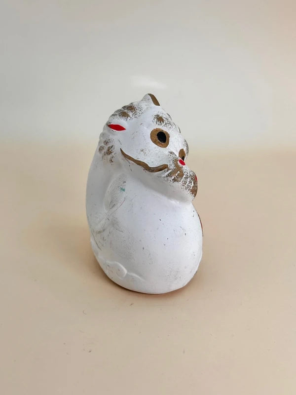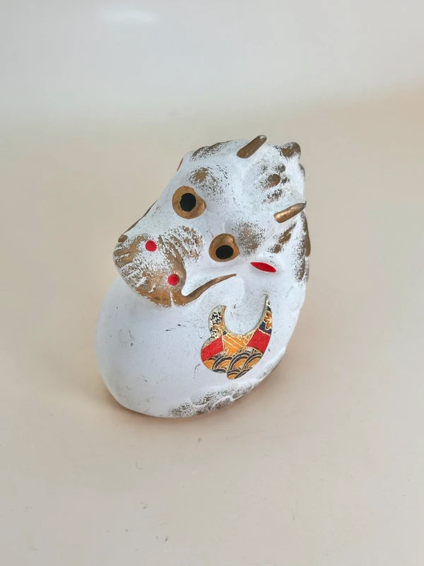 Représentant l'année du Dragon (辰年) du zodiaque japonais (eto), cette pièce est un symbole de chance, de force et d'énergie spirituelle. Peint à la main avec des motifs traditionnels vibrants et rehaussé d'or, le dragon est réalisé dans une argile blanche douce, aux textures détaillées et à l'expression audacieuse.