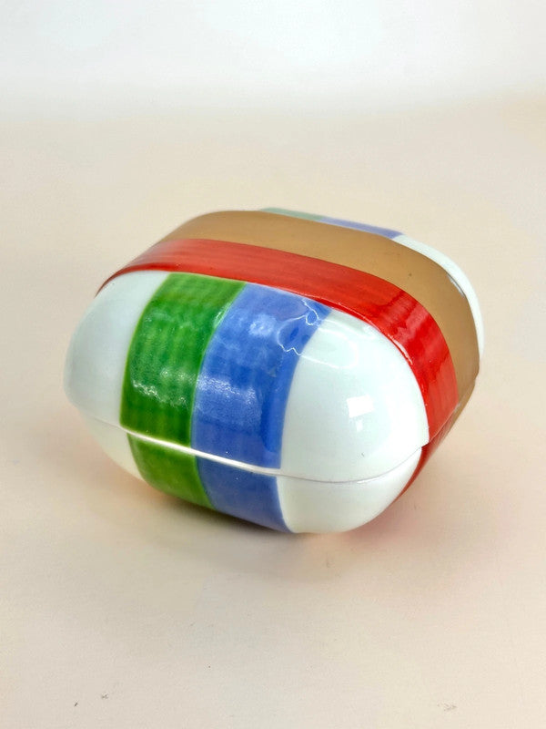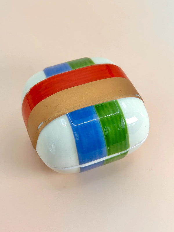 This charming vintage porcelain incense box from Japan features a bold and colorful design with hand-painted bands of red, green, blue, and gold over a glossy white glaze. The box is square with softly rounded edges, giving it a smooth and elegant form. Inside, the compartment is richly finished with a golden glaze, adding a touch of luxury and warmth to its simple yet striking exterior.