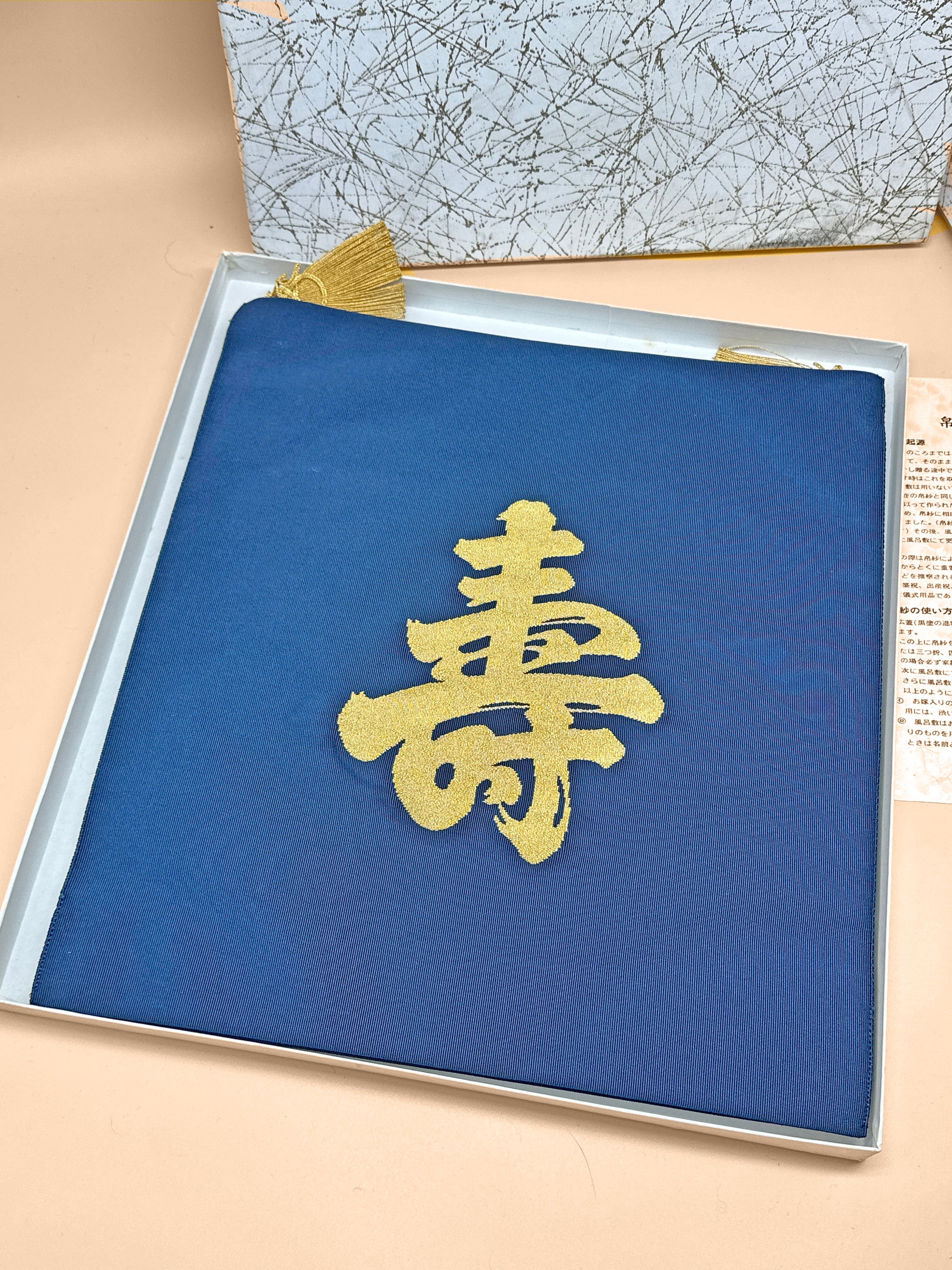 The set is made from high-quality fabric dyed in a deep blue colour and adorned with intricate gold embroidery. One side of the fukusa features a floral motif inspired by a family crest, known as the mon-style design. The other side is embroidered with the auspicious character "寿" (kotobuki), symbolising longevity and congratulations. Gold tassels are attached at the corners, adding an extra touch of elegance.