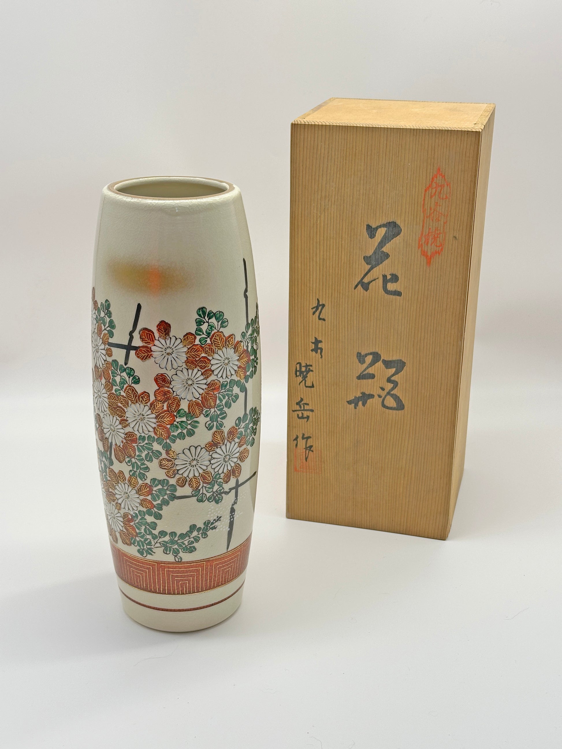 This is a Kutani-yaki (九谷焼) porcelain vase, finely crafted and presented in its original signed wooden tomobako storage box. The tall cylindrical form tapers gently toward the rim, giving it a balanced and elegant silhouette.