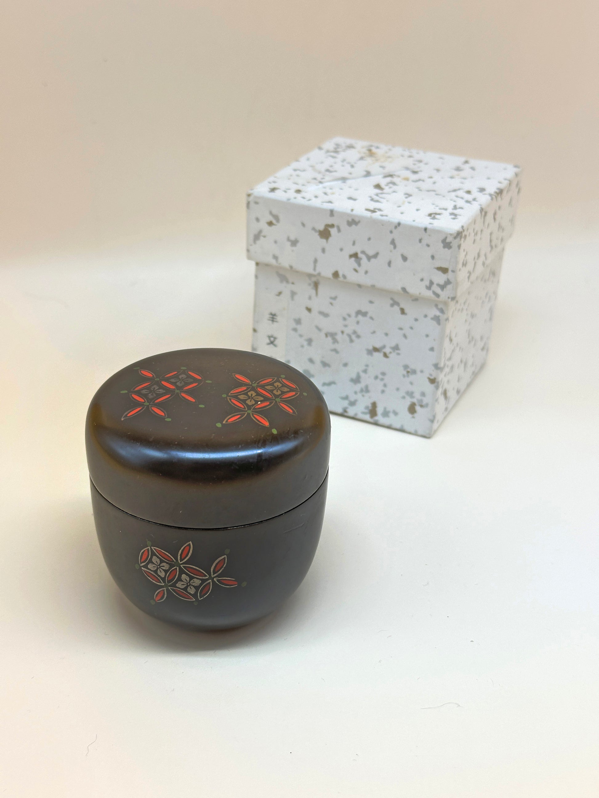 Its surface is decorated with delicate hand-painted floral crest motifs, rendered in red, green, and white, adding a subtle touch of elegance against the glossy background. The interior is coated in a smooth black lacquer, ensuring both protection and a refined finish. The tea caddy comes with its original decorative storage box, enhancing its presentation and authenticity.