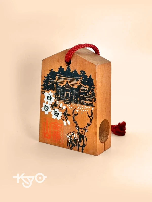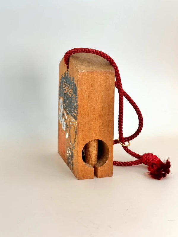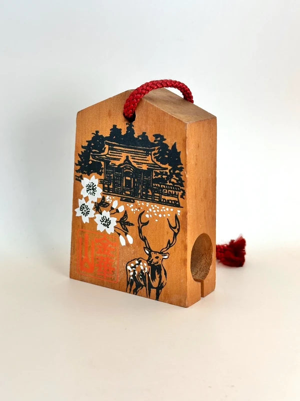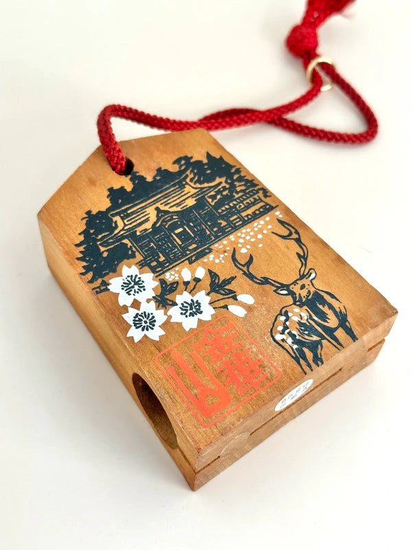 Ce qui distingue cette pièce, c'est son design ingénieux : une cloche encastrée dans le bloc de bois, créant un doux carillon discret qui s'intègre harmonieusement à la forme élégante du porte-bonheur. Kinkasan est traditionnellement connu comme un lieu sacré pour la prospérité et la sécurité maritime, et la croyance locale veut que visiter le sanctuaire de l'île trois années de suite apporte la fortune à vie. Ce Tsuko-Tegata est à la fois un talisman protecteur pour un voyage en toute sécurité et un souvenir d'un voyage spirituel enrichissant vers l'un des lieux de pèlerinage les plus vénérés du Japon.