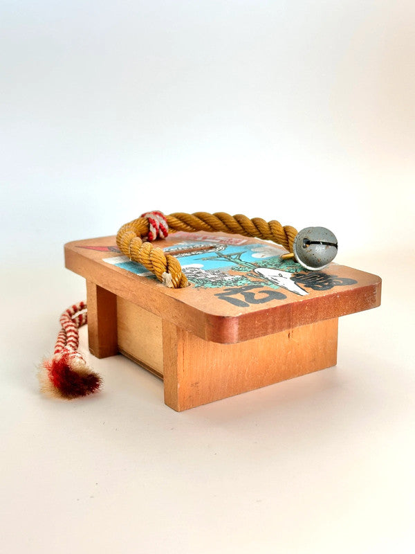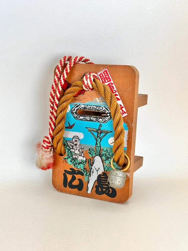 This unique vintage Tsuko-Tegata is beautifully crafted in the shape of a traditional Japanese geta sandal, featuring a vibrant depiction of Hiroshima's iconic Peace Memorial Park, the A-Bomb Dome, and the Children’s Peace Monument. These visuals are deeply symbolic, capturing both the historical depth and the modern-day message of peace associated with Hiroshima.