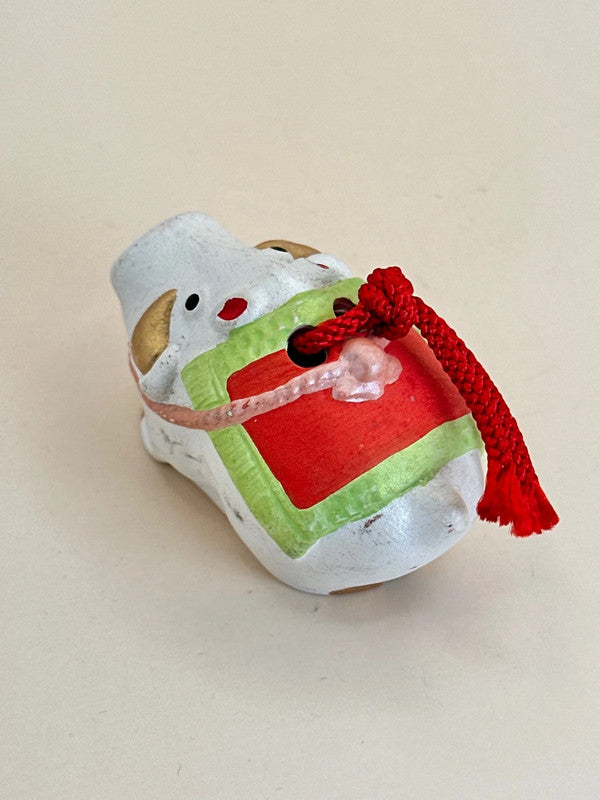 Handcrafted and painted in a soft white tone, the boar wears a vibrant green and red saddle, tied with a red braided cord—colors traditionally used for warding off evil. The expression is gentle yet full of character, evoking strength and resilience with a touch of charm.