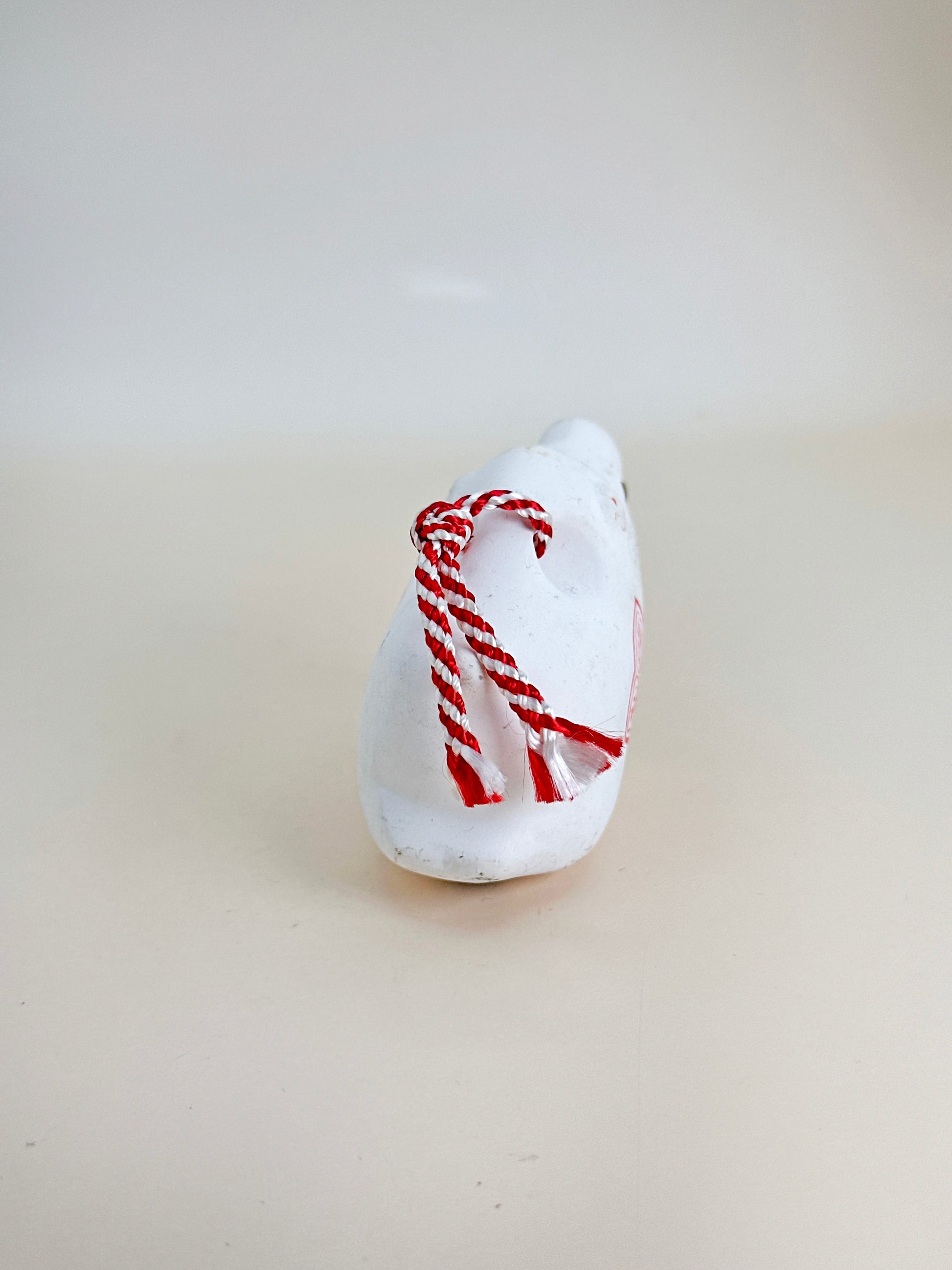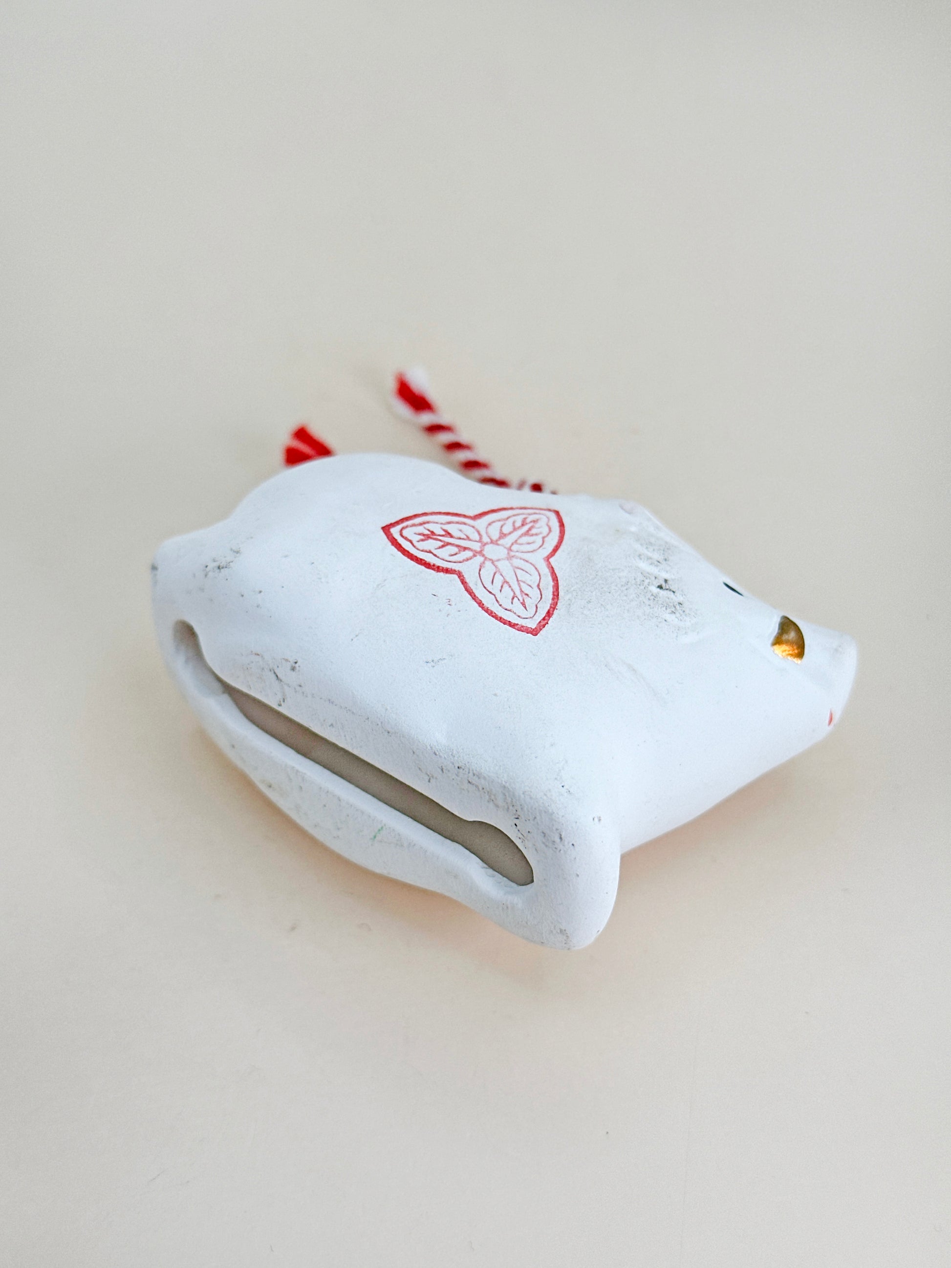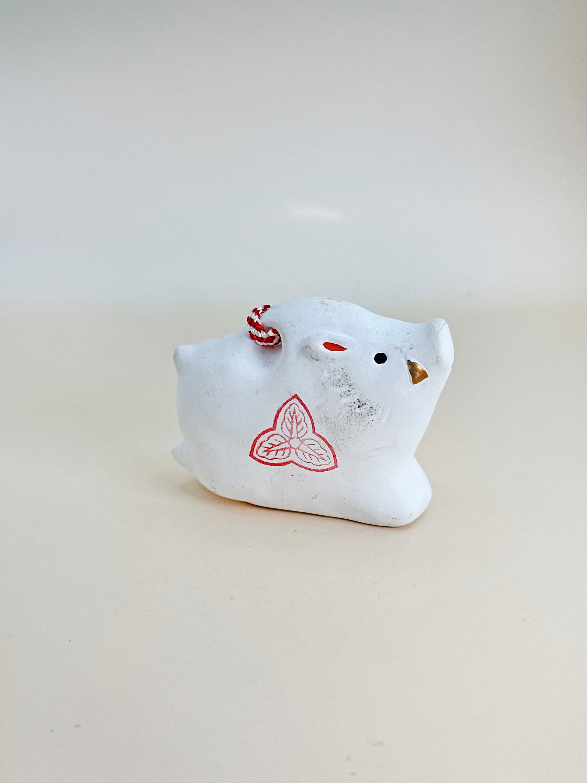 This charming dorei (土鈴) clay bell is shaped like a boar (亥 / inoshishi) and comes from Nishinomiya Shrine (西宮神社), the head shrine of Ebisu worship located in Hyōgo Prefecture. It is adorned with a red and white braided cord and features a bold red seal stamp (御朱印風) on its side, identifying it as a sacred item from the shrine.