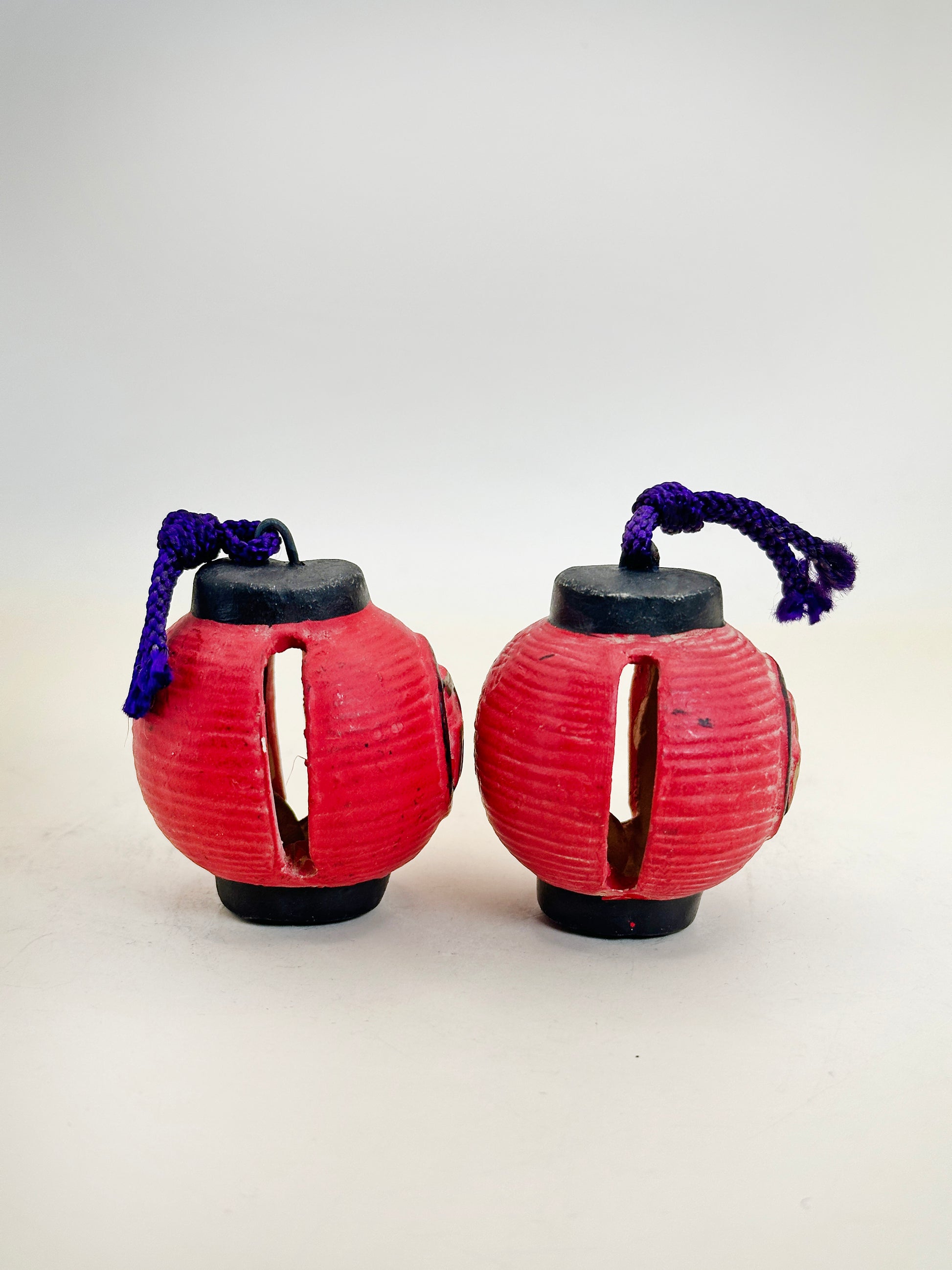 This pair of dorei (土鈴) clay bells is crafted in the shape of traditional red lanterns, each bearing the bold and ancient symbol of the manji (卍) in gold. These bells are associated with 浅草観音 (Sensō-ji Temple in Asakusa), Tokyo’s oldest and most beloved Buddhist temple. The form and design of the bells evoke the atmosphere of temple festivals and the lanterns that line the approach to the temple, giving them a nostalgic and spiritual presence.