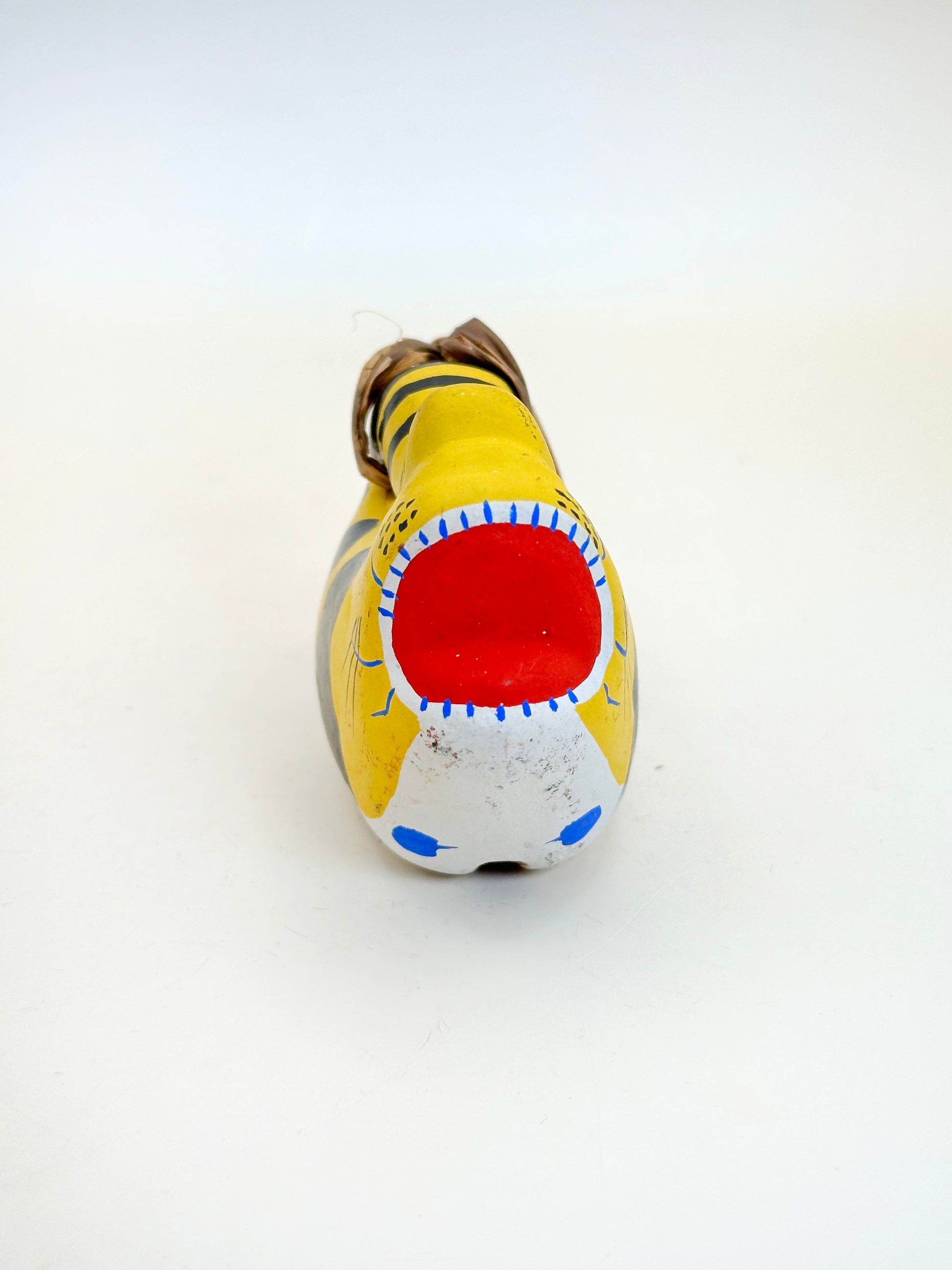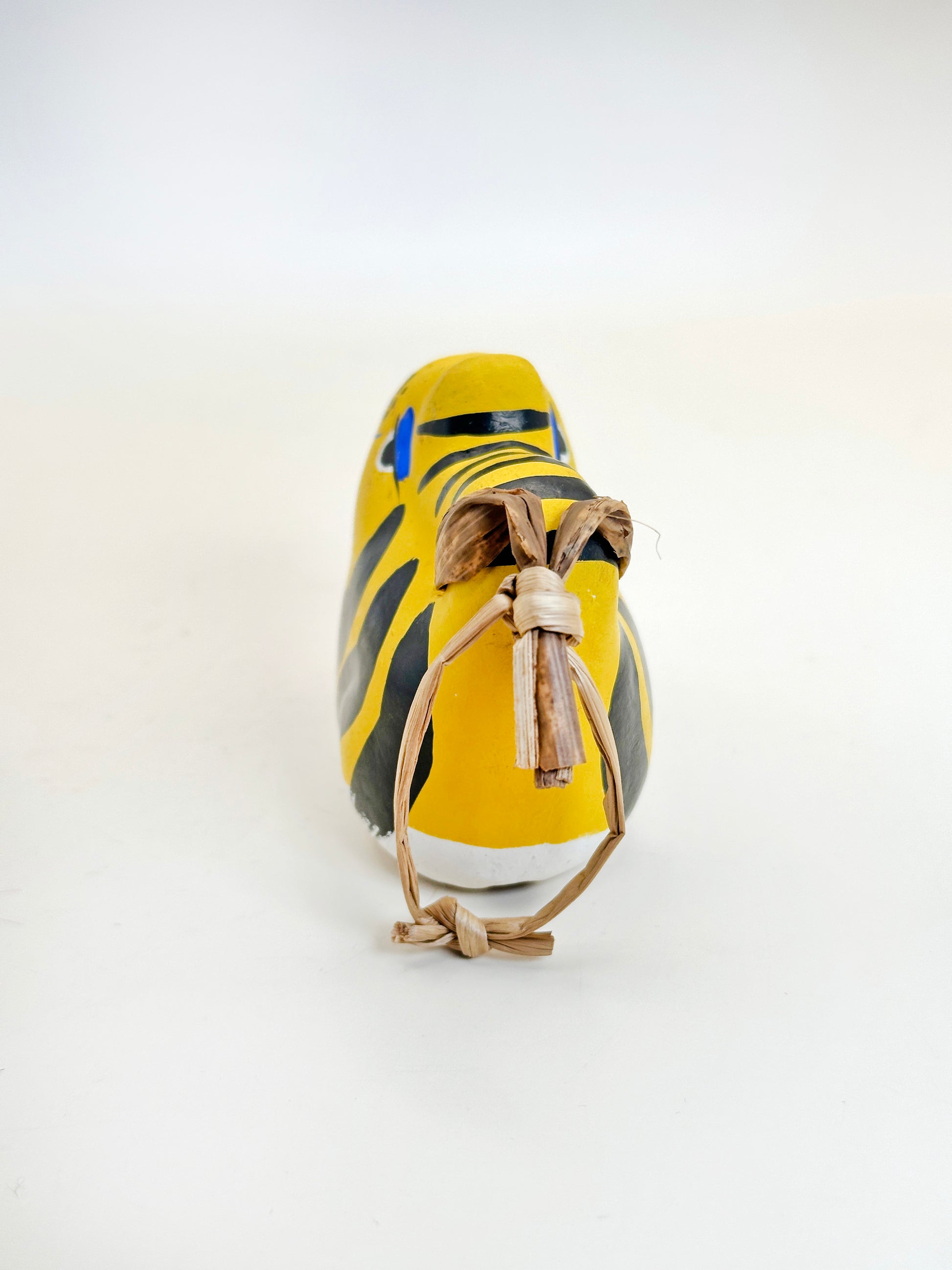 This vibrant dorei (土鈴) clay bell is a striking example of Nogomi Ningyō (のごみ人形), a traditional folk craft from Tara in Nagasaki Prefecture. Shaped like a roaring tiger, this bell is painted in bold yellow with jet-black stripes, vivid blue highlights around the eyes and paws, and an expressive red mouth—features that capture both the ferocity and charm of the tiger spirit.