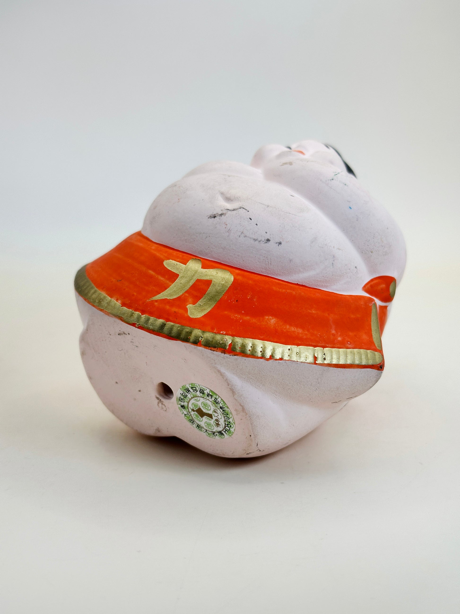 This is a charming vintage Hakata ningyō (博多人形) style dorei (clay bell) featuring a sumo wrestler boy figure, crafted in Fukuoka, Japan. The figure has a delightful round form with a cheerful expression, painted in soft pink tones with delicate facial features. He wears a vivid red mawashi (sumo belt), adorned with the gold kanji character 力 (chikara), meaning “strength” or “power,” symbolizing resilience and vitality.