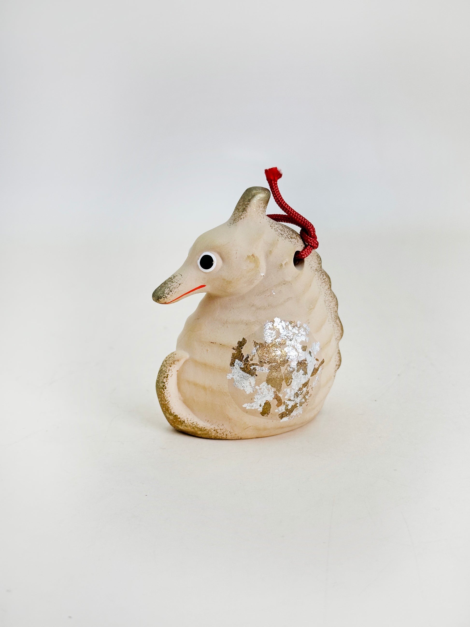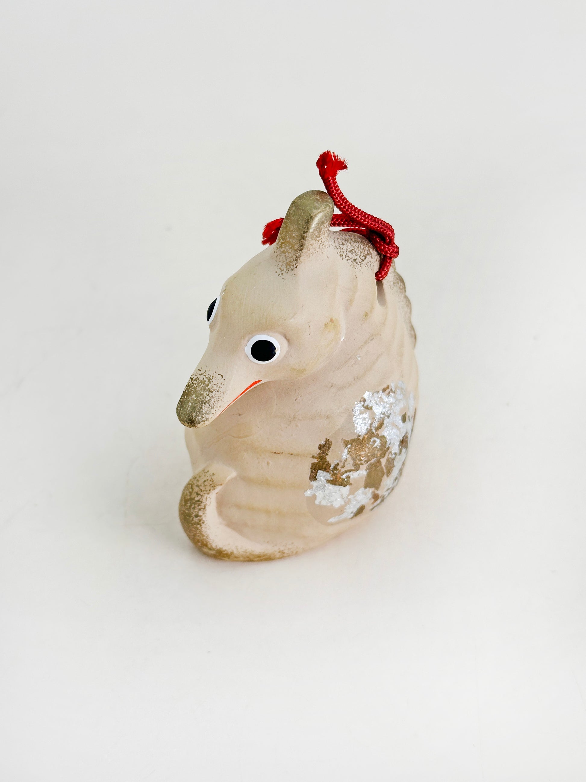 This is a dorei (土鈴) clay bell crafted in the form of a 竜の落とし子 (tatsu no otoshigo)—a seahorse, whose name in Japanese literally translates to "dragon’s offspring." This poetic name reflects the creature’s mythological associations in Japan, where it is imagined as a child of the dragon, a revered and auspicious figure in East Asian folklore.