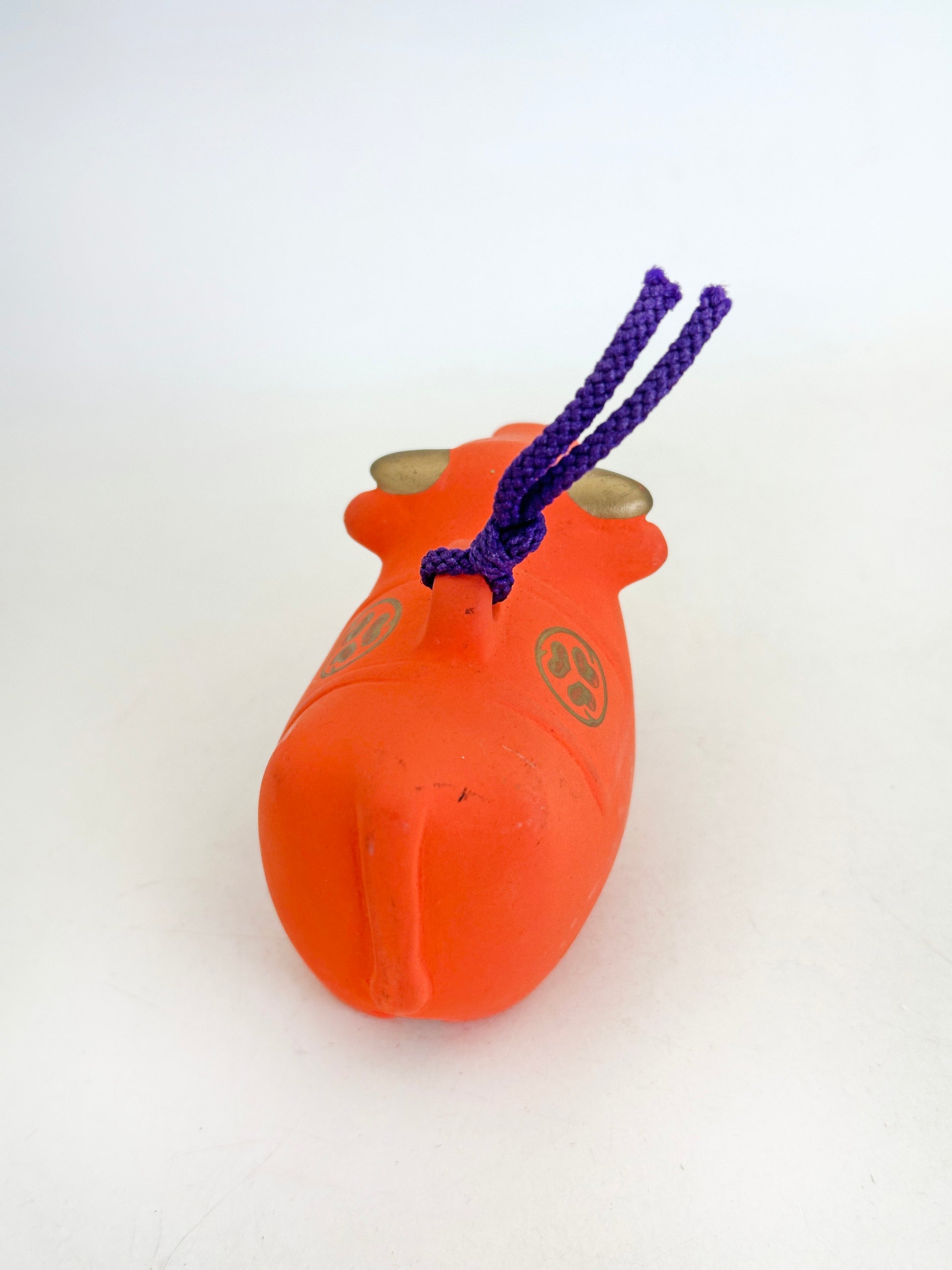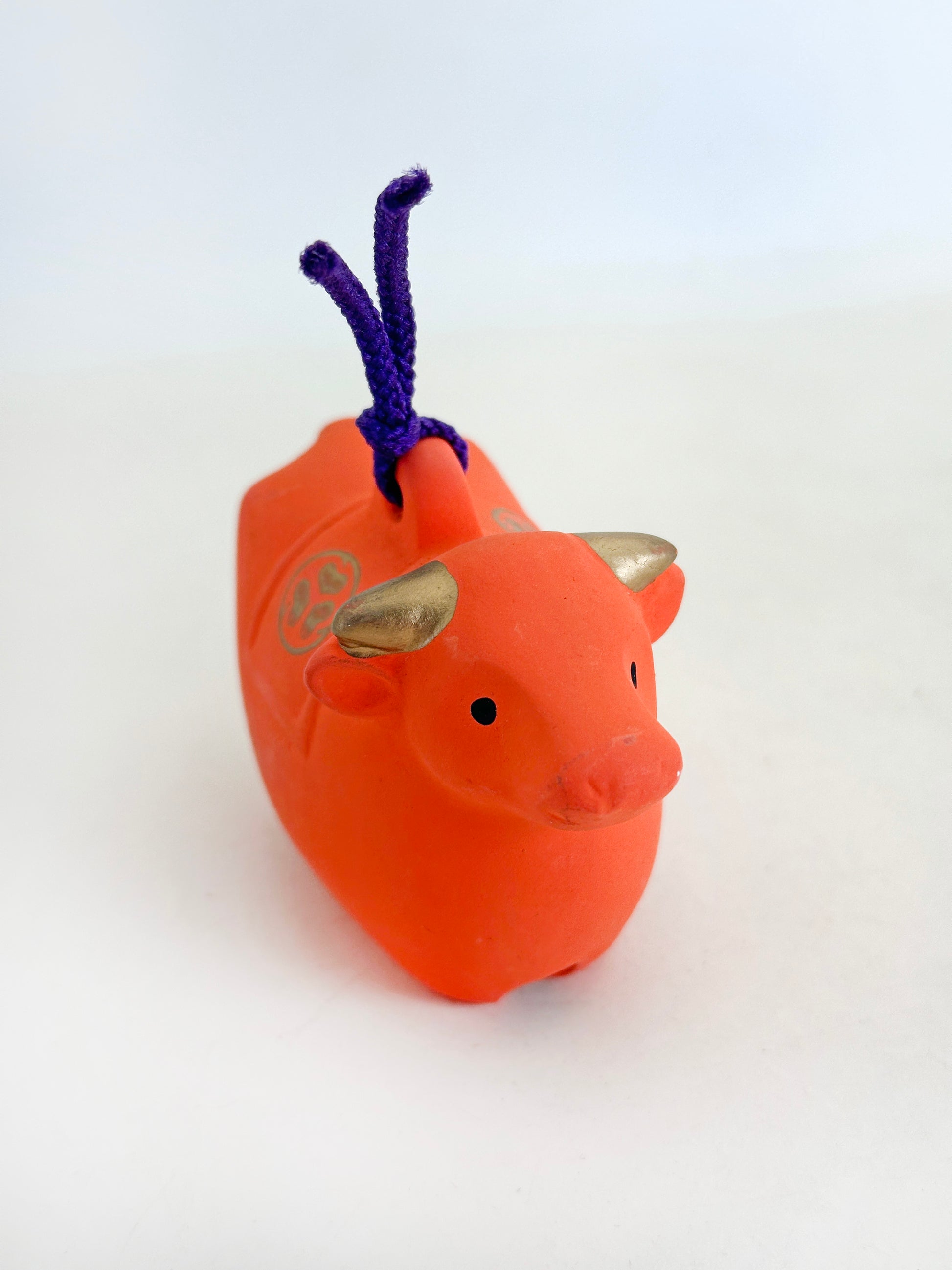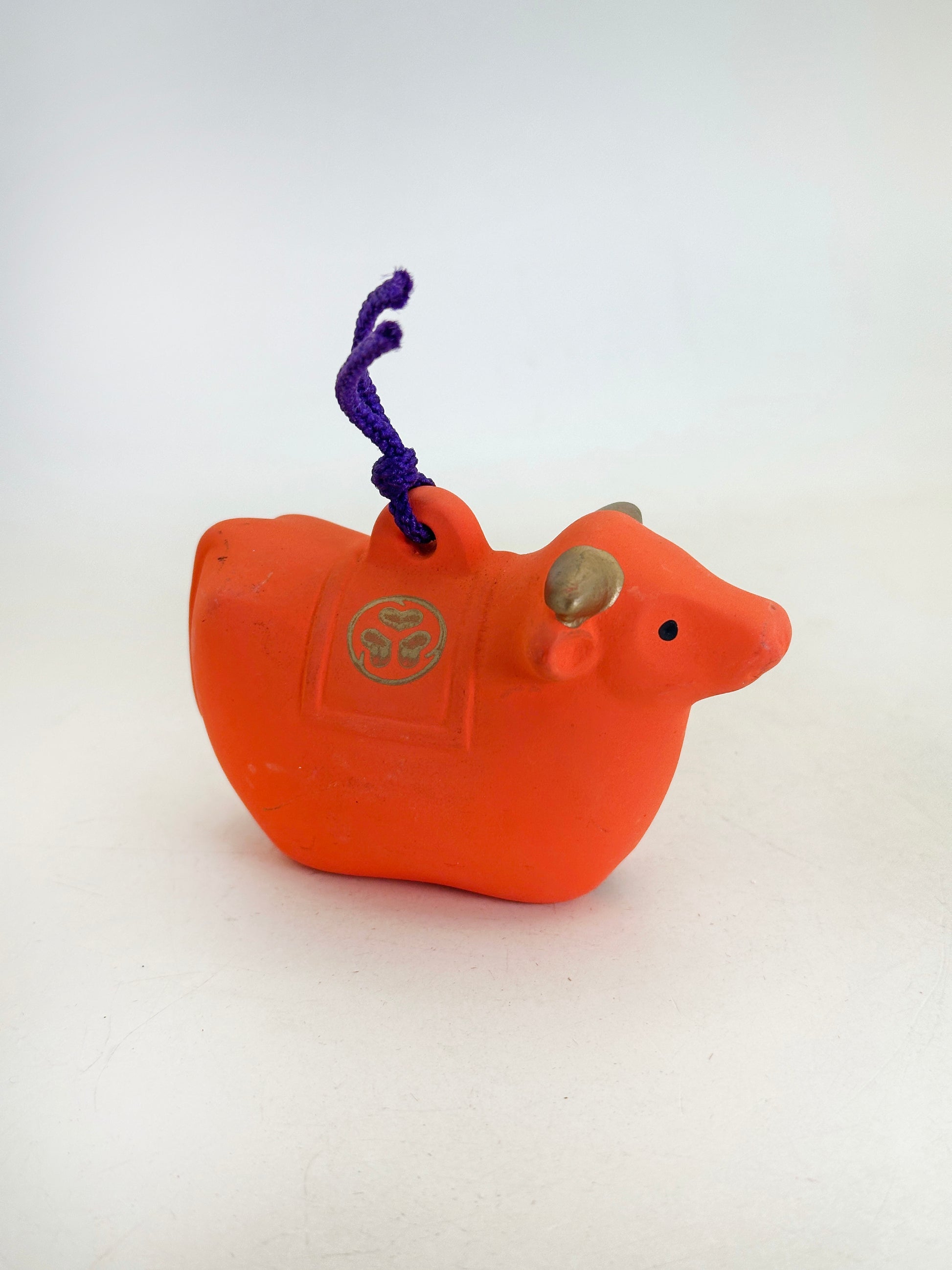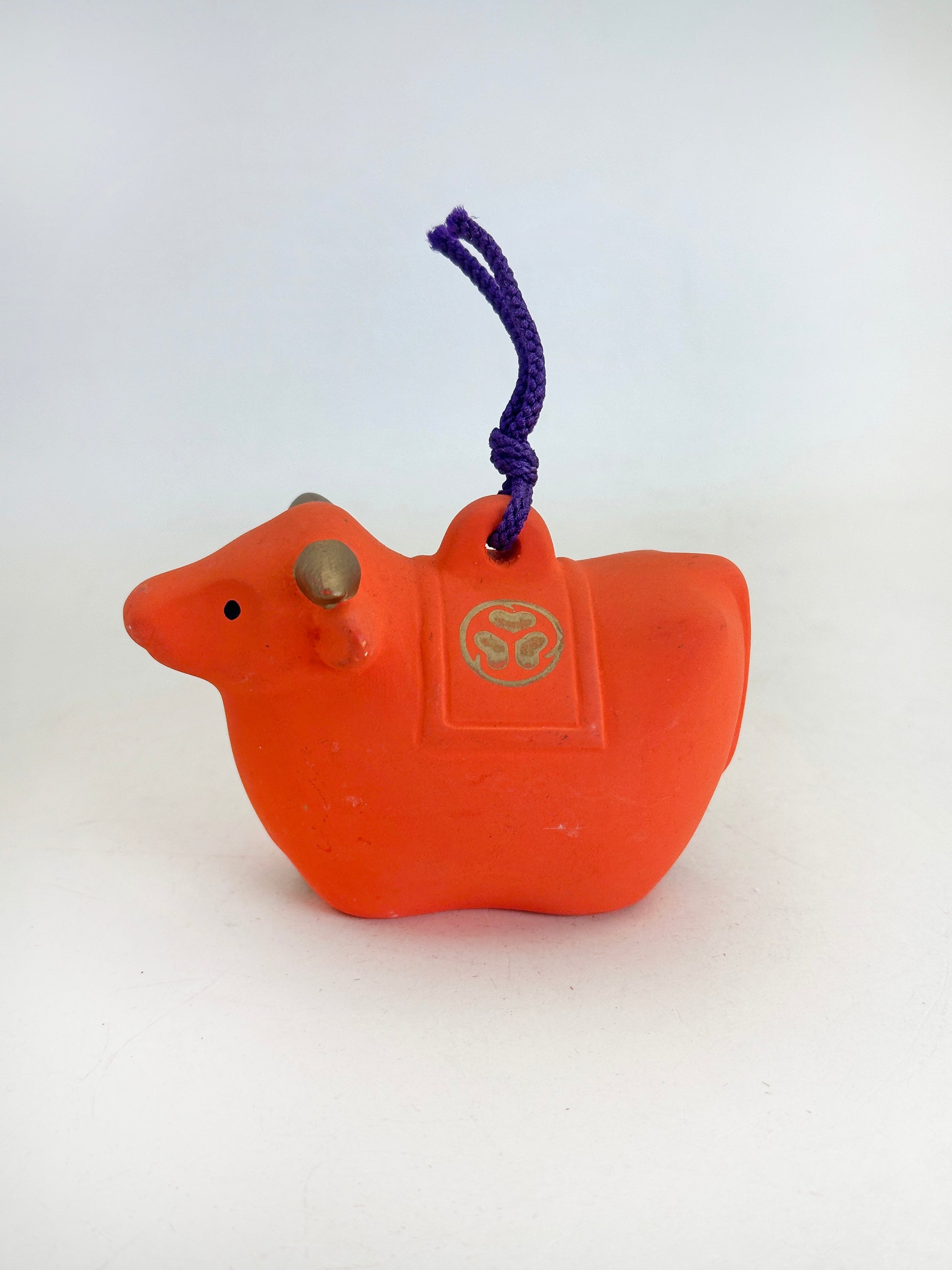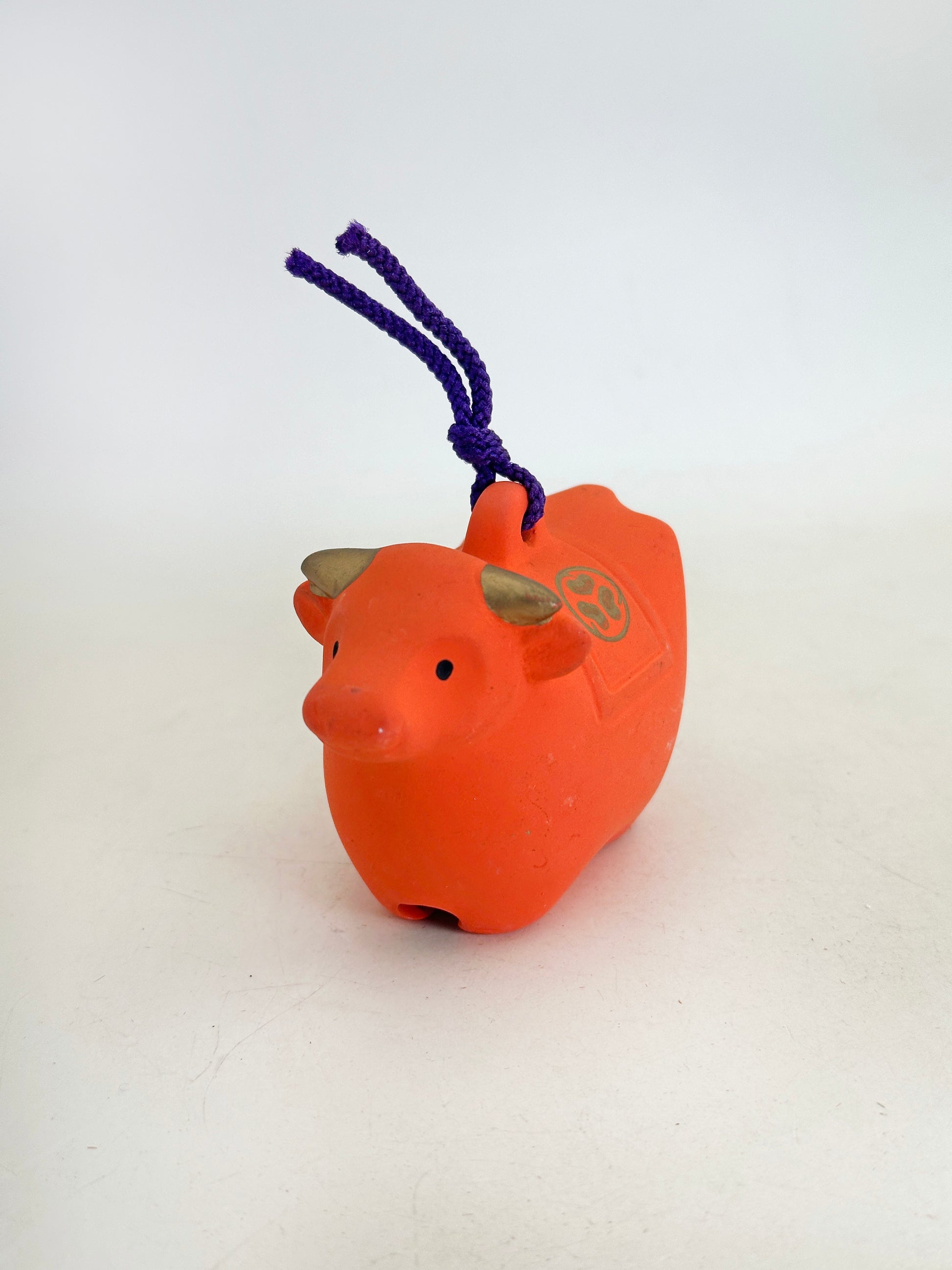 This dorei clay bell takes the form of a stylized cow (ushi / ox), rendered in a bold, auspicious vermilion hue that immediately evokes the sacred atmosphere of Japanese shrines. Its compact, rounded body and gently simplified features give it a warm, approachable presence. A purple cord is threaded through the top, allowing it to be hung as a protective charm.