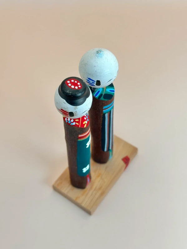 This is a vintage folk toy from Yamaguchi Prefecture (山口県) features a pair of hand-painted wooden dolls representing a traditionally dressed man and woman. Known as 郷土人形 (Kyōdo Ningyō)