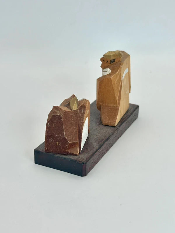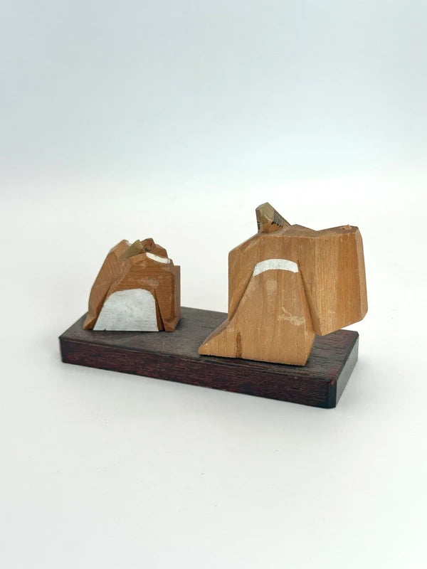 The standing figure is the Tayū (太夫), the lead chanter, wearing a decorative headdress and painted cords. The seated figure is the Sarai (才蔵) or companion/jester, often playing a drum or accompanying the main performer with humorous commentary. They are mounted on a lacquered wooden base with the inscription 三河万歳 (Mikawa Manzai) — referencing a regional variant of this celebratory art from Mikawa Province (modern-day eastern Aichi Prefecture). It's a symbol of Fortune. These figures are emblematic of New Year's luck and household prosperity. The ittōbori carving style captures the spirit of Japanese mingei (folk craft) — valuing handmade imperfection and raw, honest beauty.