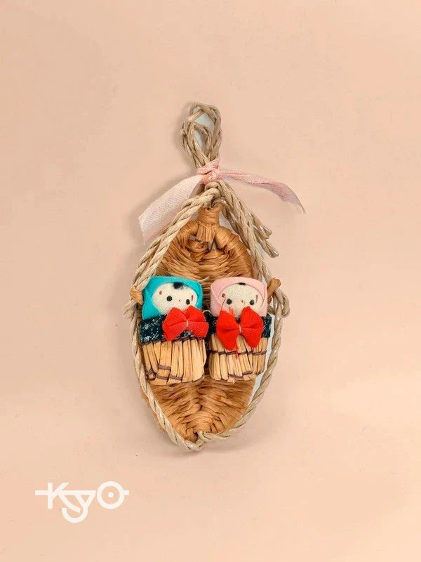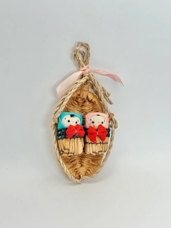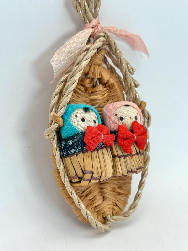 A vintage handcrafted omiyage comes from the serene highlands of Kirigamine (霧ヶ峰) in Nagano Prefecture, Japan, a region known for its scenic beauty, cool climate, and rich cultural heritage. The craft features a miniature pair of waraji (草鞋) traditional Japanese straw sandals, skillfully woven from natural fibers. These woven straw sandals are known as waraji, historically worn by farmers, monks, and travelers in Japan. Waraji are symbolic of hard work, perseverance, and safe travels. Tucked inside the sandals are two charming hand-sewn dolls, each wearing a small hood (one in blue, one in pink) and dressed in traditional-style attire with a red bow, symbolizing protection, good fortune, and companionship. Size: 14 x 6 x 3cm