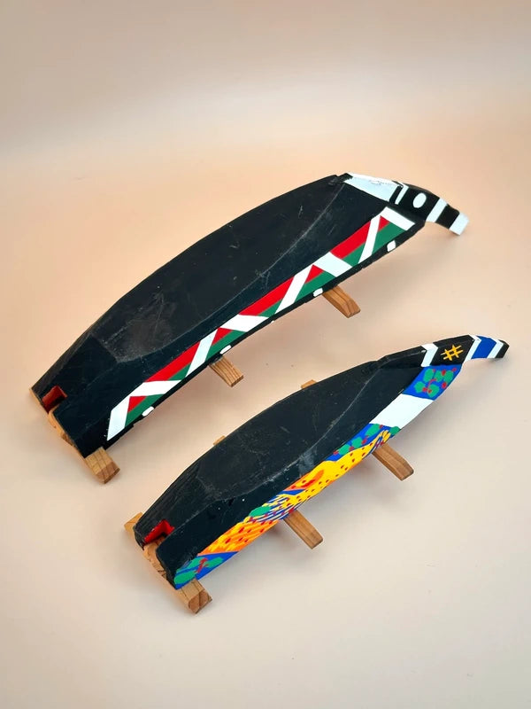 This toy is a miniature, stylized representation of a traditional whaling boat used in the Kumano region, which had a historical whaling culture. The boats are often decorated with bright colors, tairyō-bata (big catch flags), and sometimes whale figures, symbolizing both the hunting tradition and the wish for prosperity and abundance.